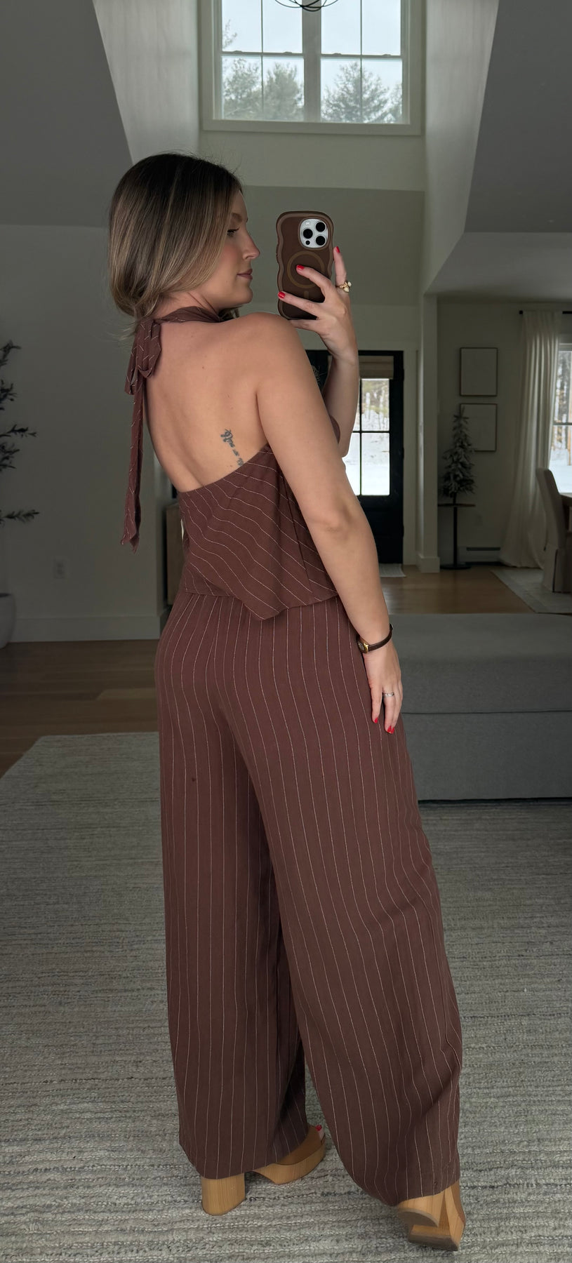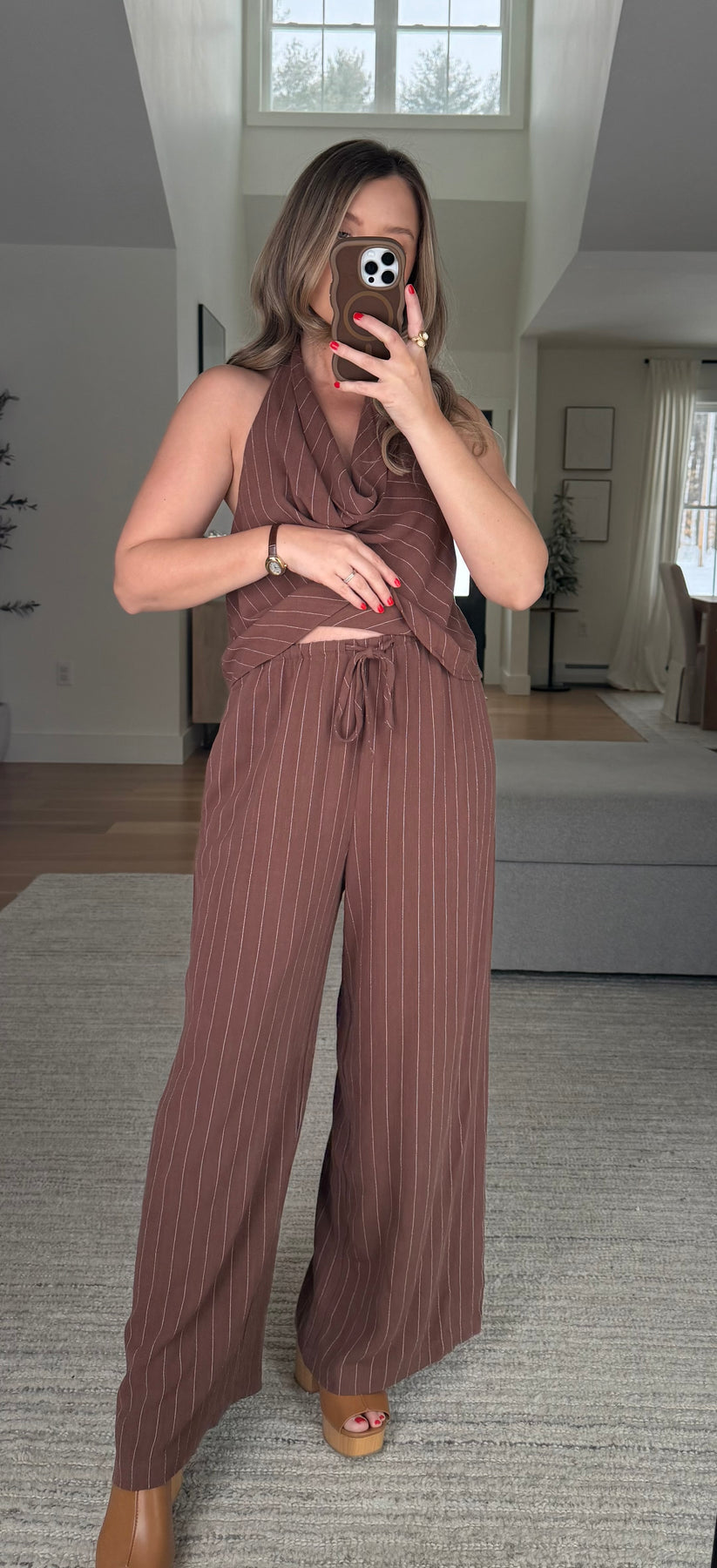 Two piece set featuring halter cowl neckline top with adjustable tie and high waisted wide leg flowy pants with elastic waist, functional drawstring and side pockets