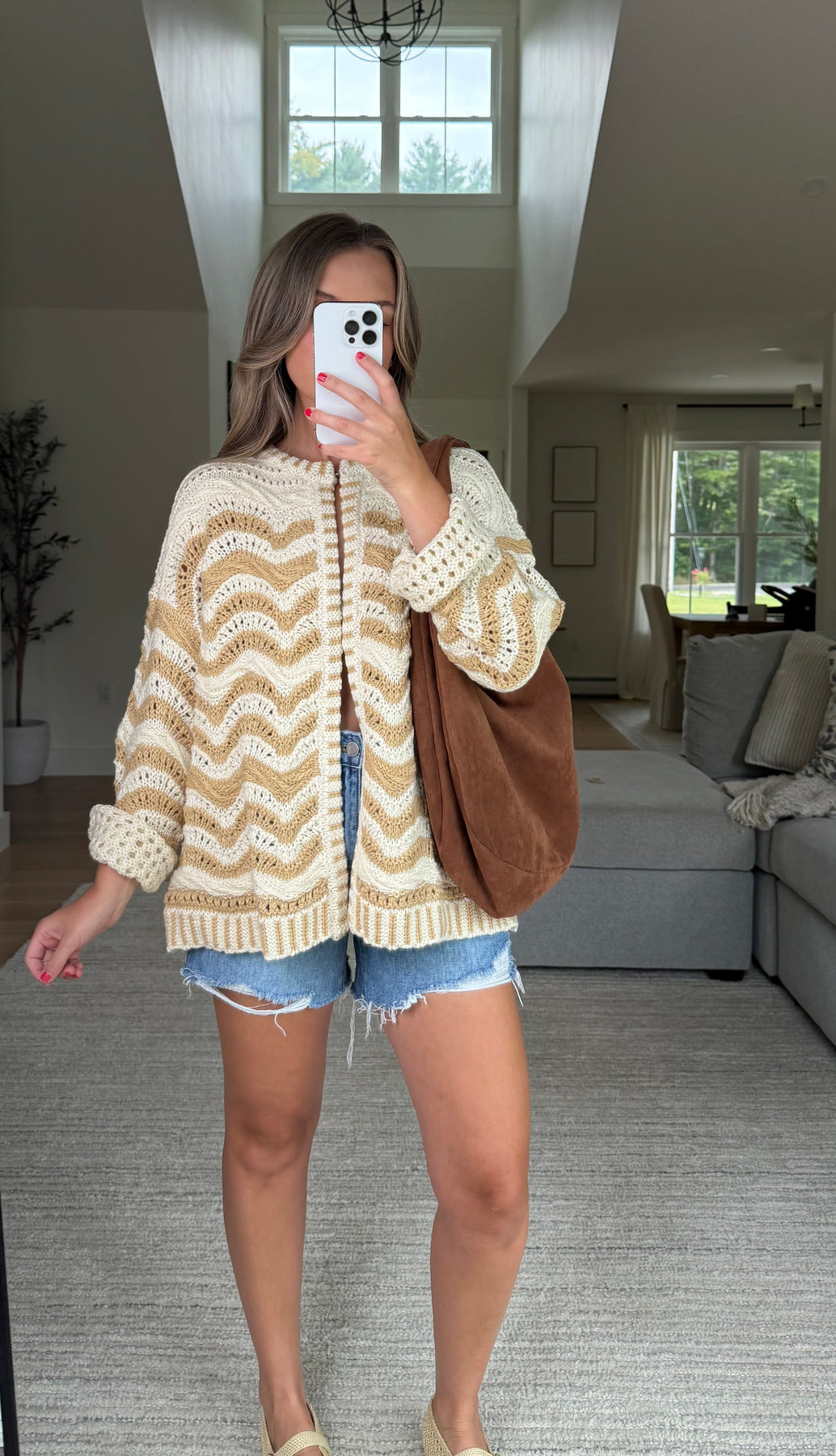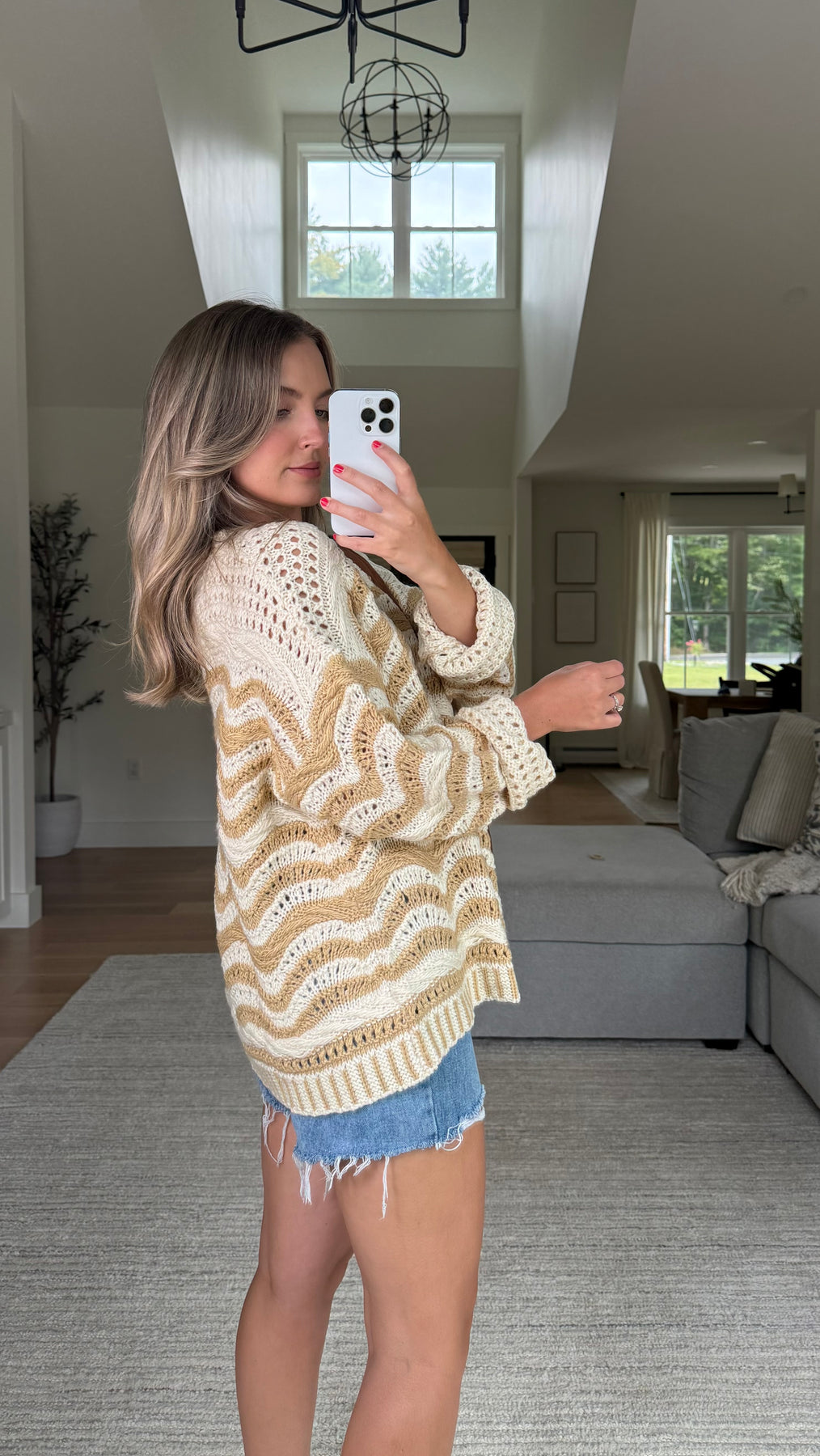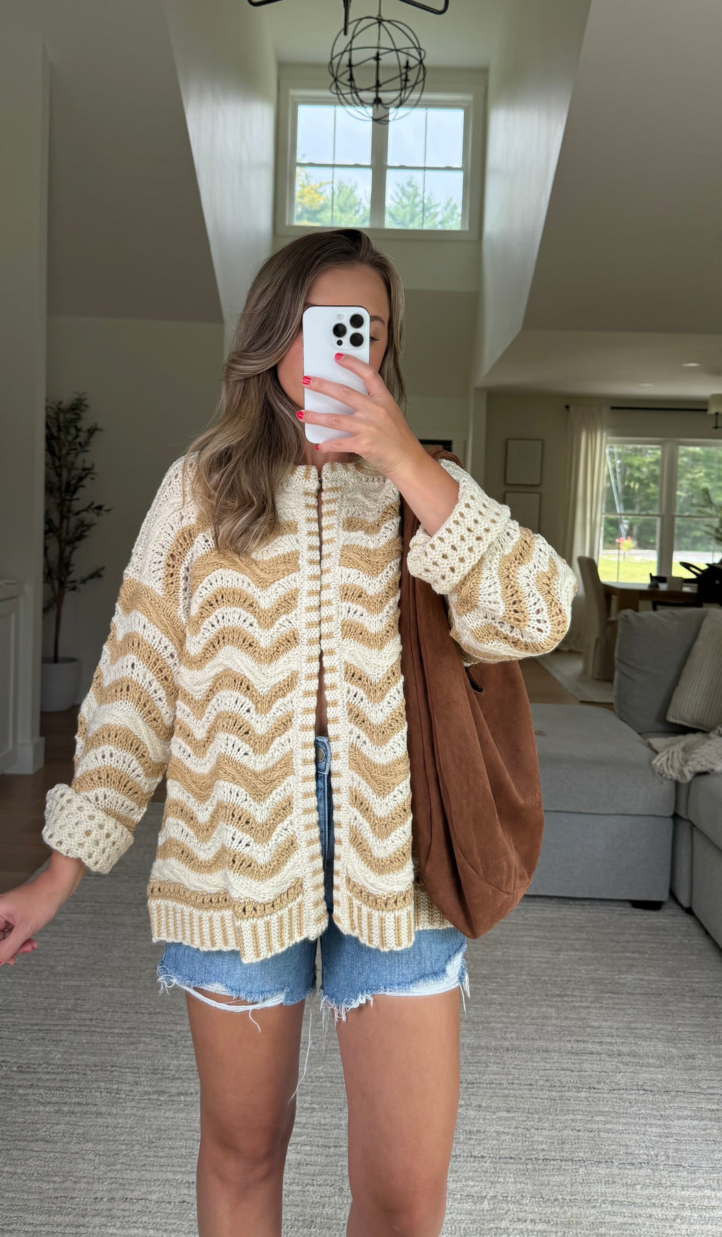 Loose fitting crochet wave pattern knit cardigan with double clasp front closure