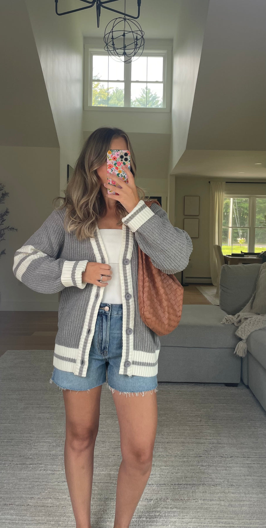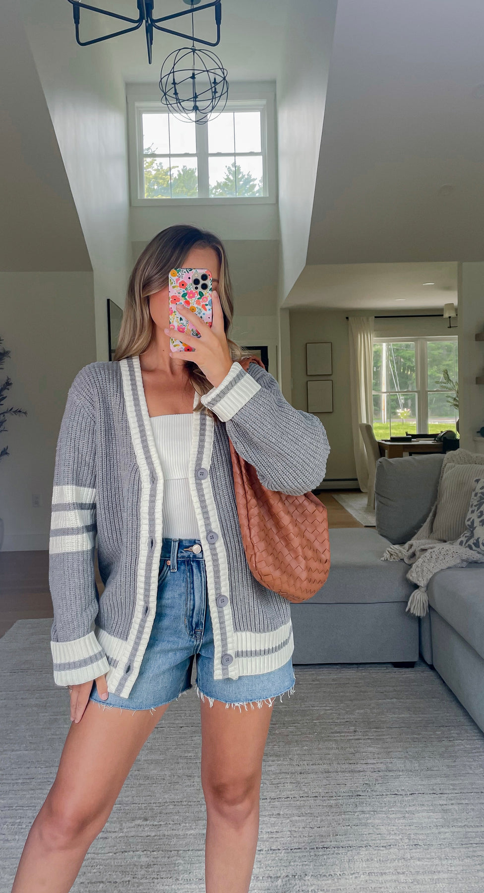Grey and white stripe varsity cardigan with functional button front and a chunky oversized fit