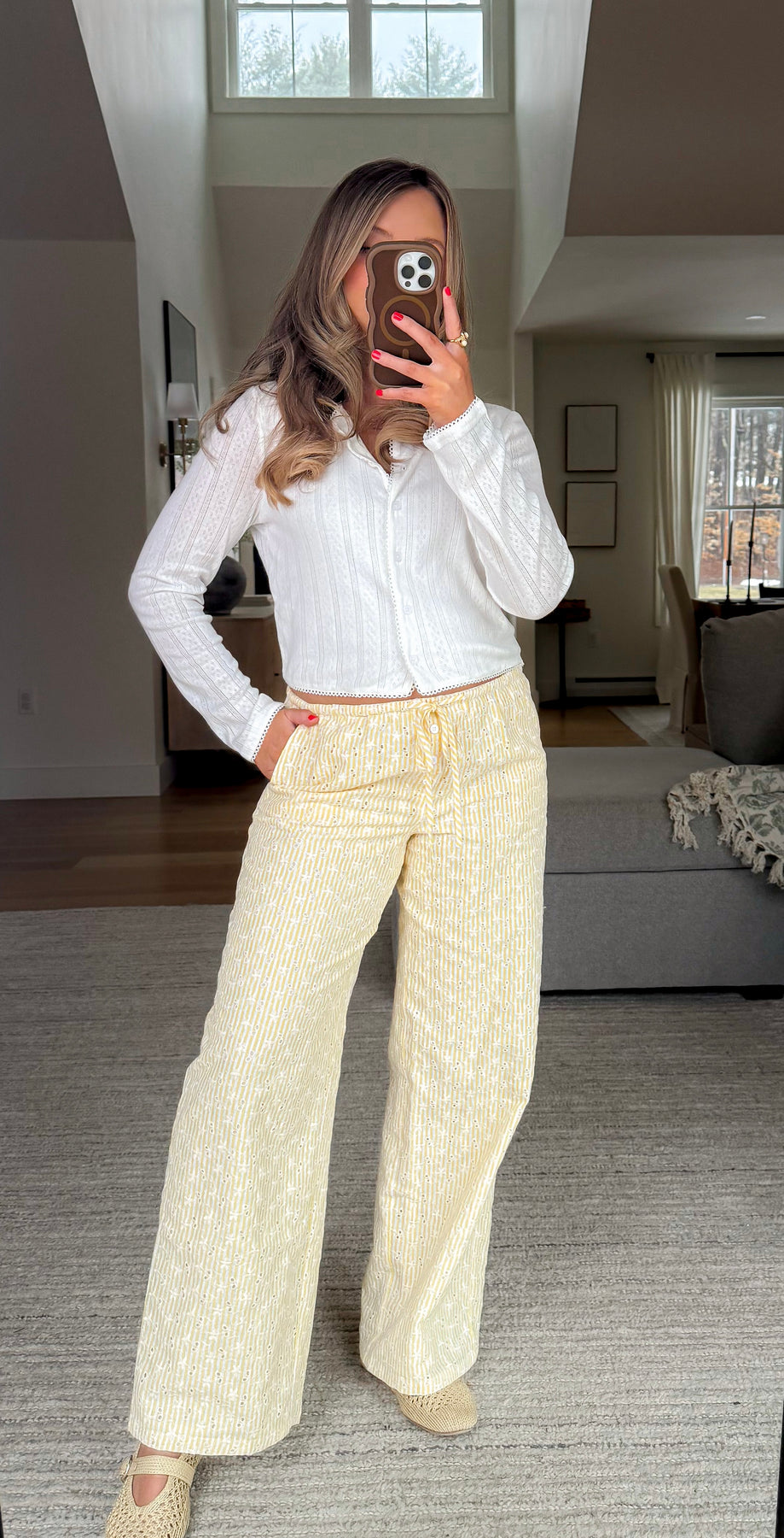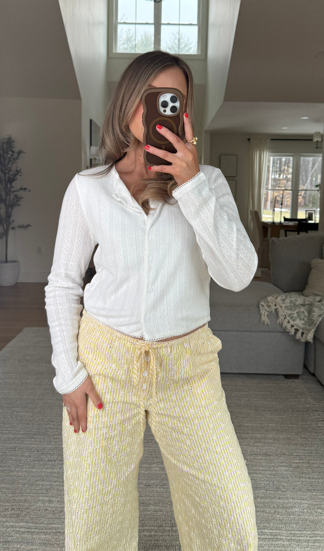 Dainty lace trim pointelle knit with button up front, sheer sleeve and a slightly cropped fit