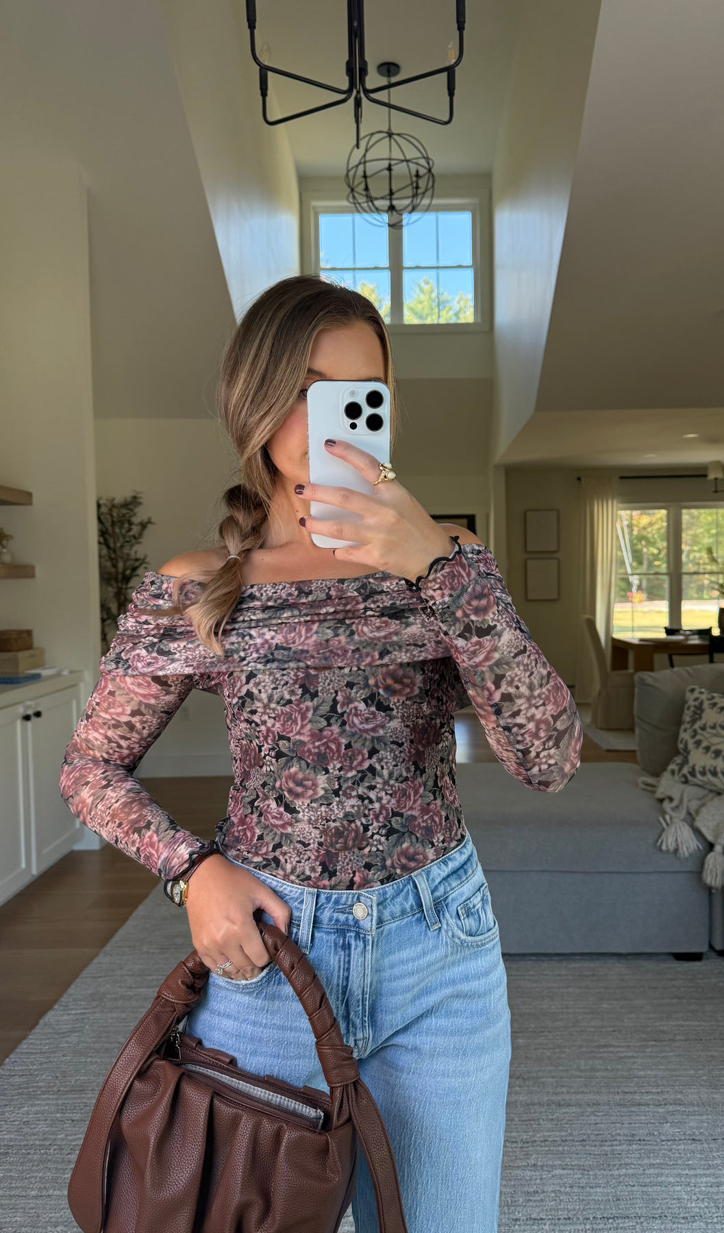 Floral off the shoulder mesh bodysuit with mesh overlay
