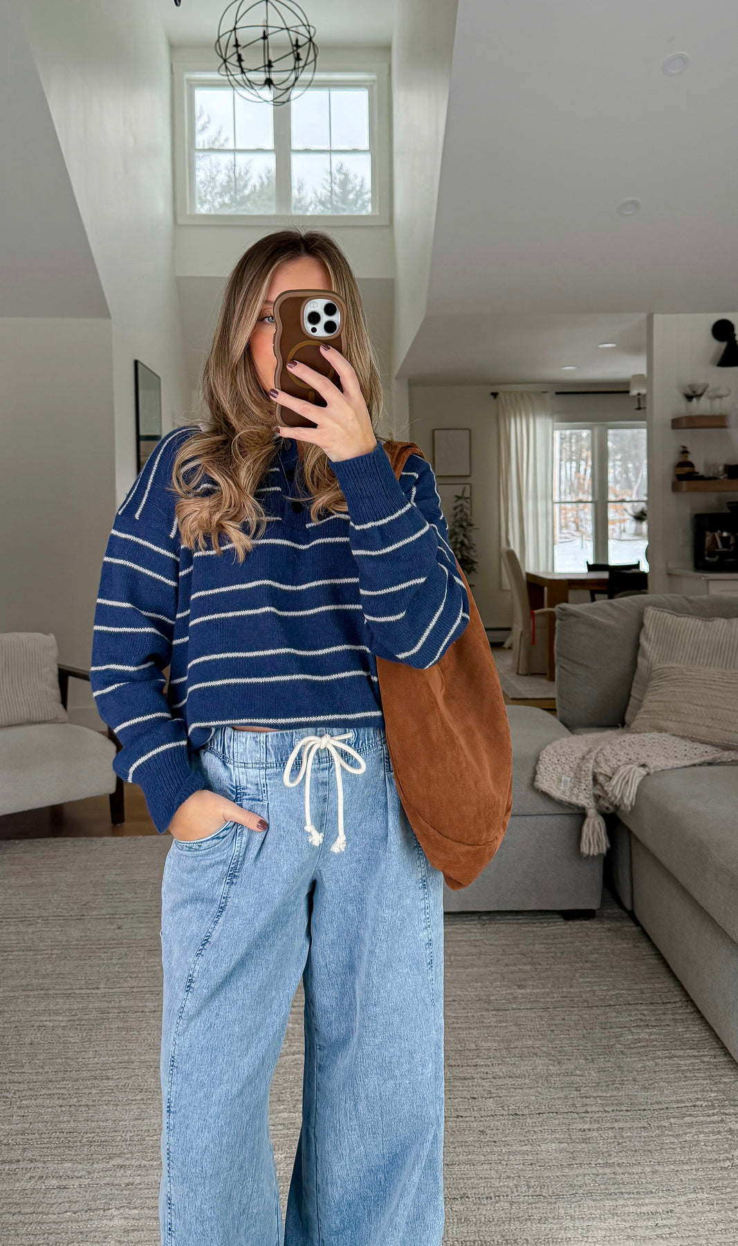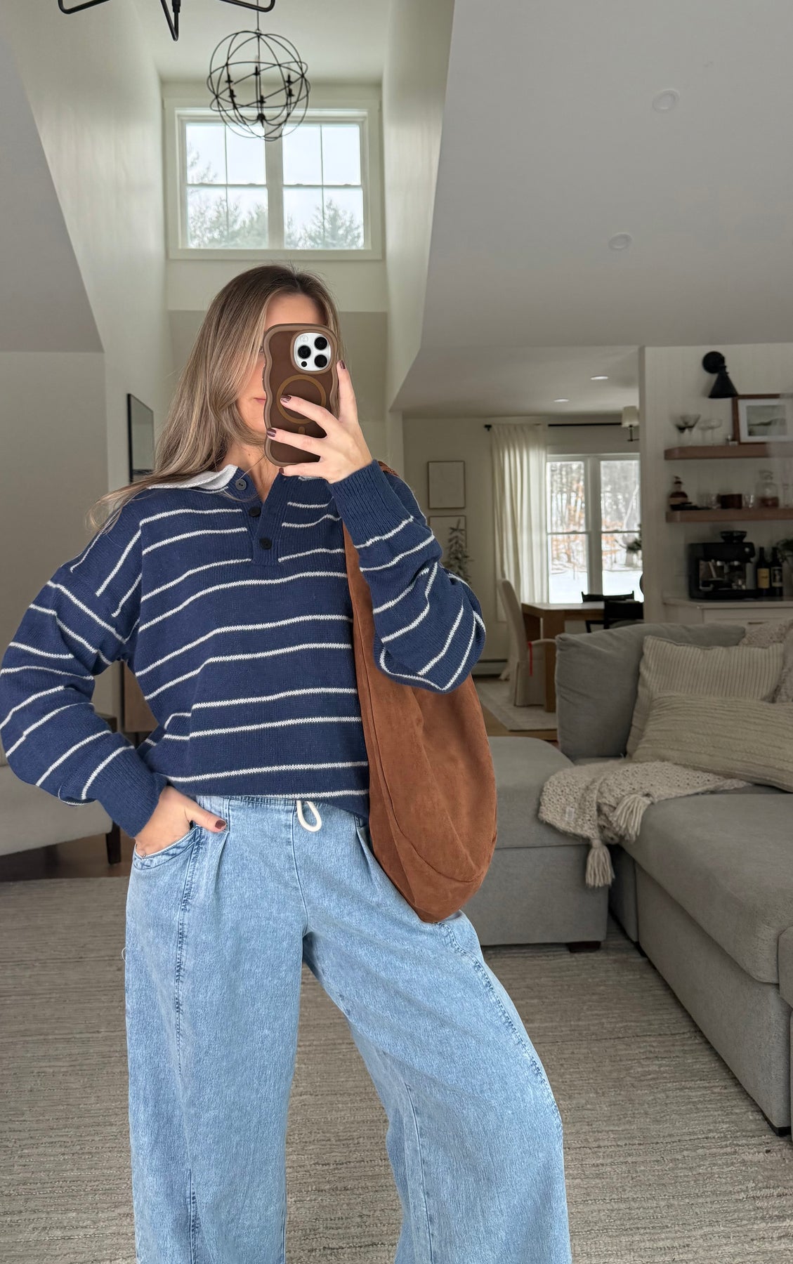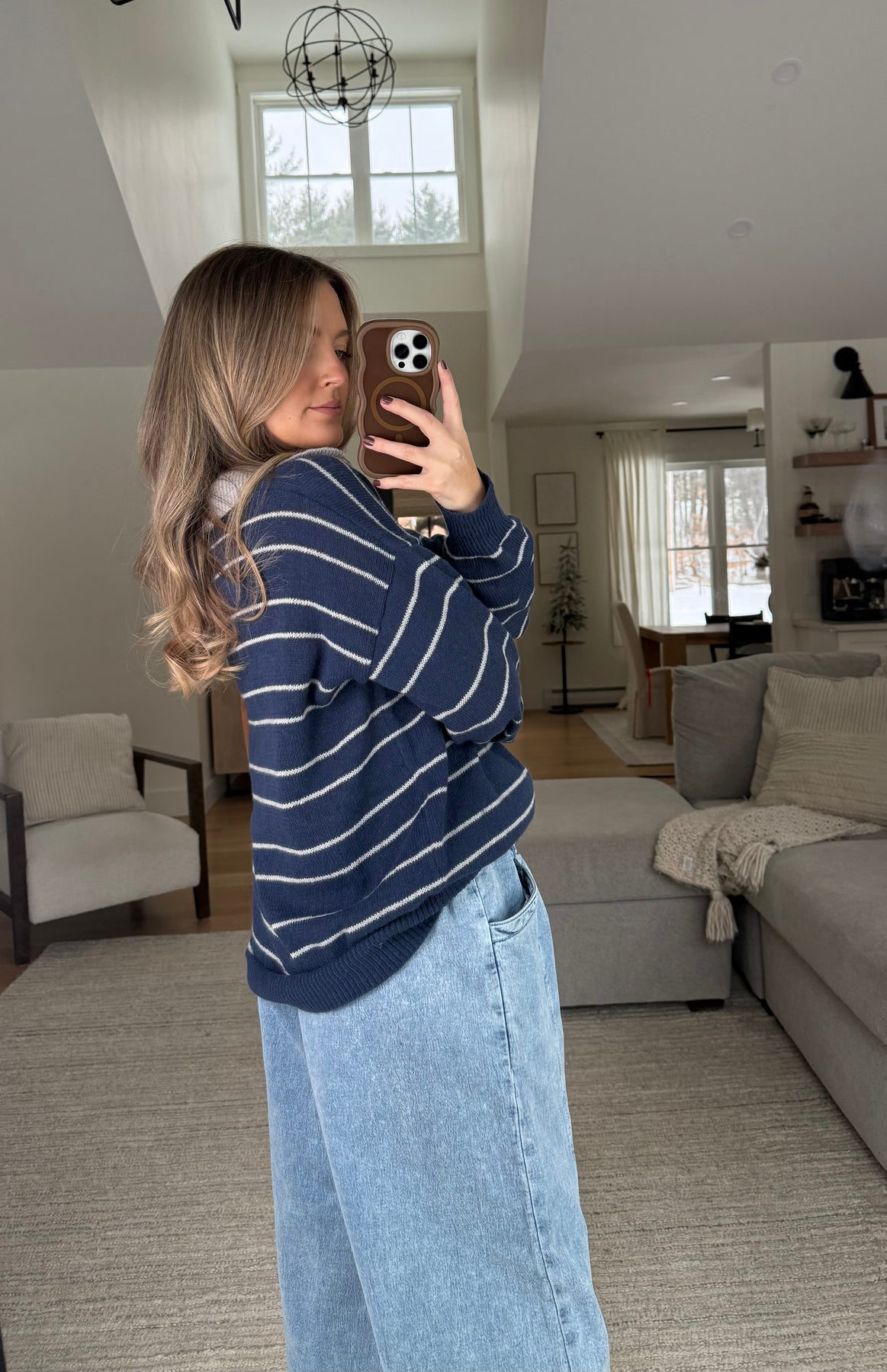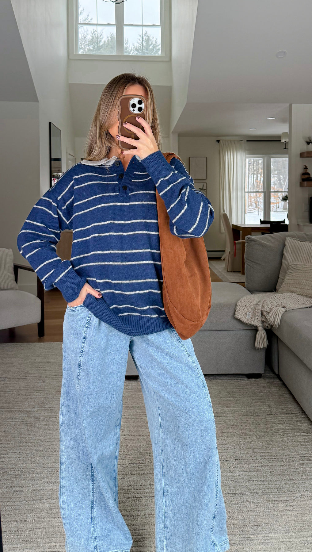 Oversized striped lightweight knit with collar neckline and henley style button front detail