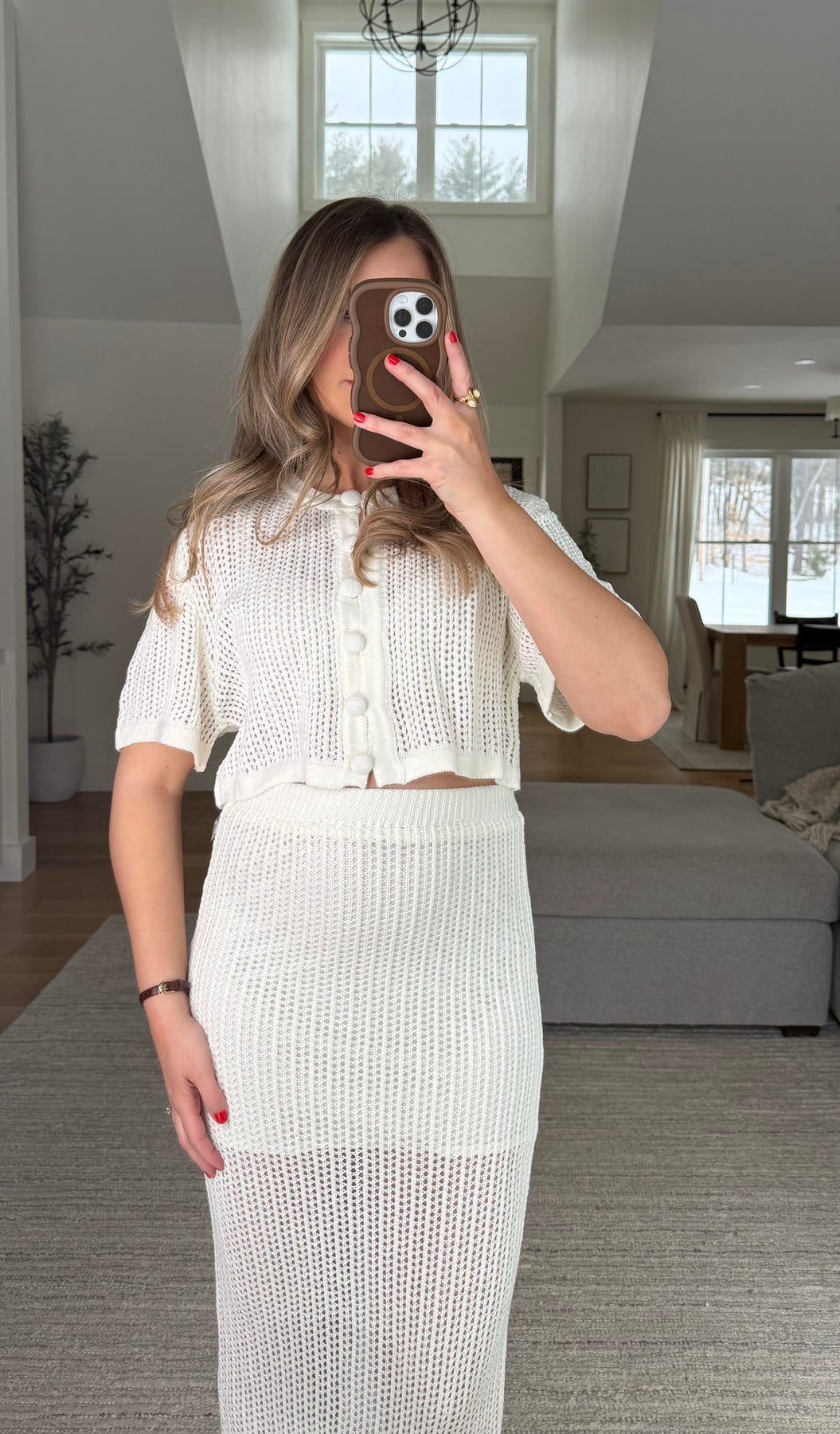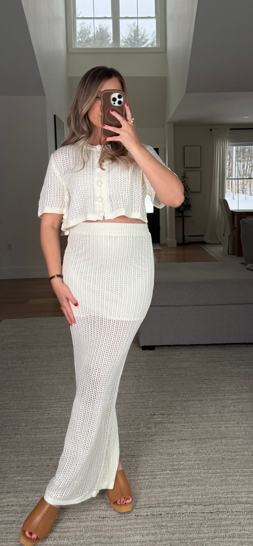 Two piece set featuring crochet cropped short sleeve top with button front and high waist partially lined crochet skirt with slit in back