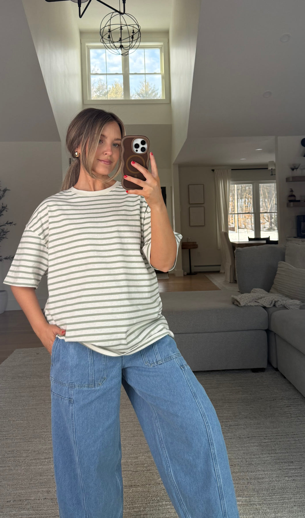 Oversized boxy fit crew neck tshirt with sage stripes