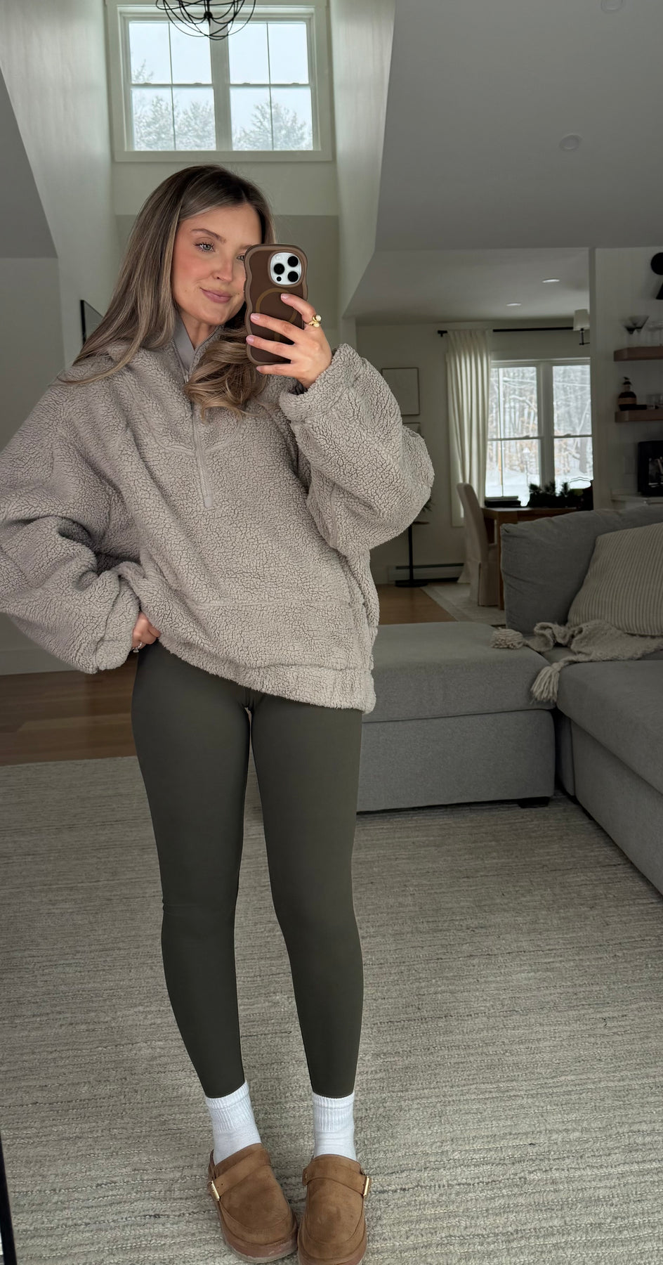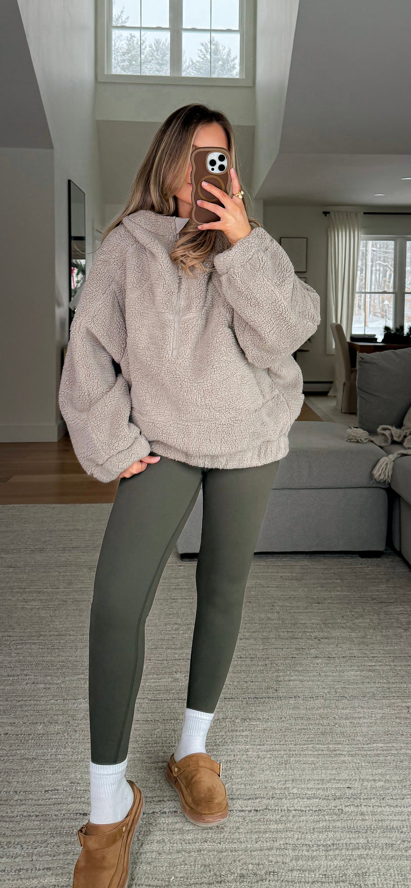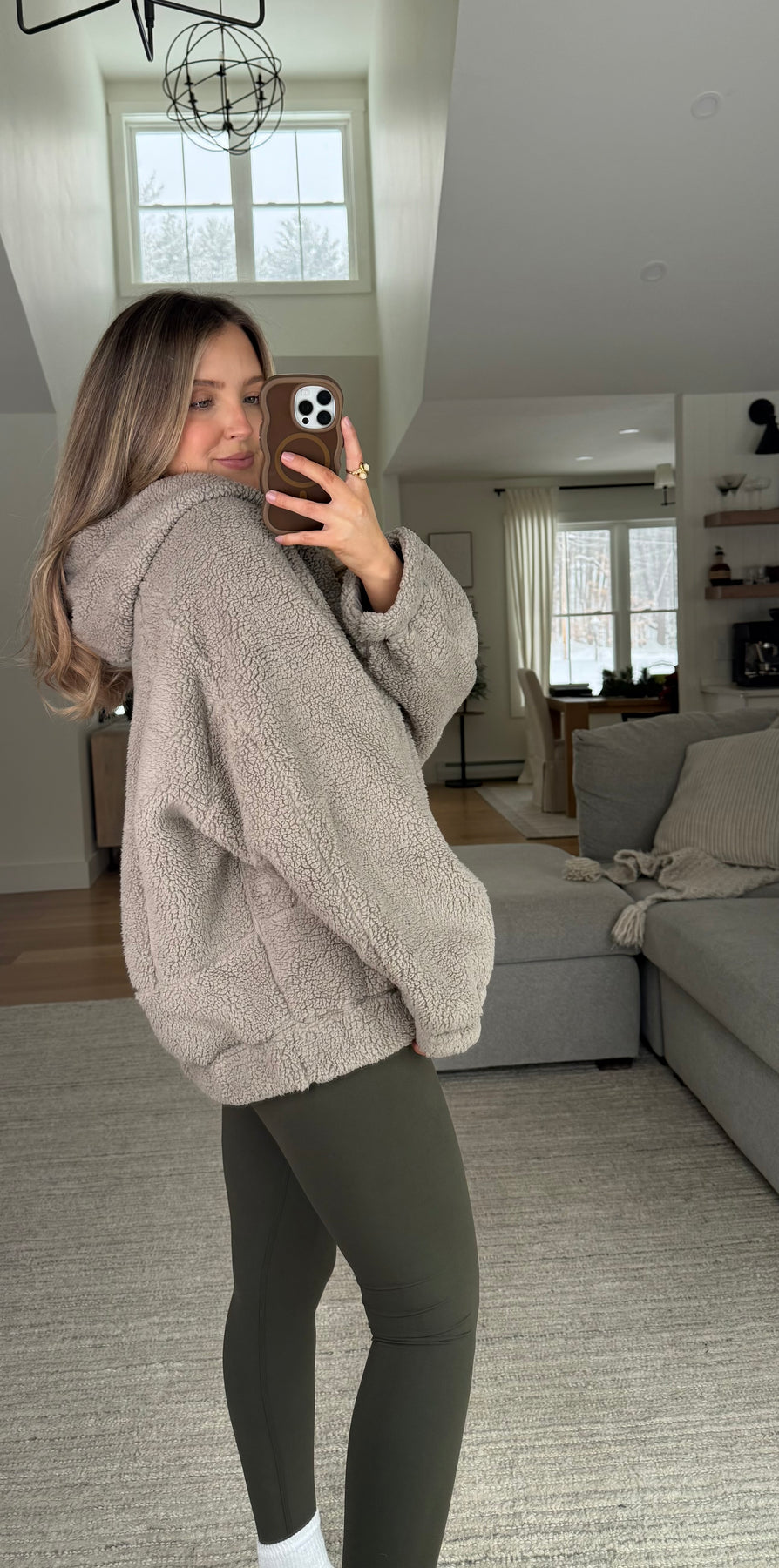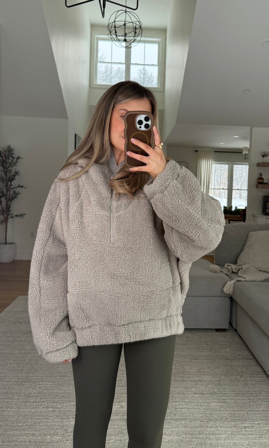 Oversized cozy quarter zip sherpa pullover with hood and side pockets with zipper closure
