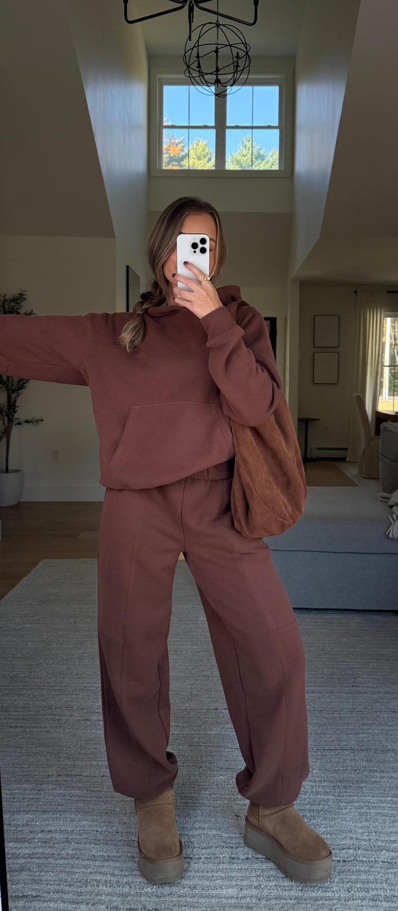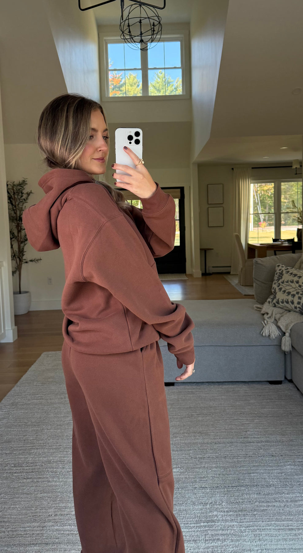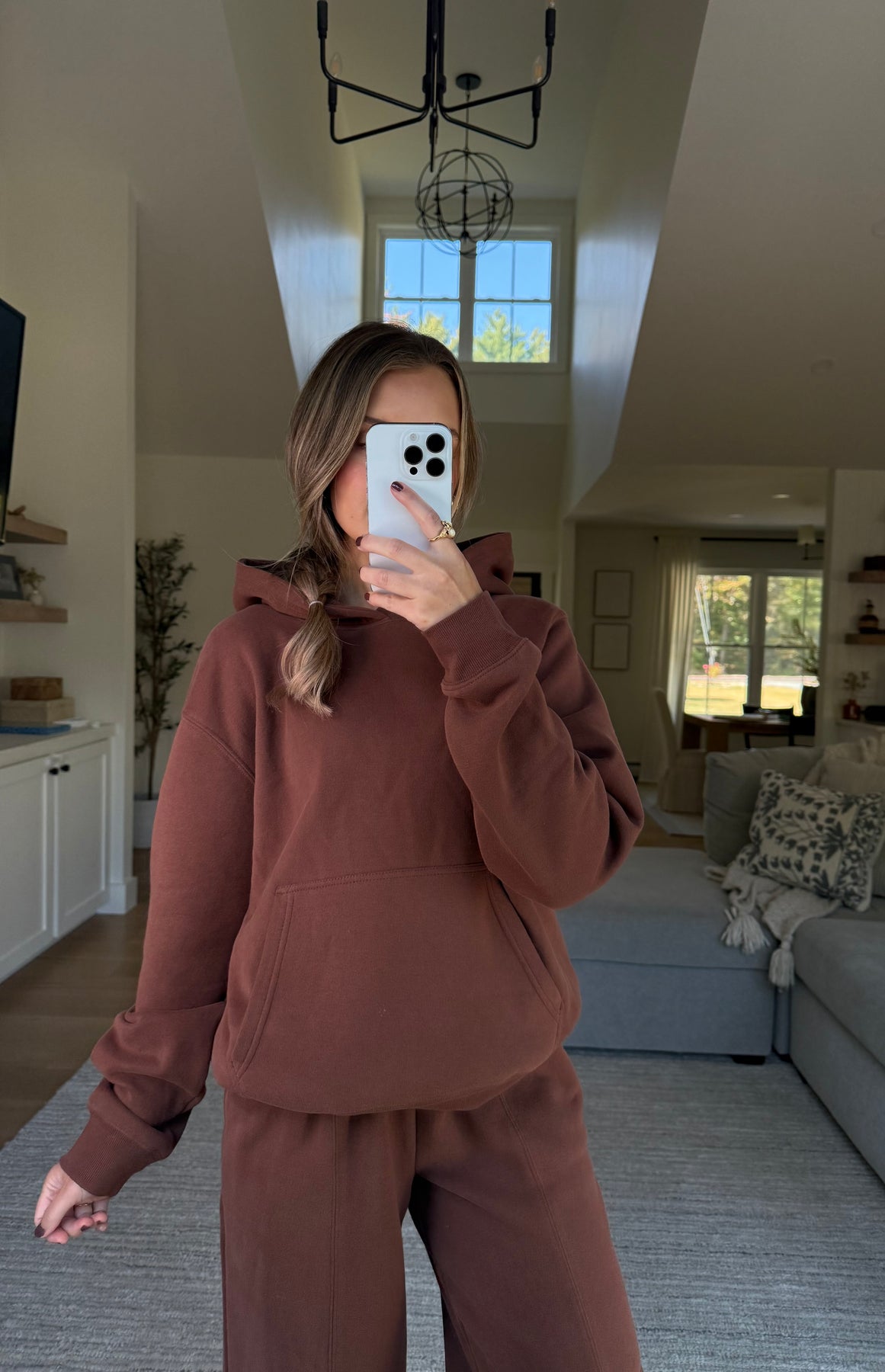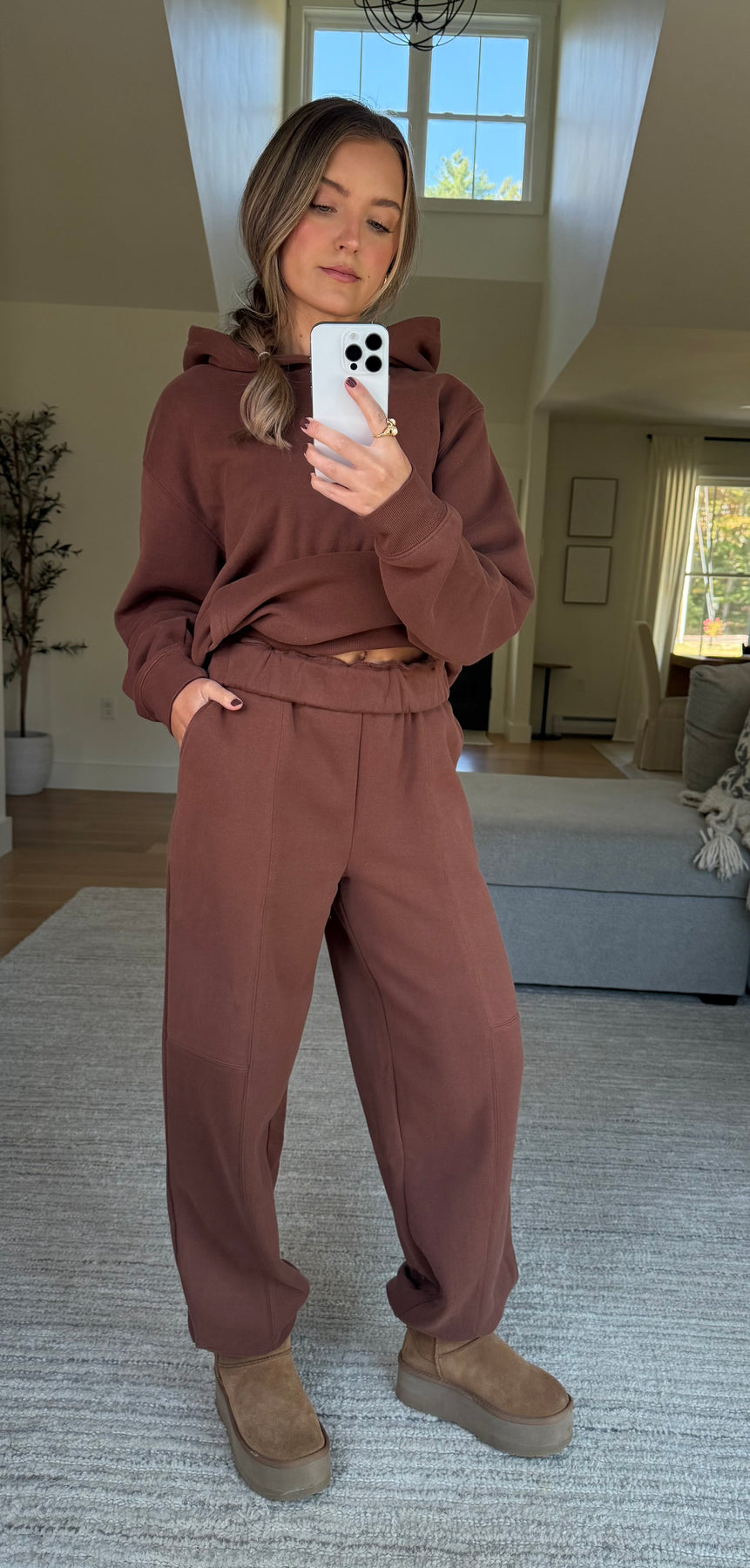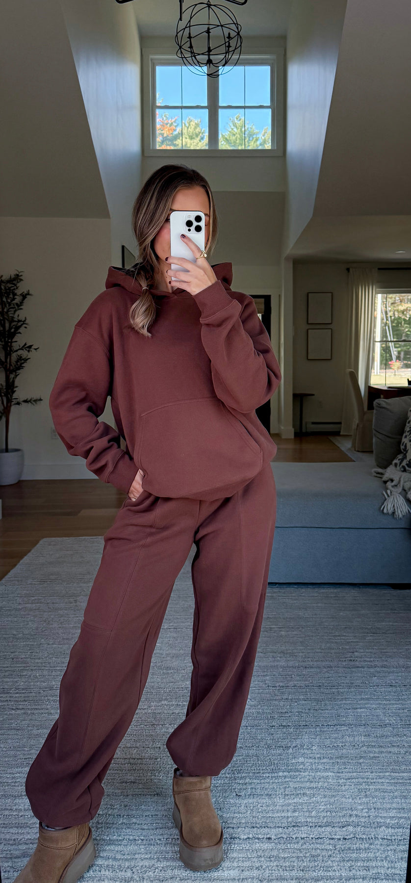 Two piece set featuring hooded sweatshirt with kangaroo front pocket and high waisted elastic waist jogger style sweatpants with pockets