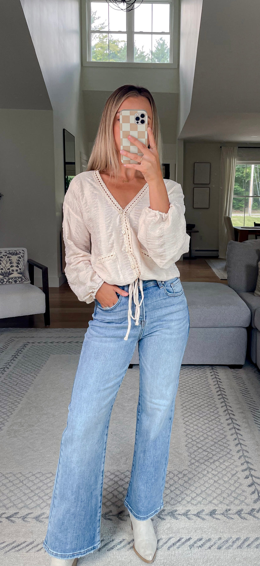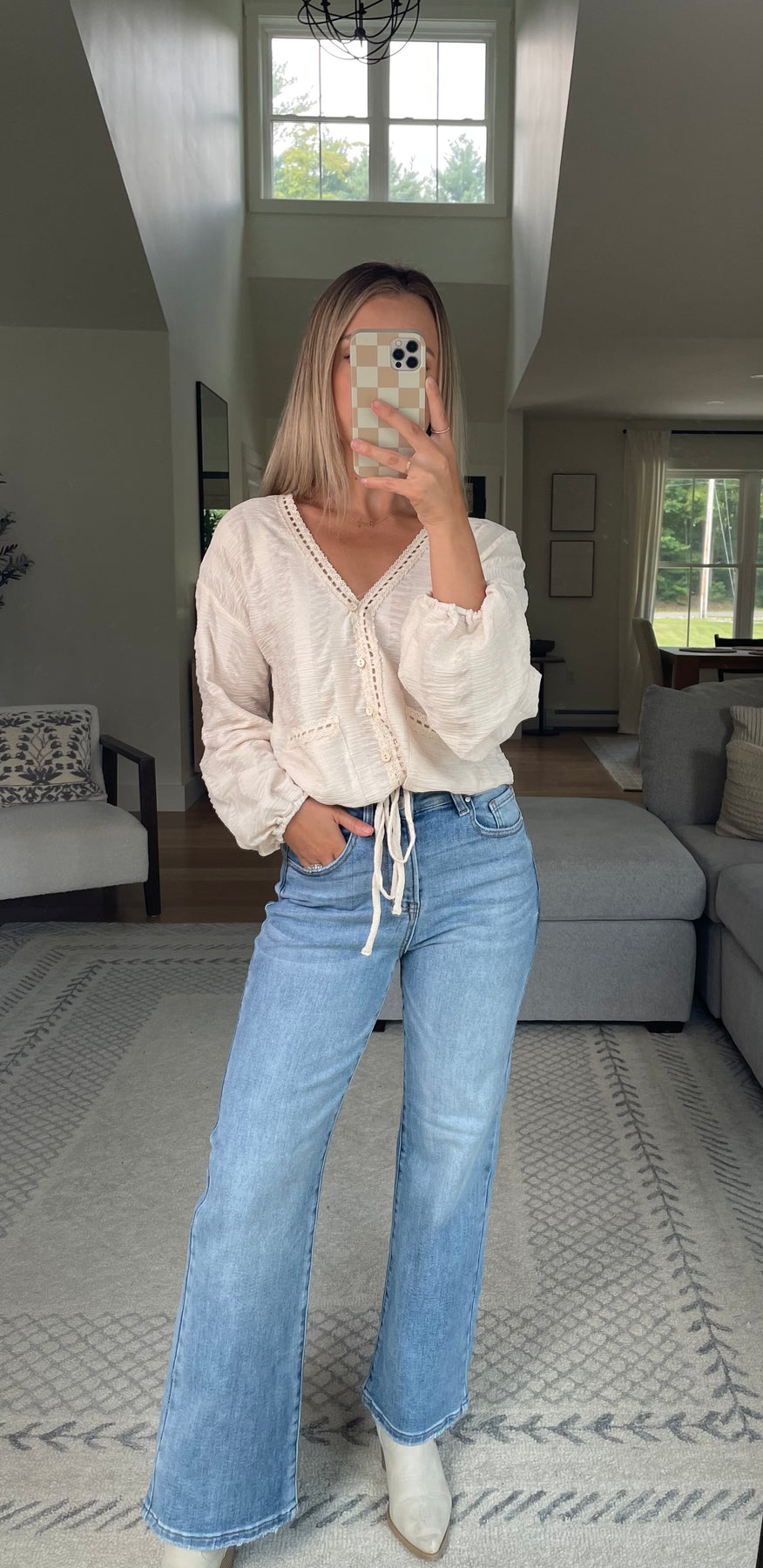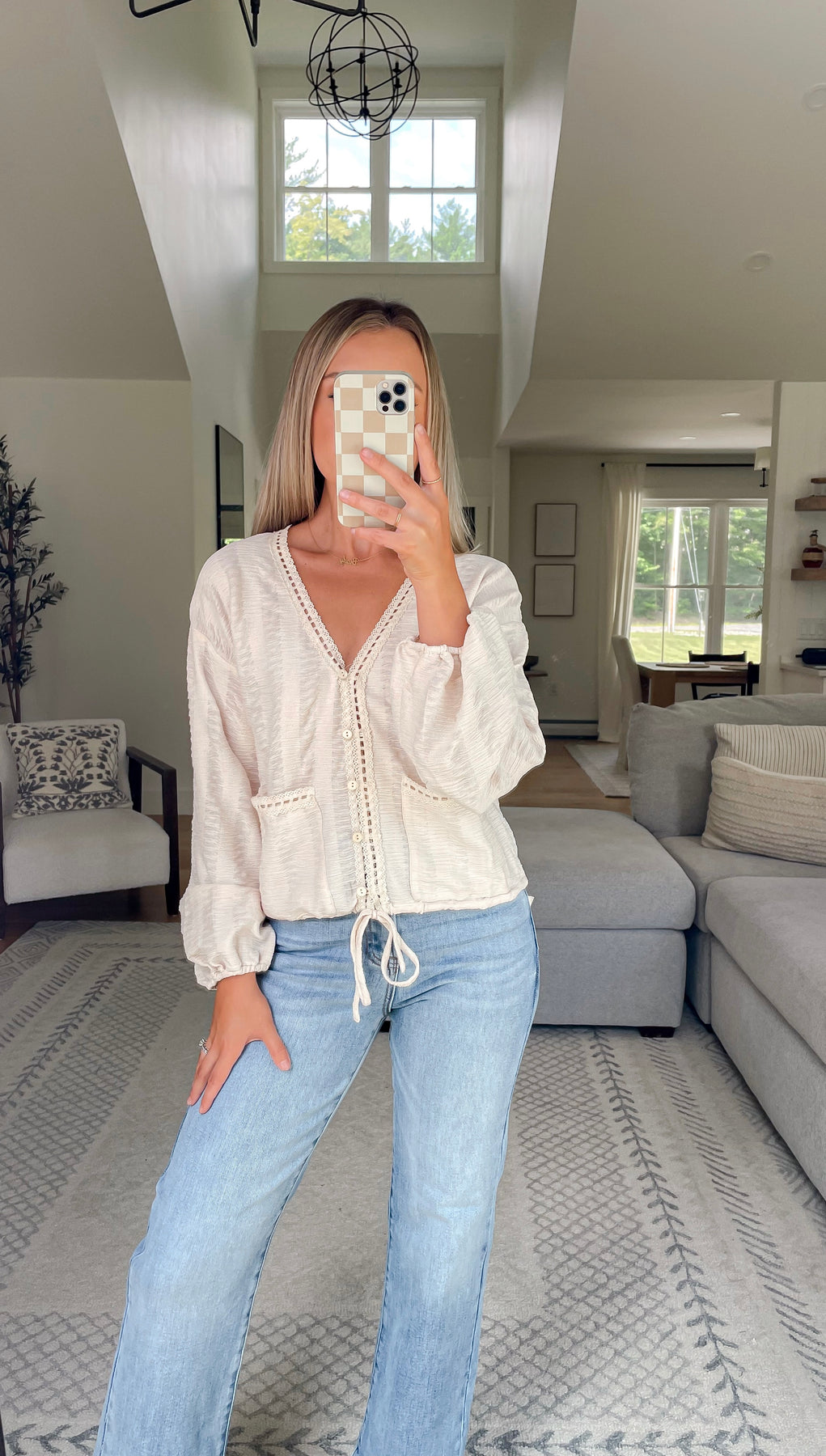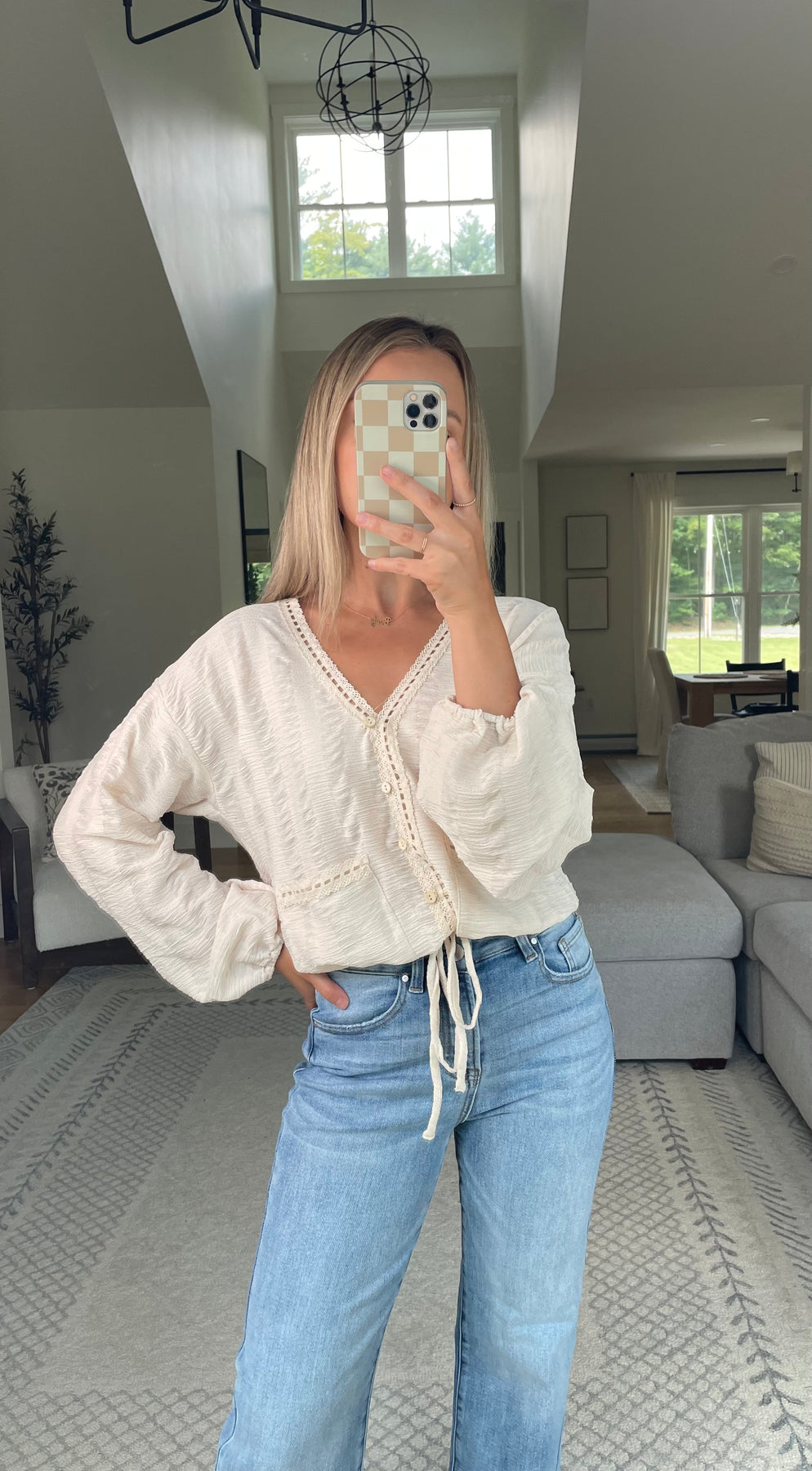 Lightweight v-neckline lace trim top with functional front buttons and adjustable waist tie