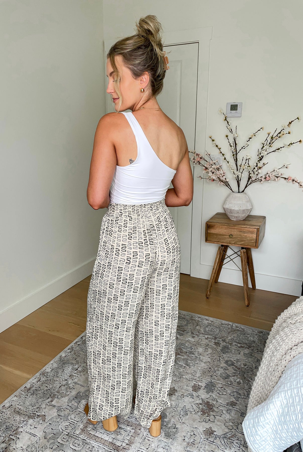 Wide leg abstract printed pants with side pockets and smocked elastic waistband
