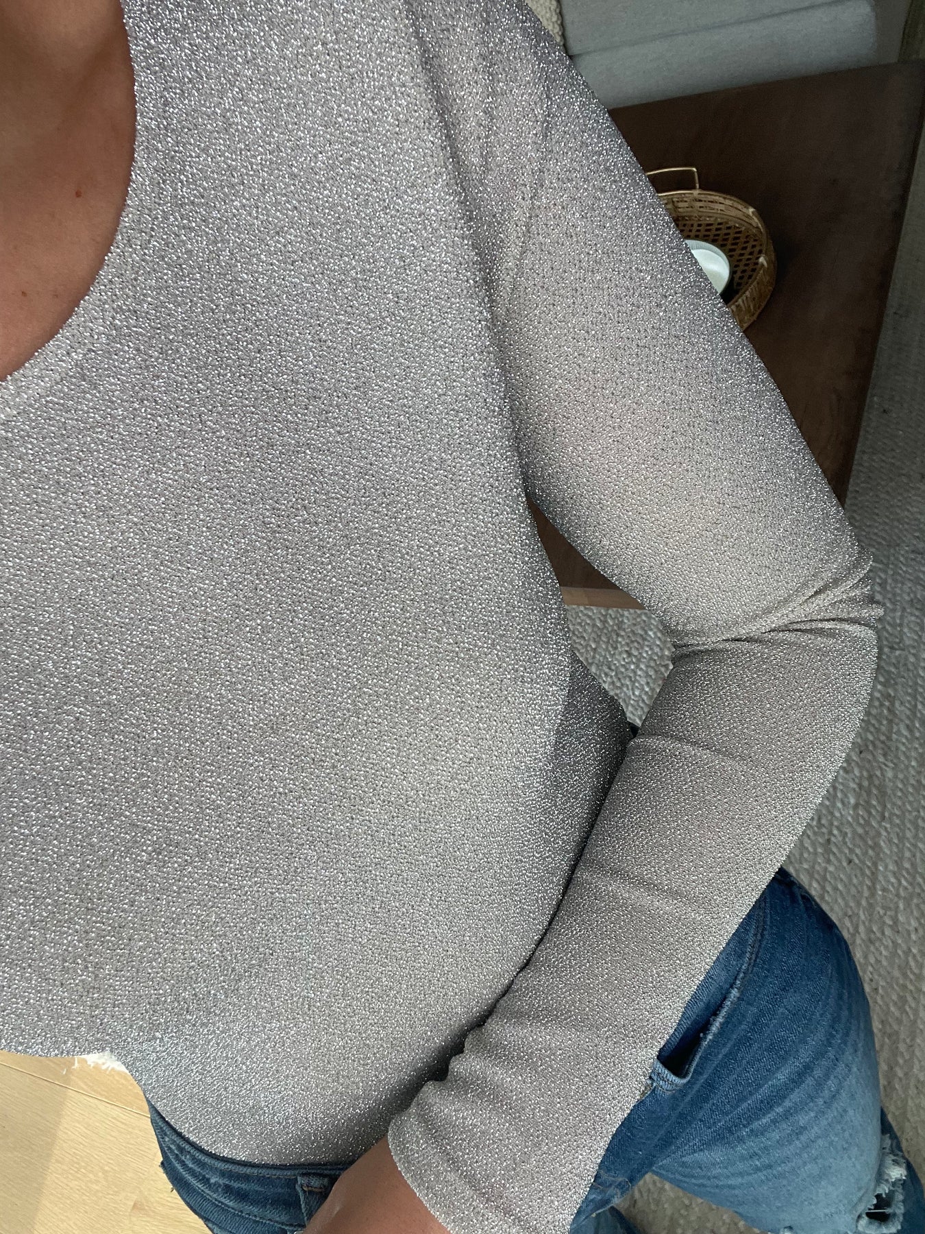 Shimmer open back bodysuit with fitted sleeve, crew neckline, and thong button with double button closure
