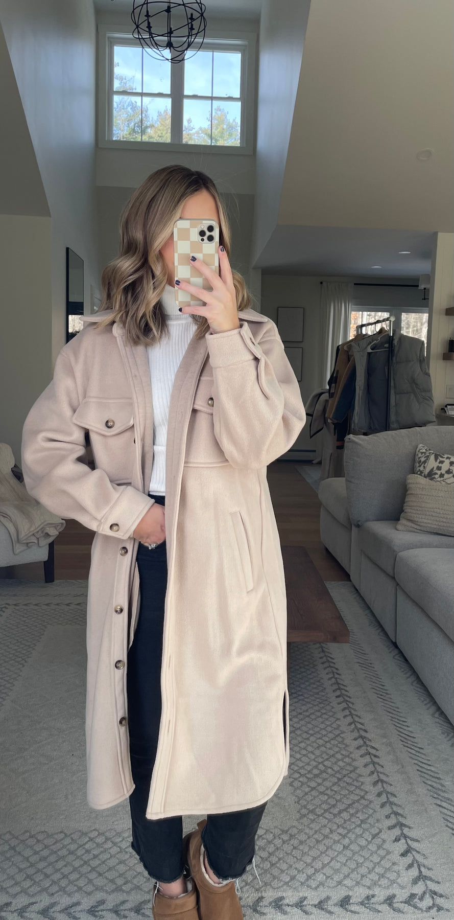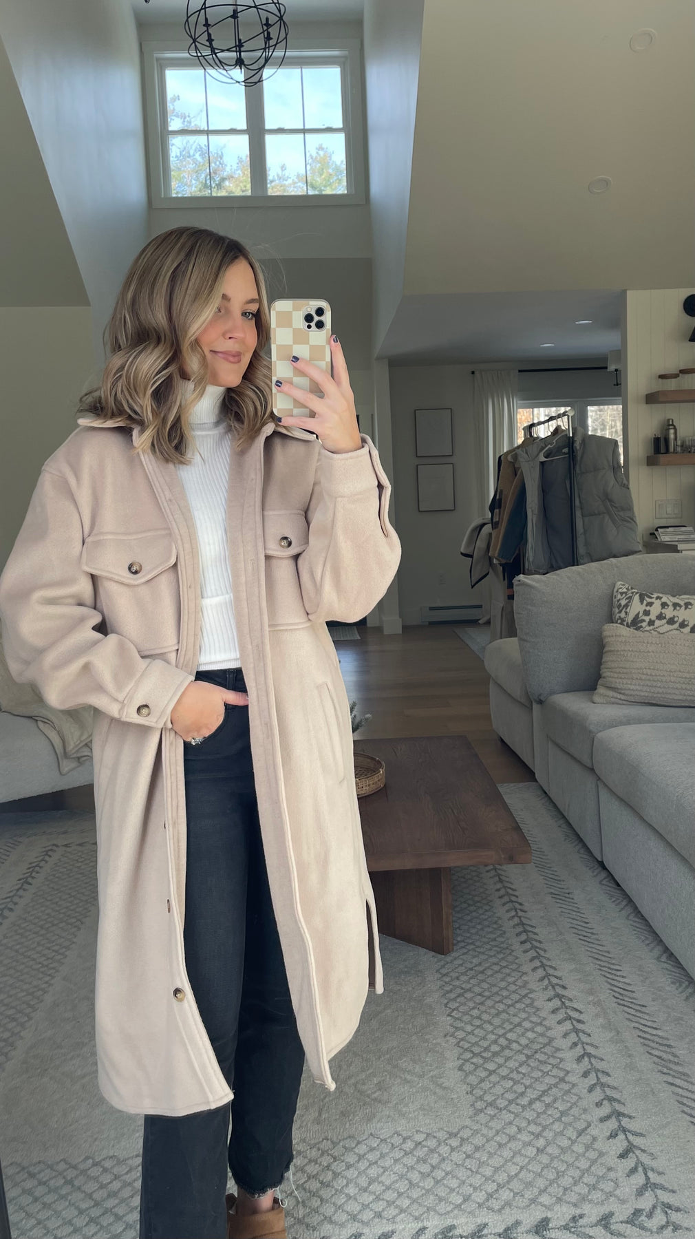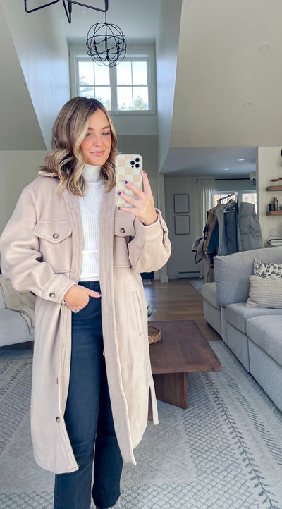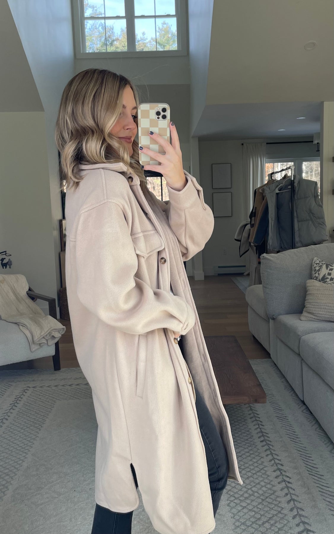 Oversized longline shacket with side slit detail, side pockets and button up front