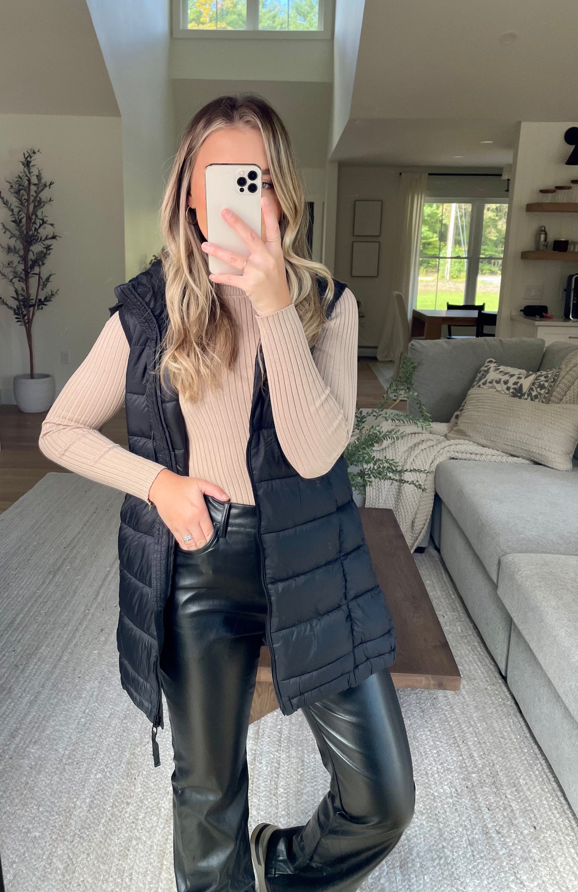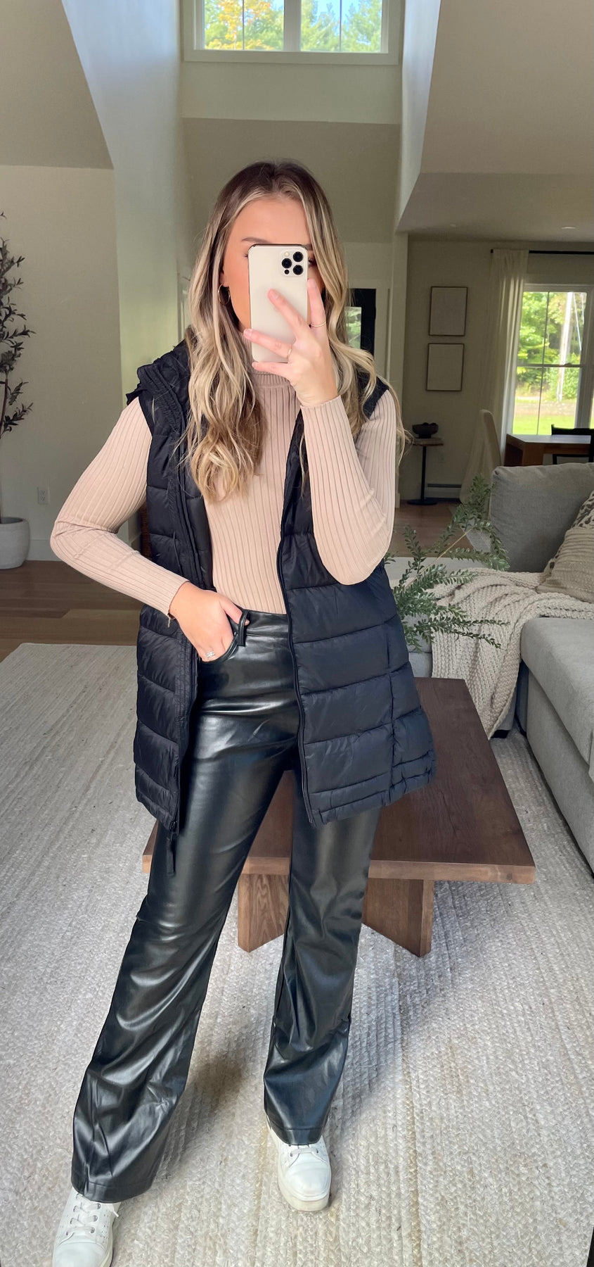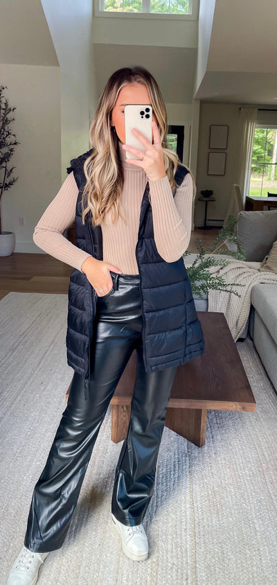 Slim longline puffer vest with hood, side pockets, and front zipper closure- adjustable button hem