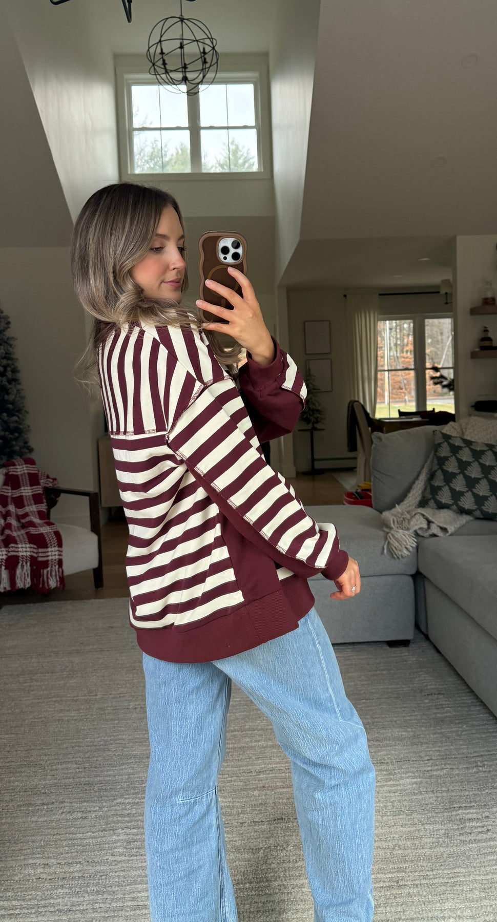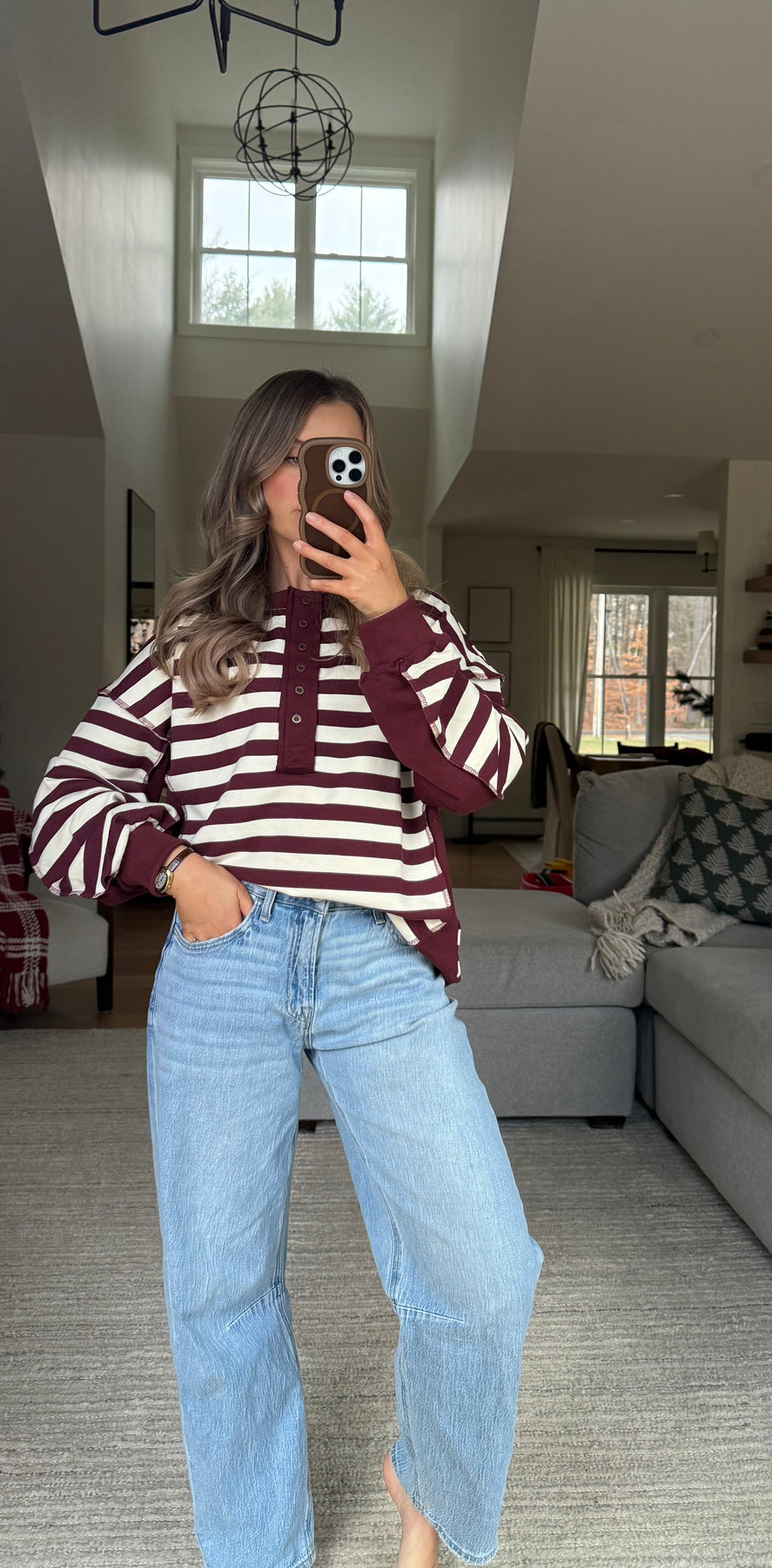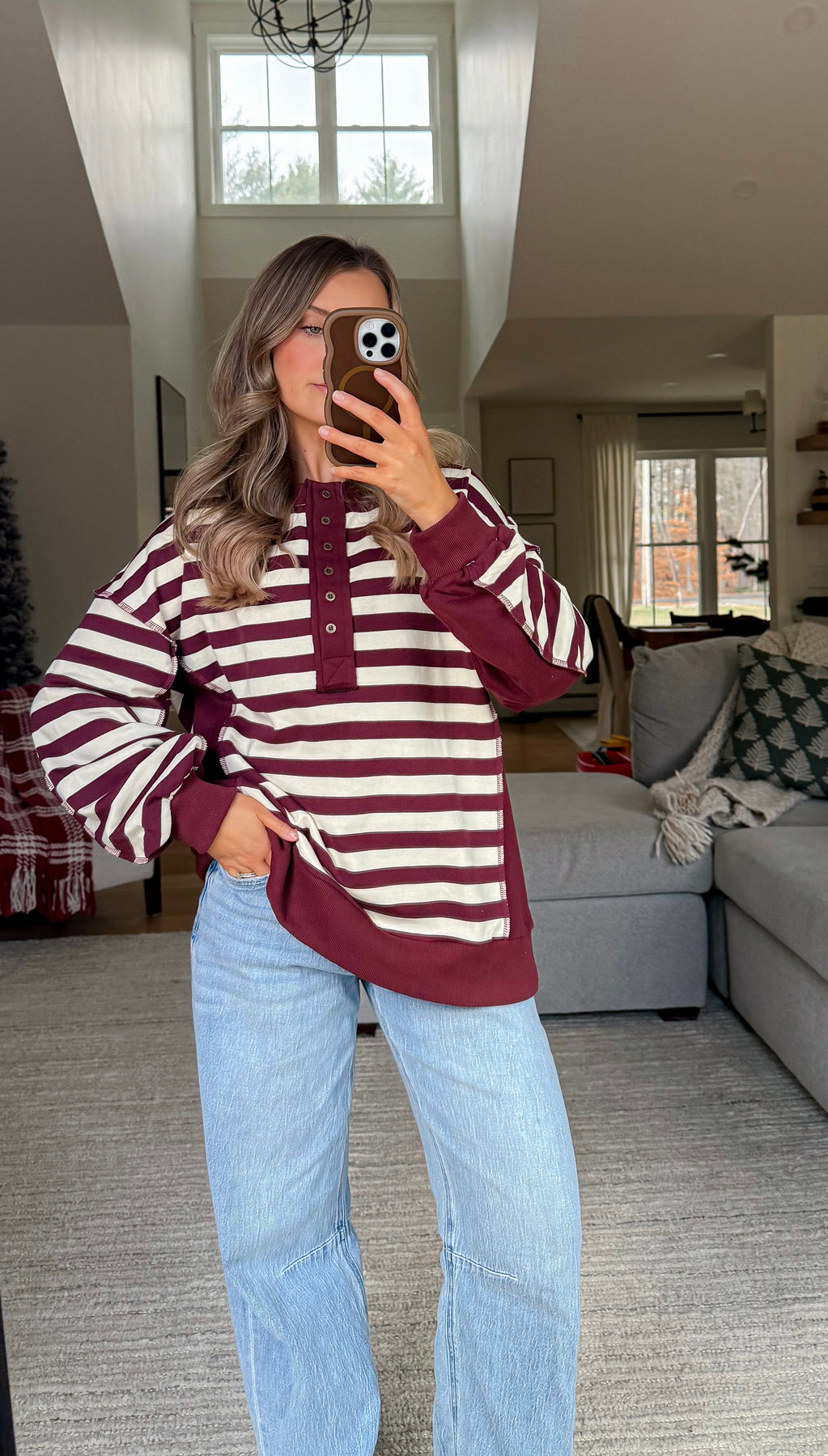 Oversized henley style striped pullover with functional front buttons and exposed seam detailing