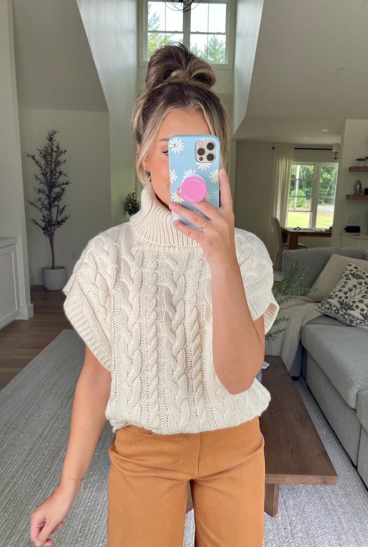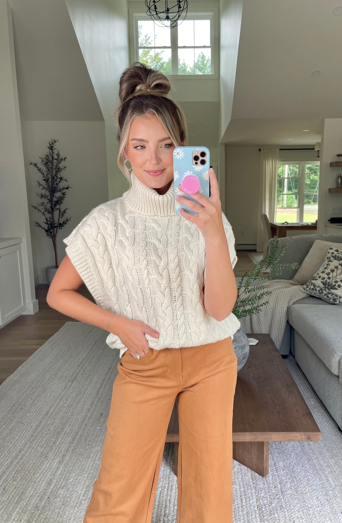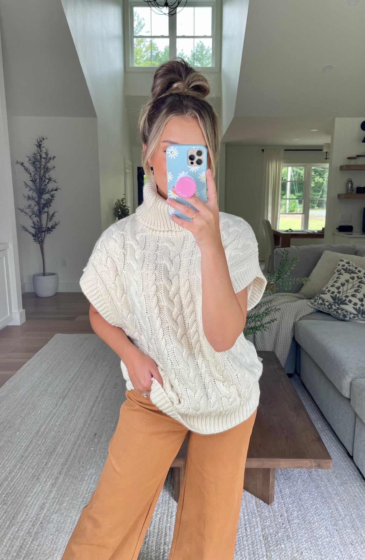 Cable knit oversized sweater vest with chunky turtleneck neckline