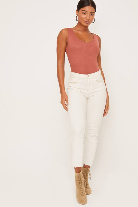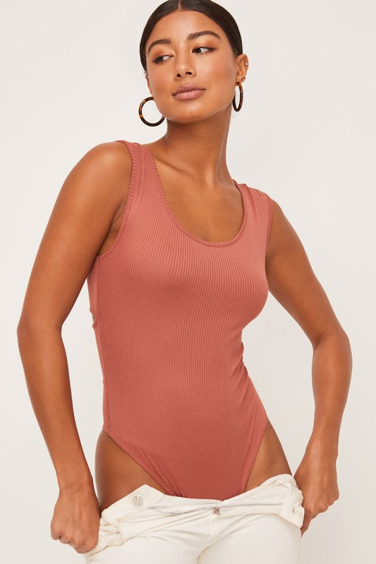 Cap sleeve ribbed bodysuit featuring criss cross back detail