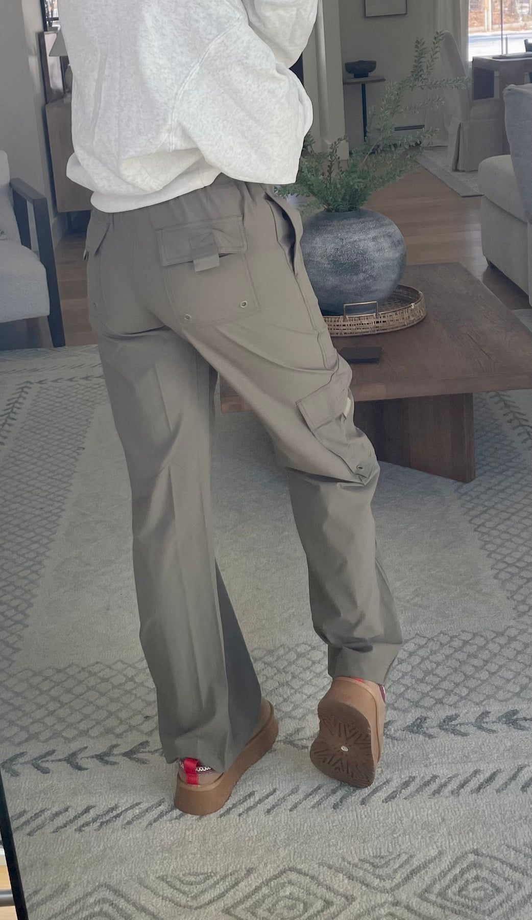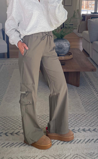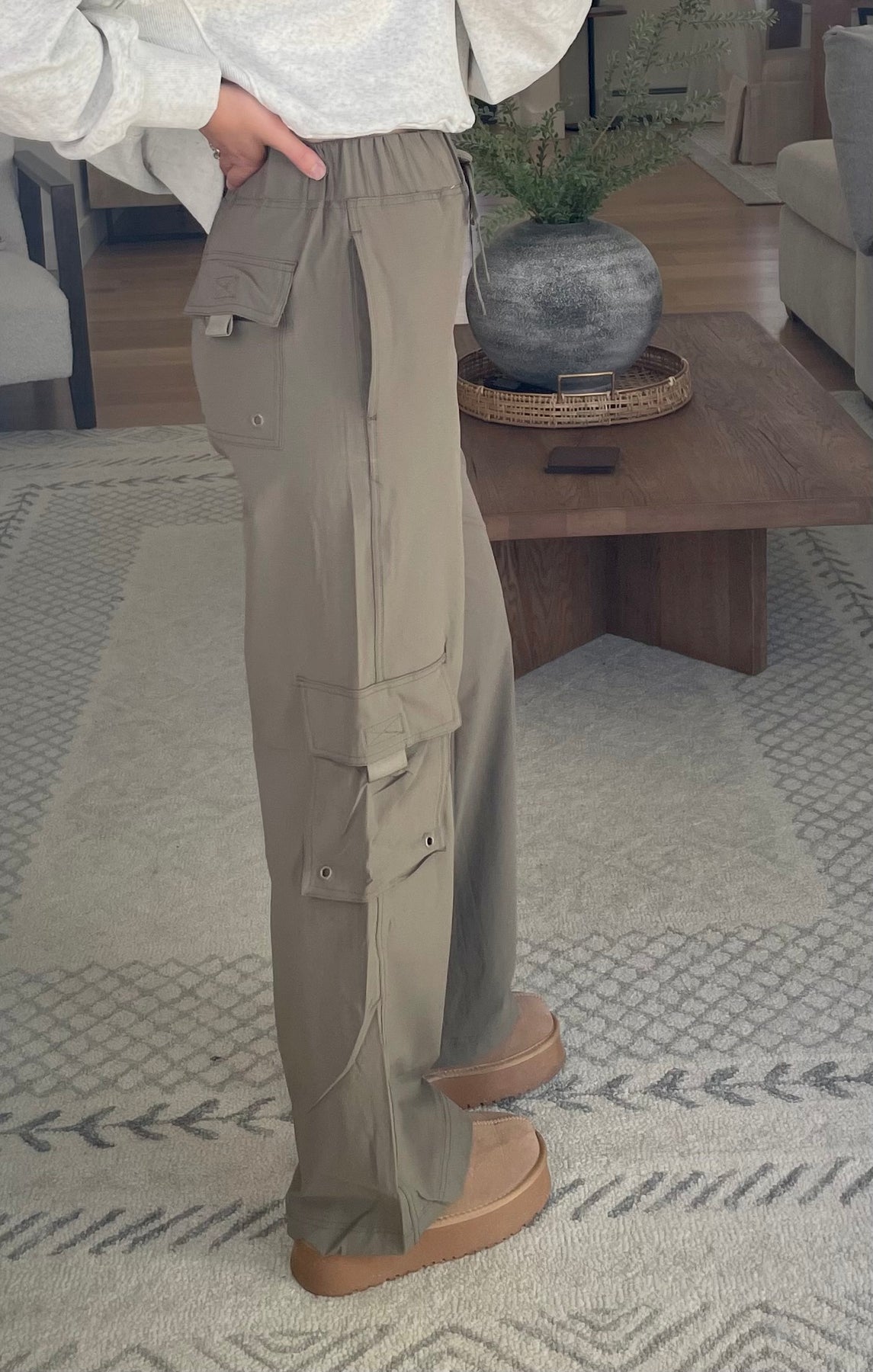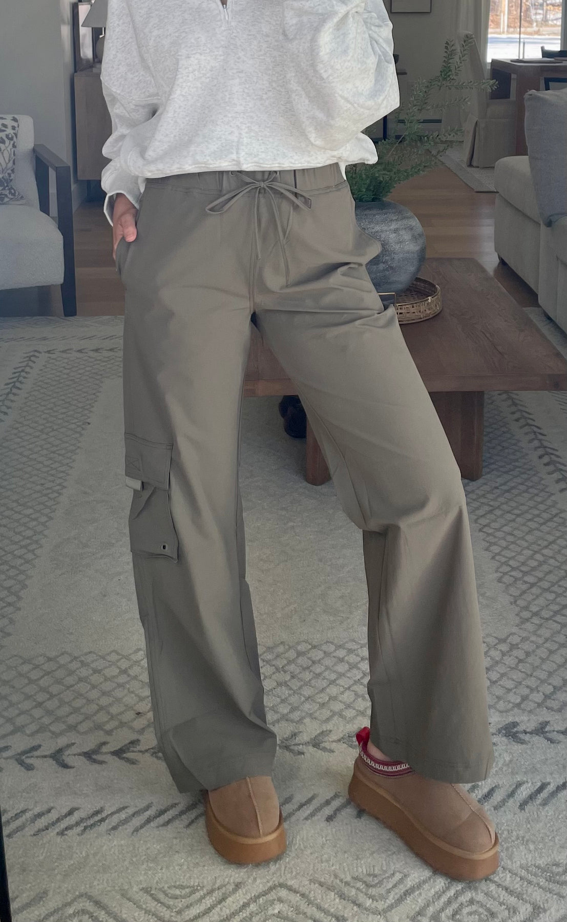 High rise elastic waist cargo style sweatpants with side pockets, and functional drawstring