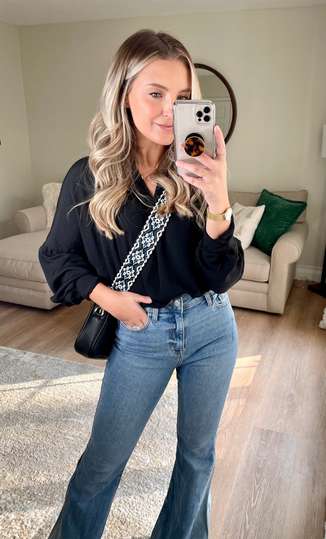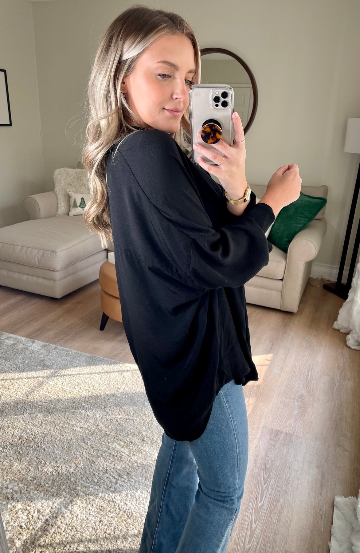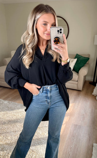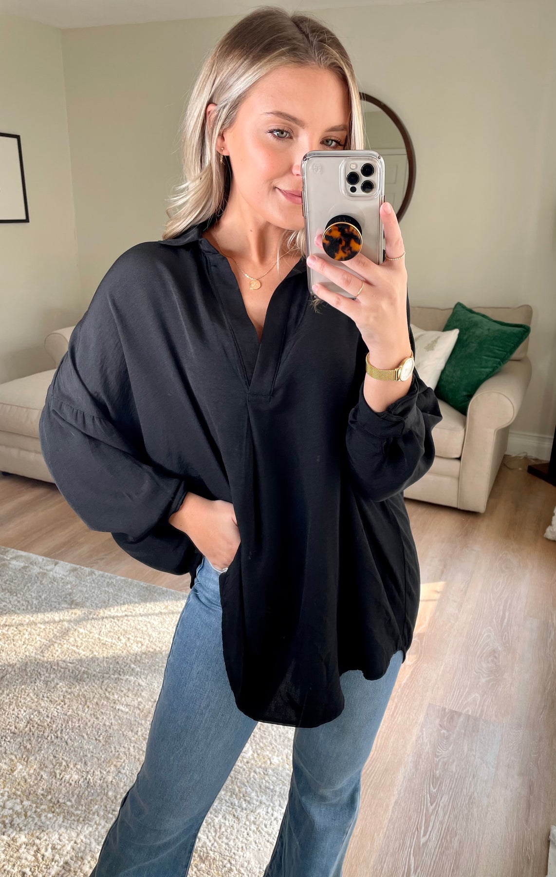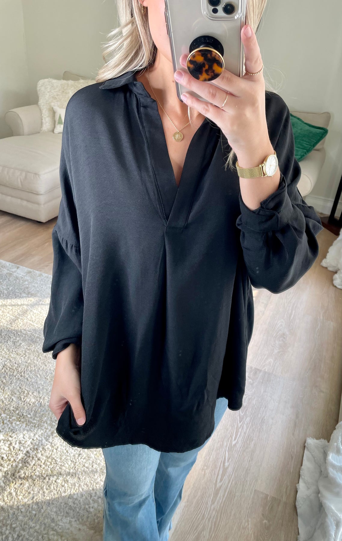 Classic collard v-neck blouse with cuffed sleeve and hi-low silhouette