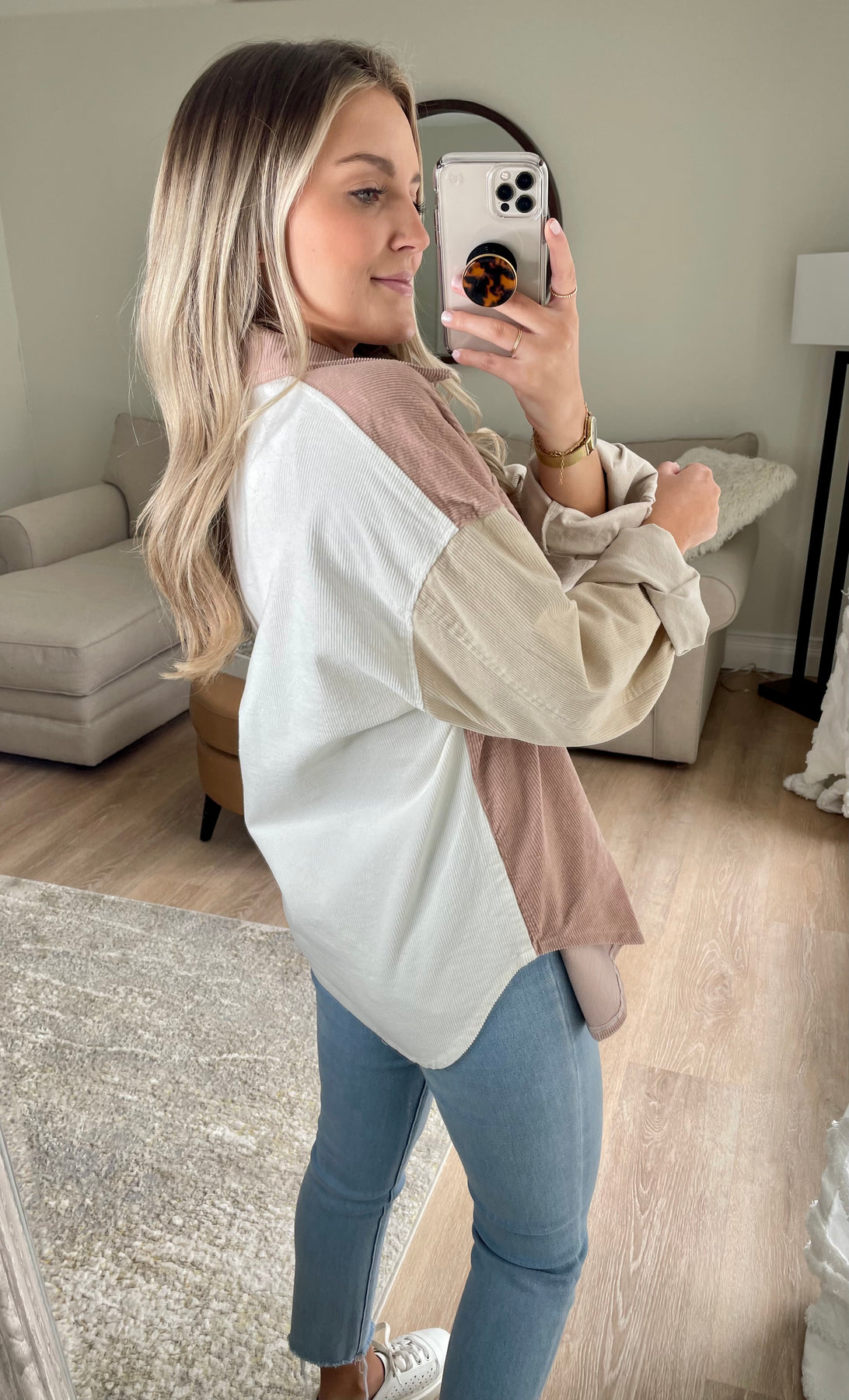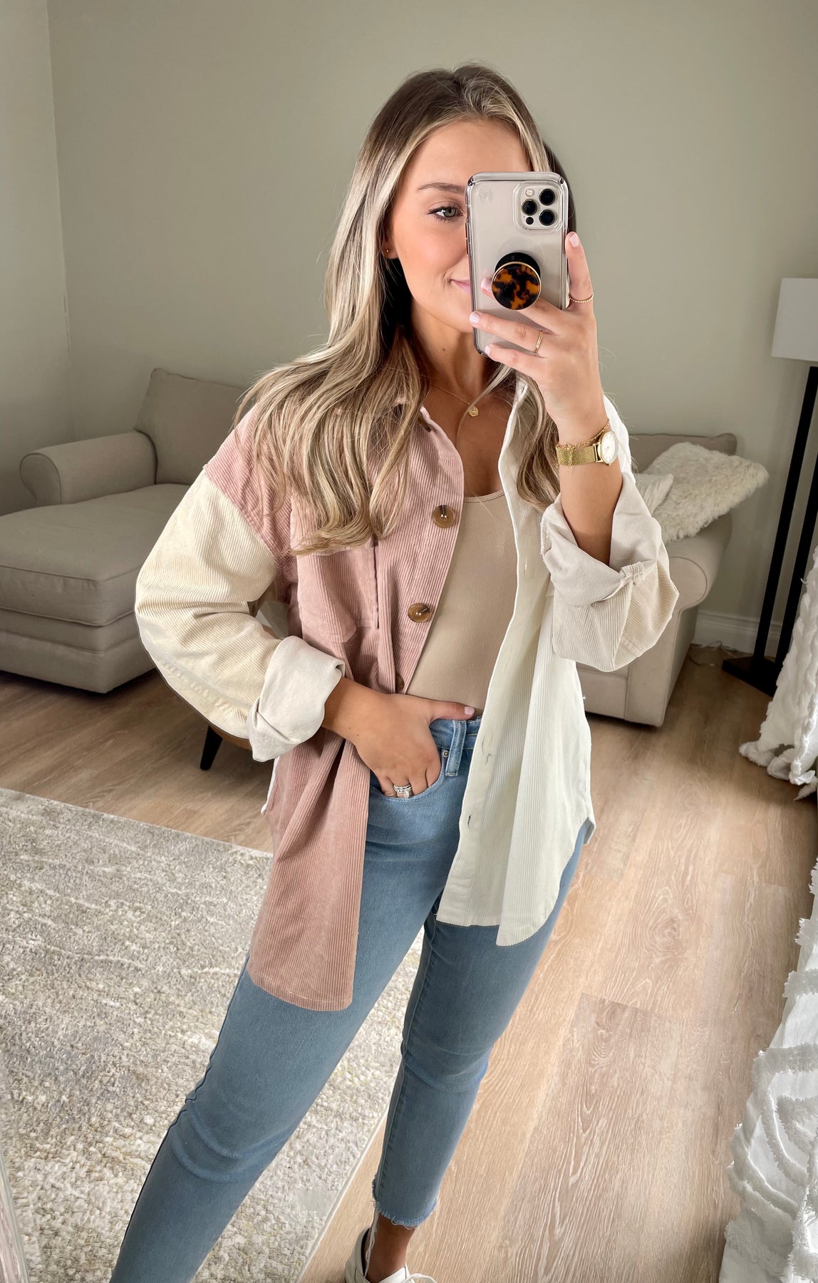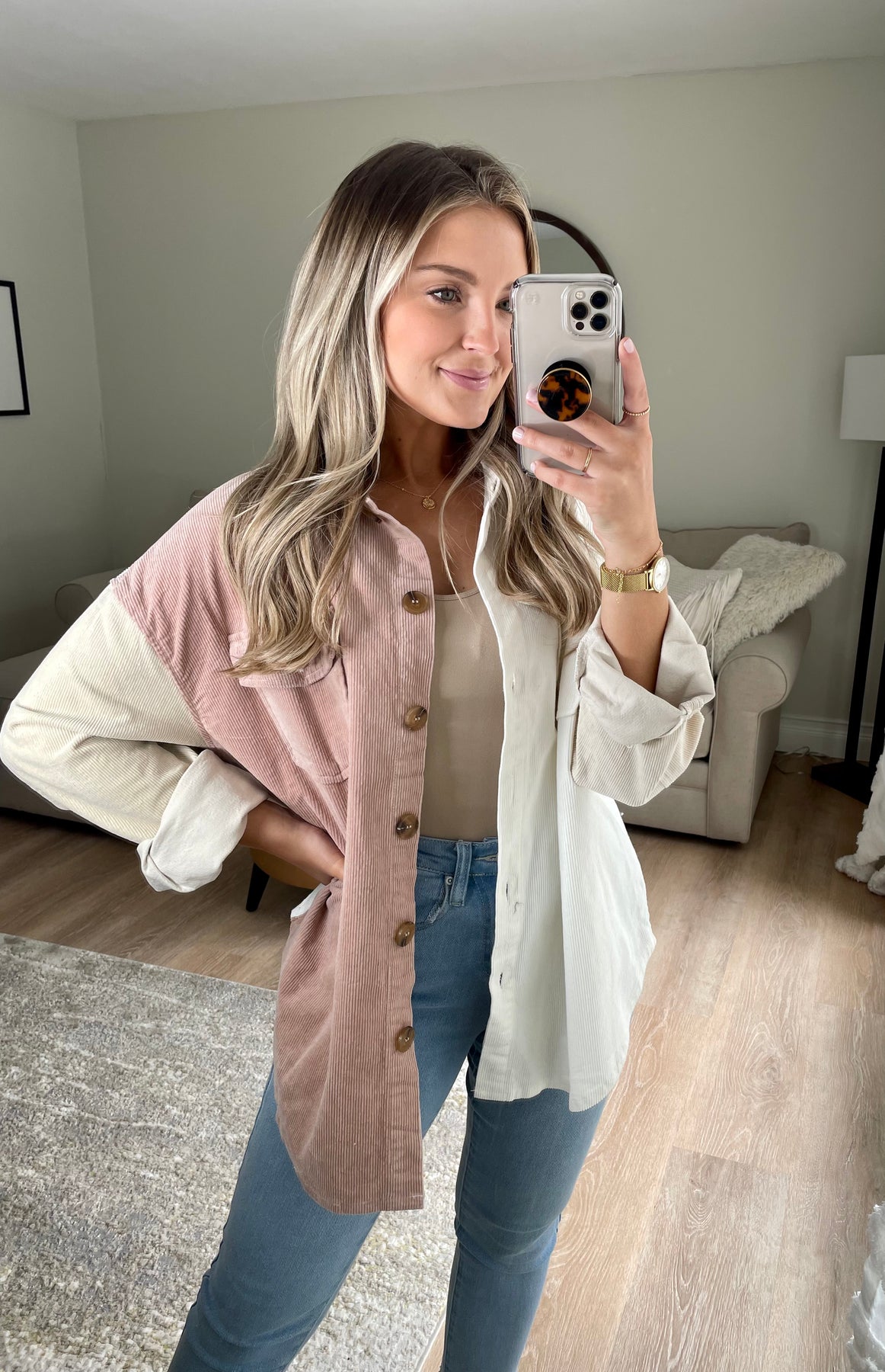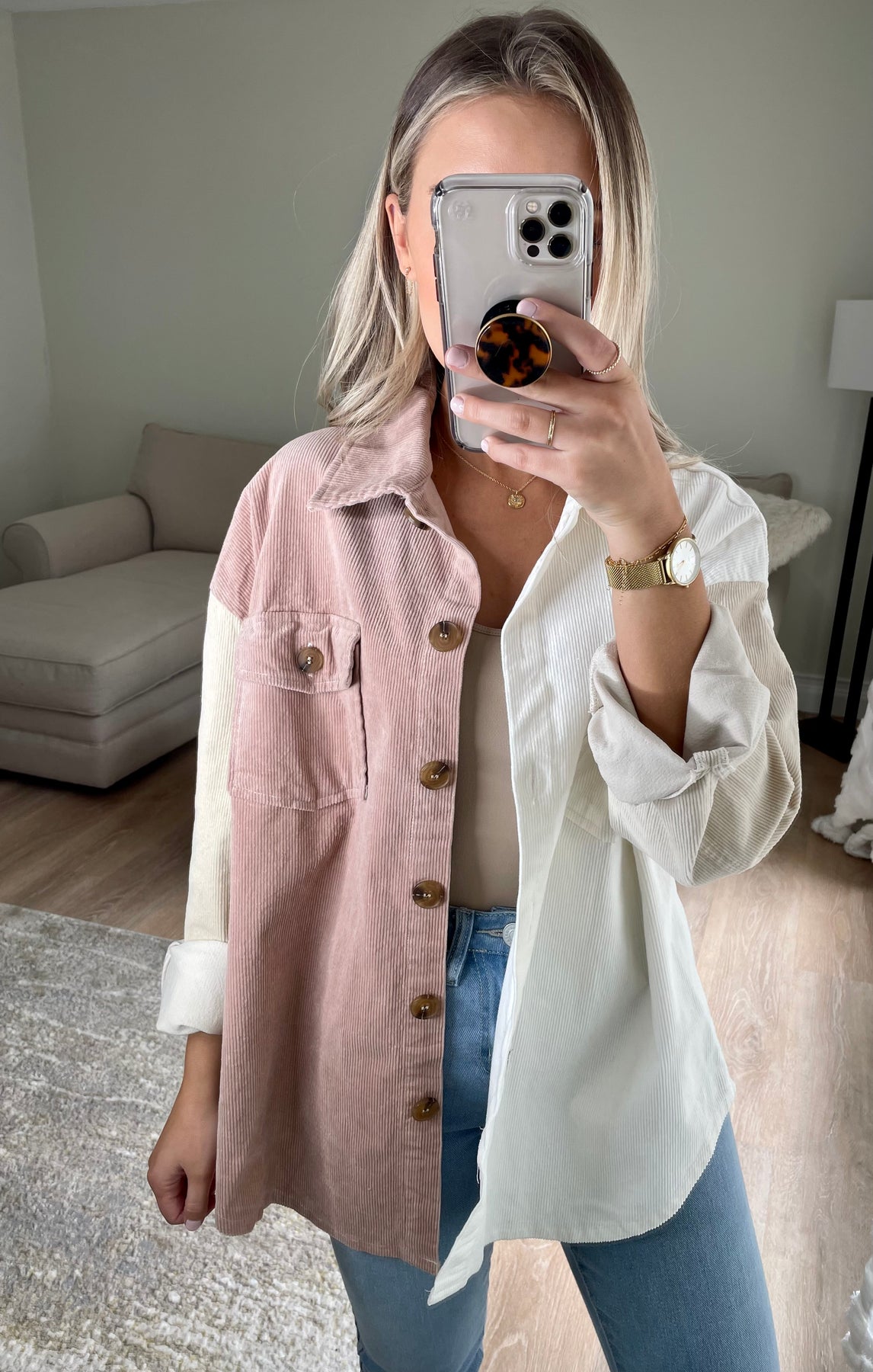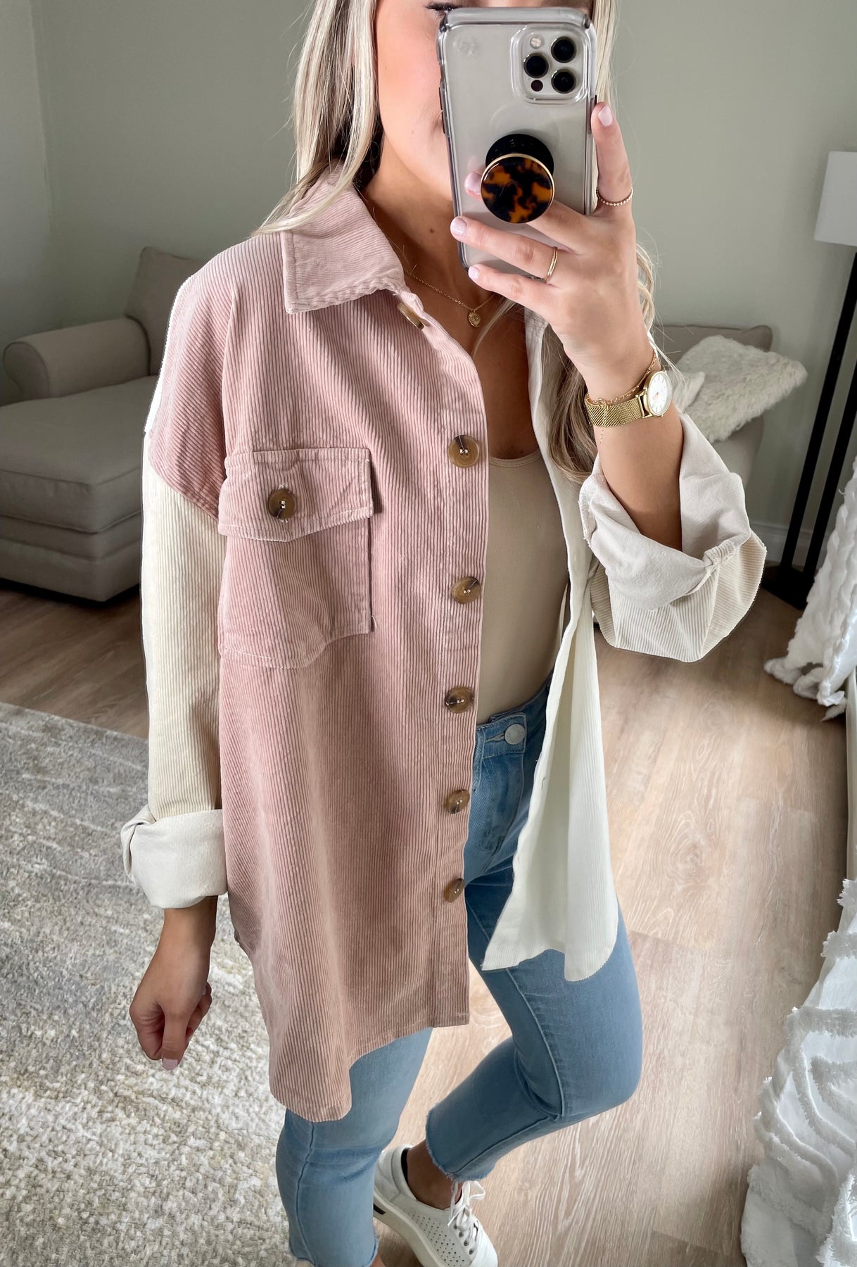 Oversized colorblock corduroy shirt jacket with functional front buttons