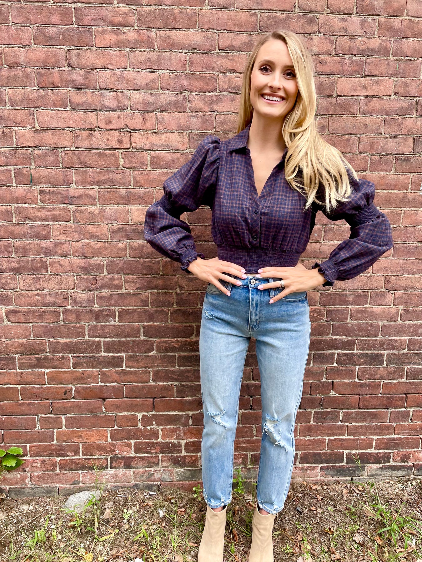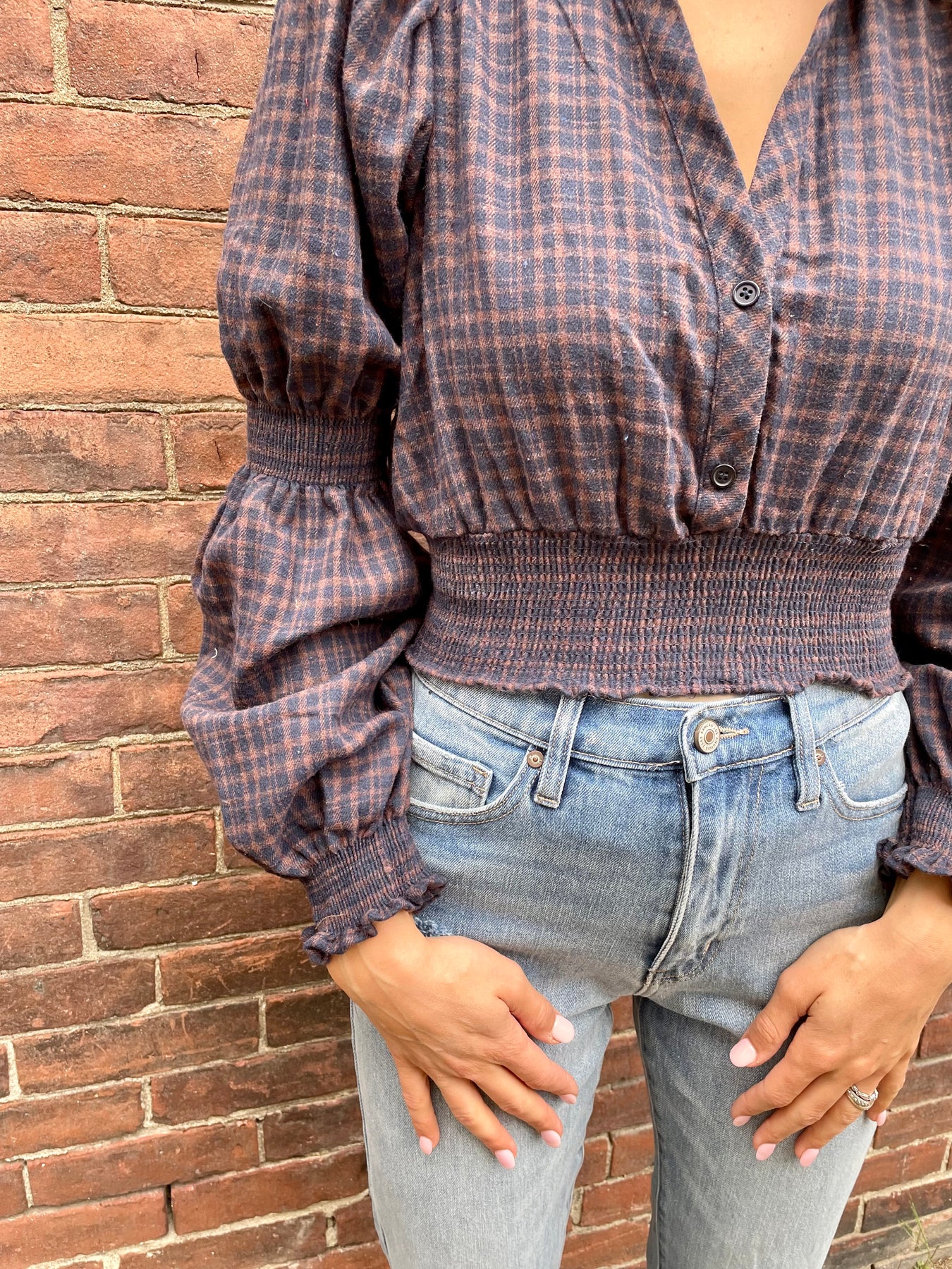 Cropped Bubble Sleeve Plaid Top