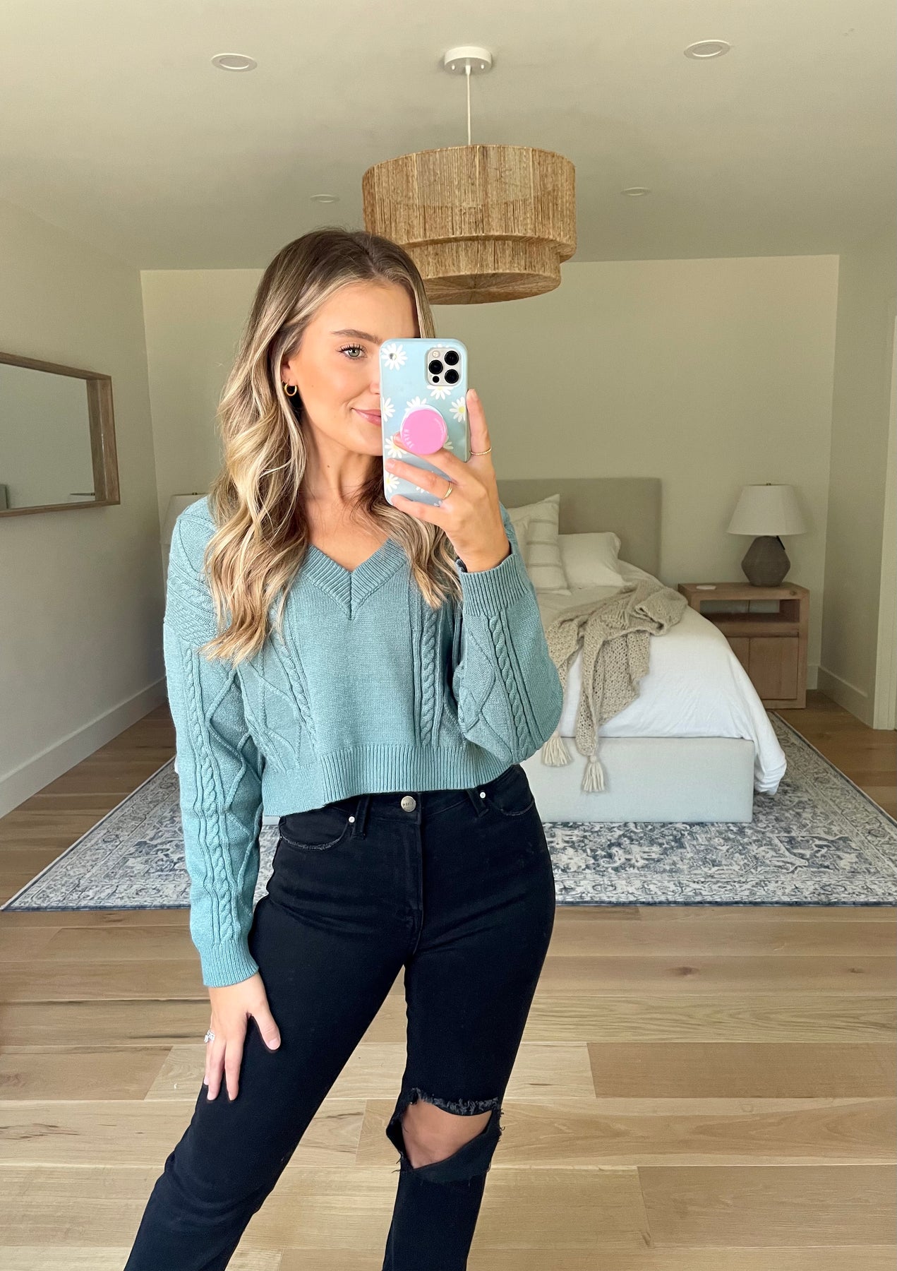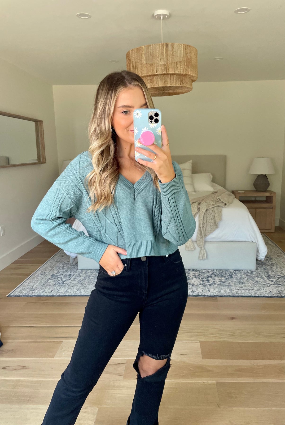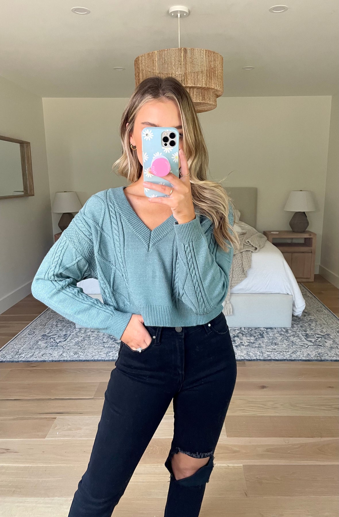 Cropped cable knit sweater with a v-neckline and open back tie detail