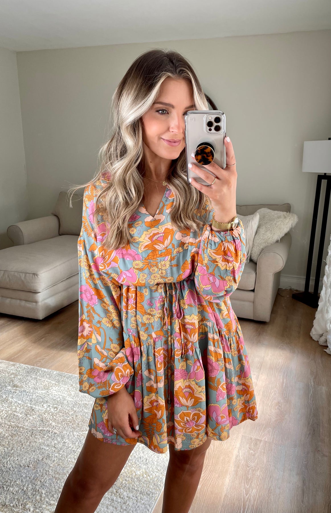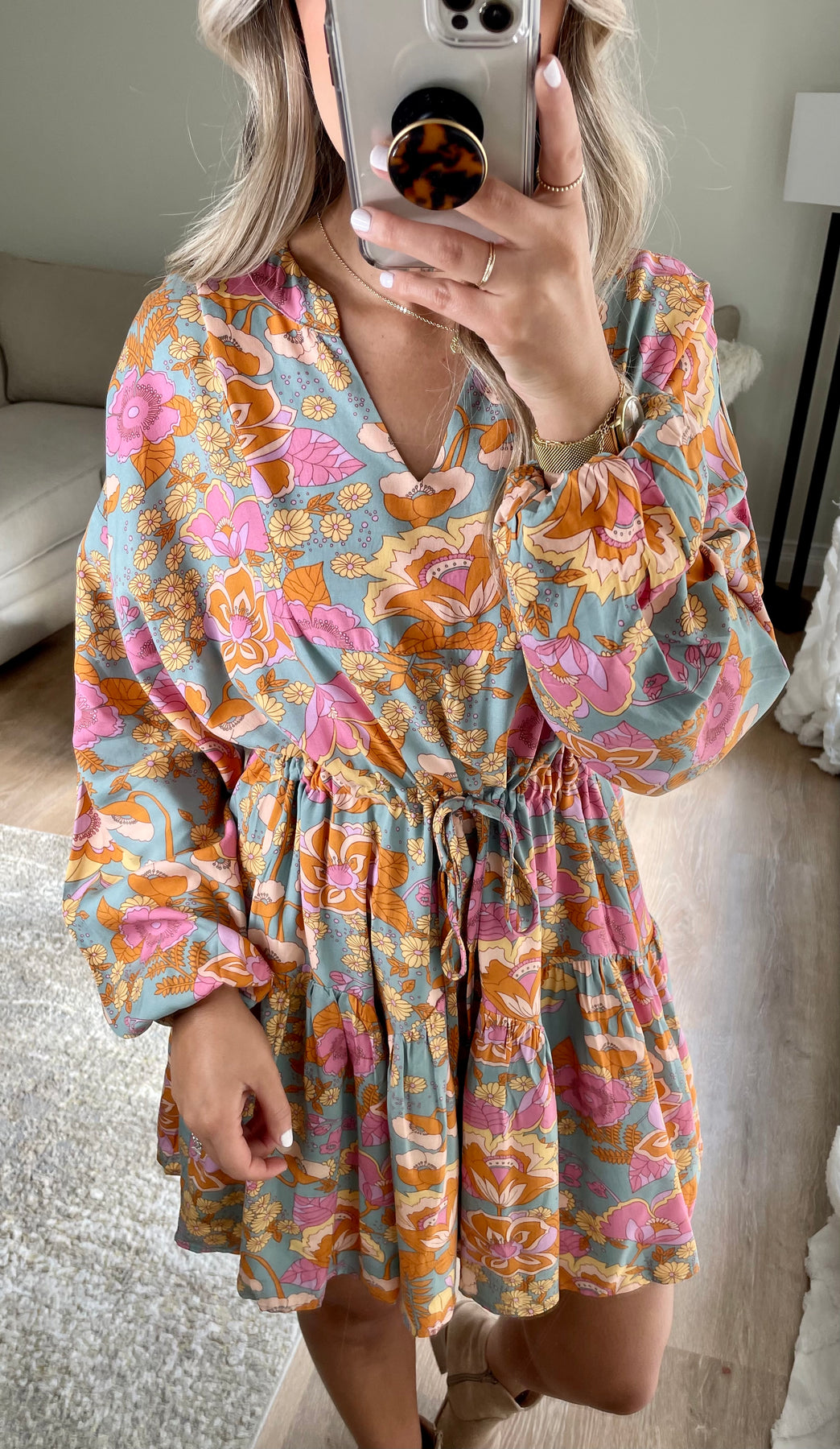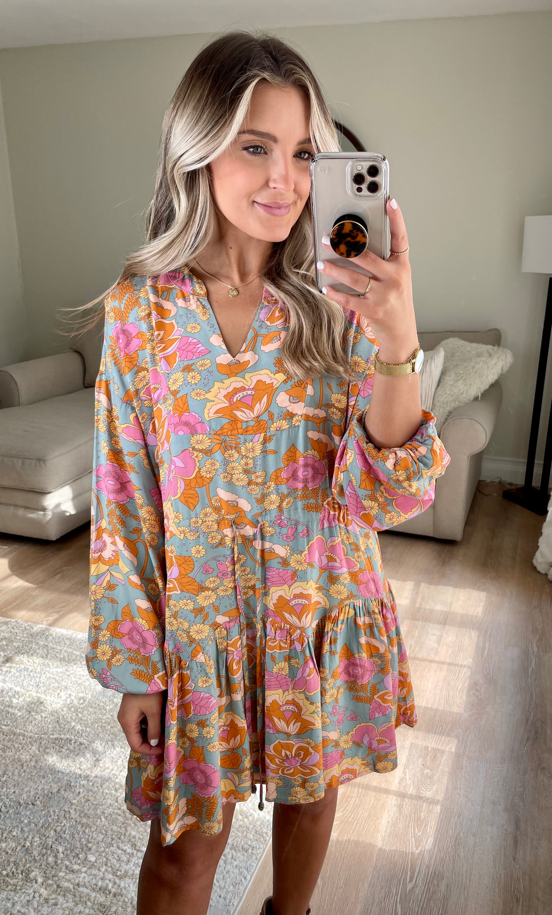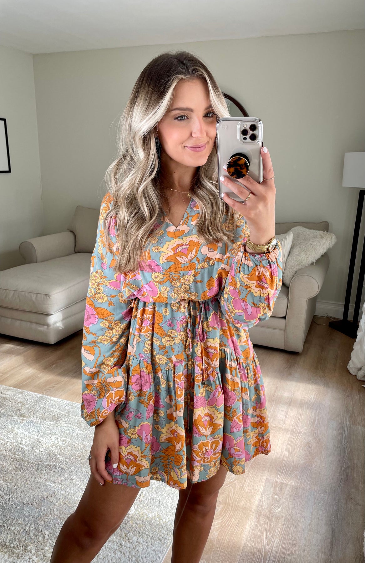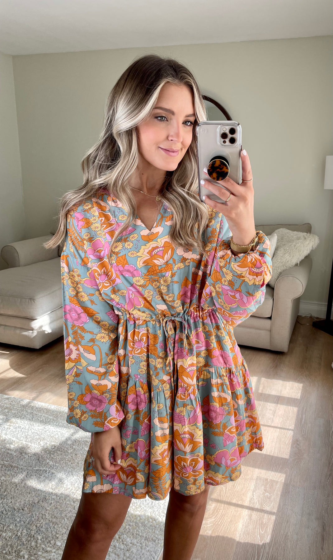 Flowy v-neck dress with adjustable tie waist and long sleeves
