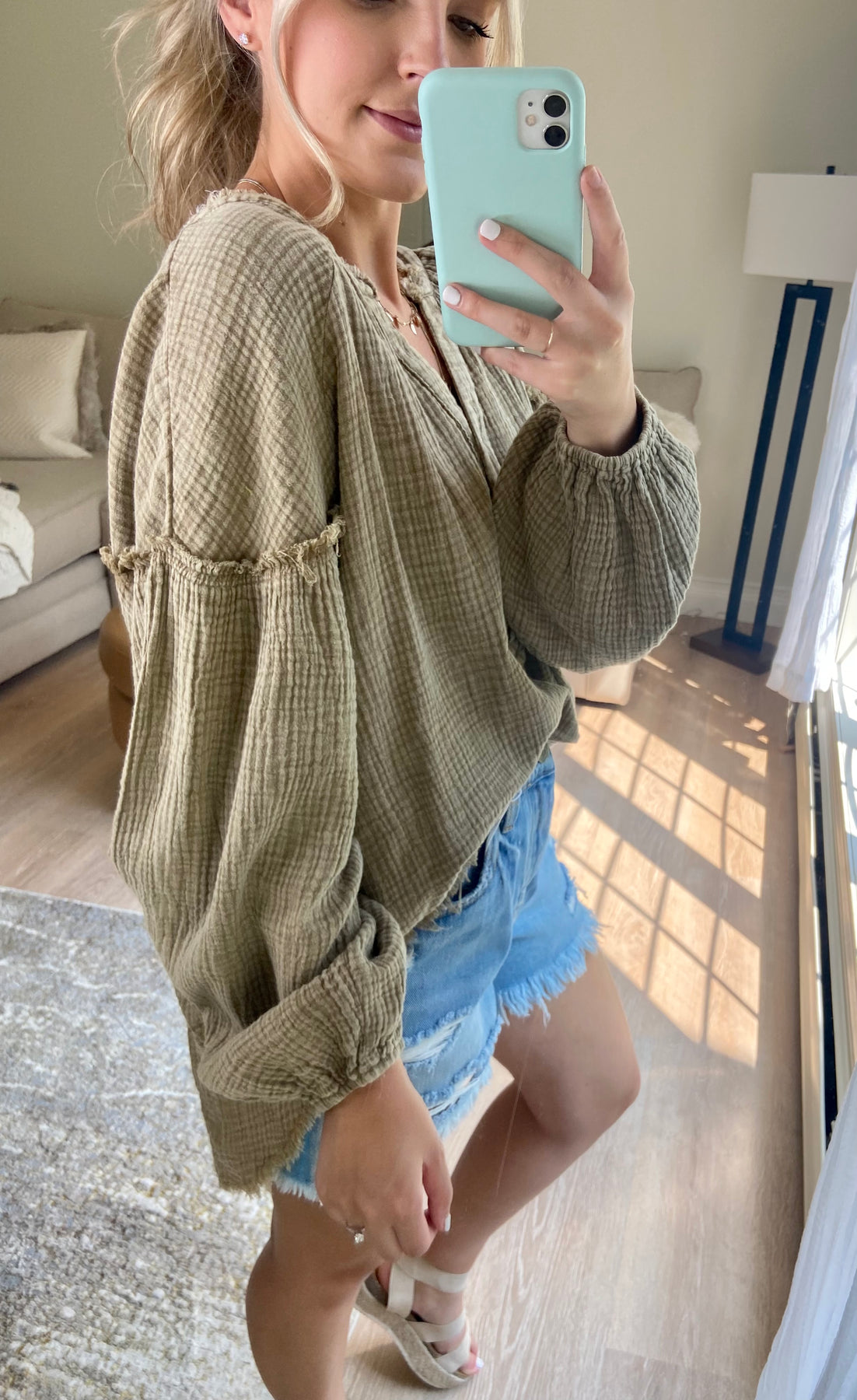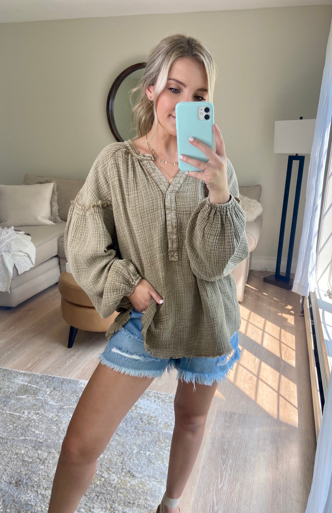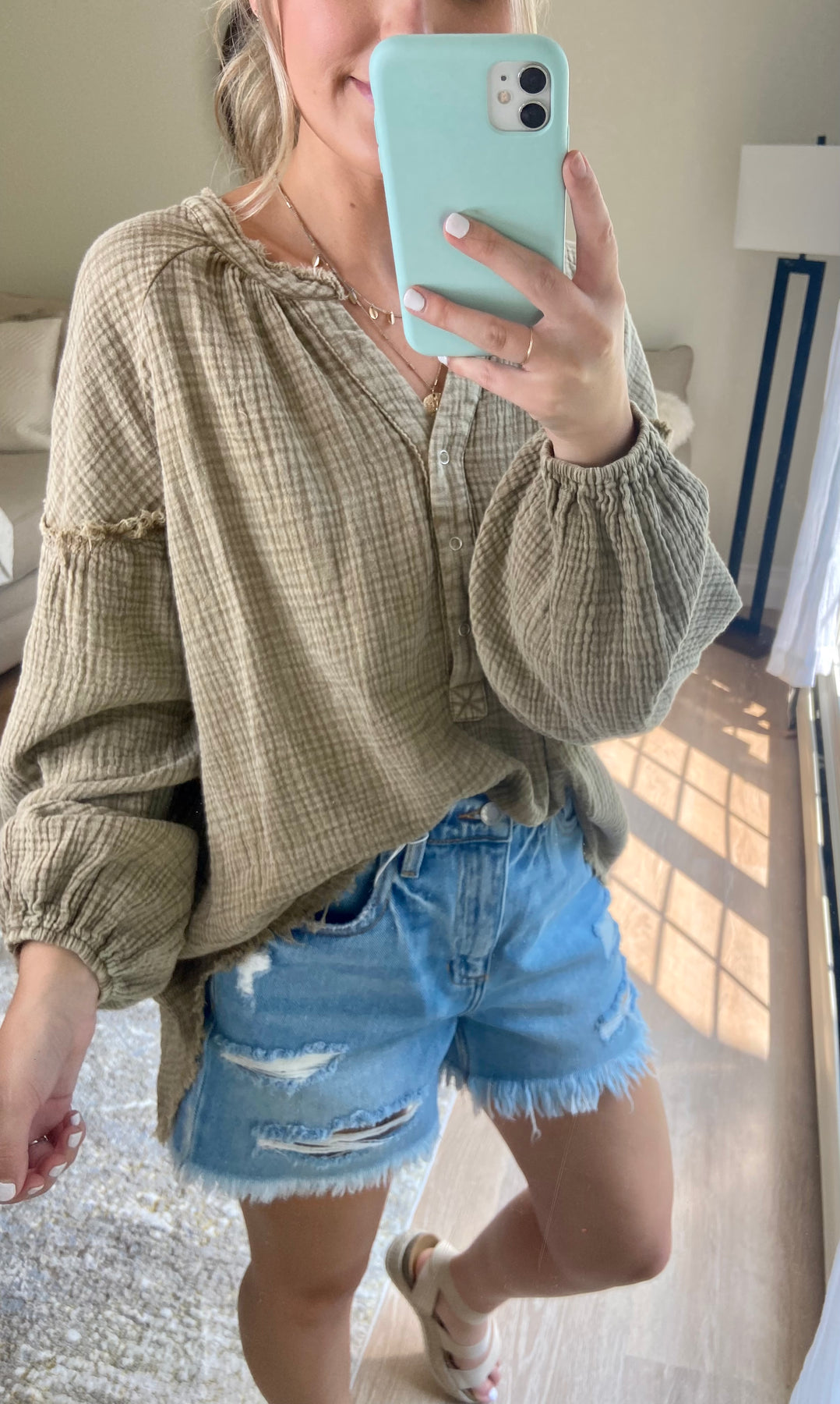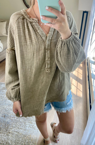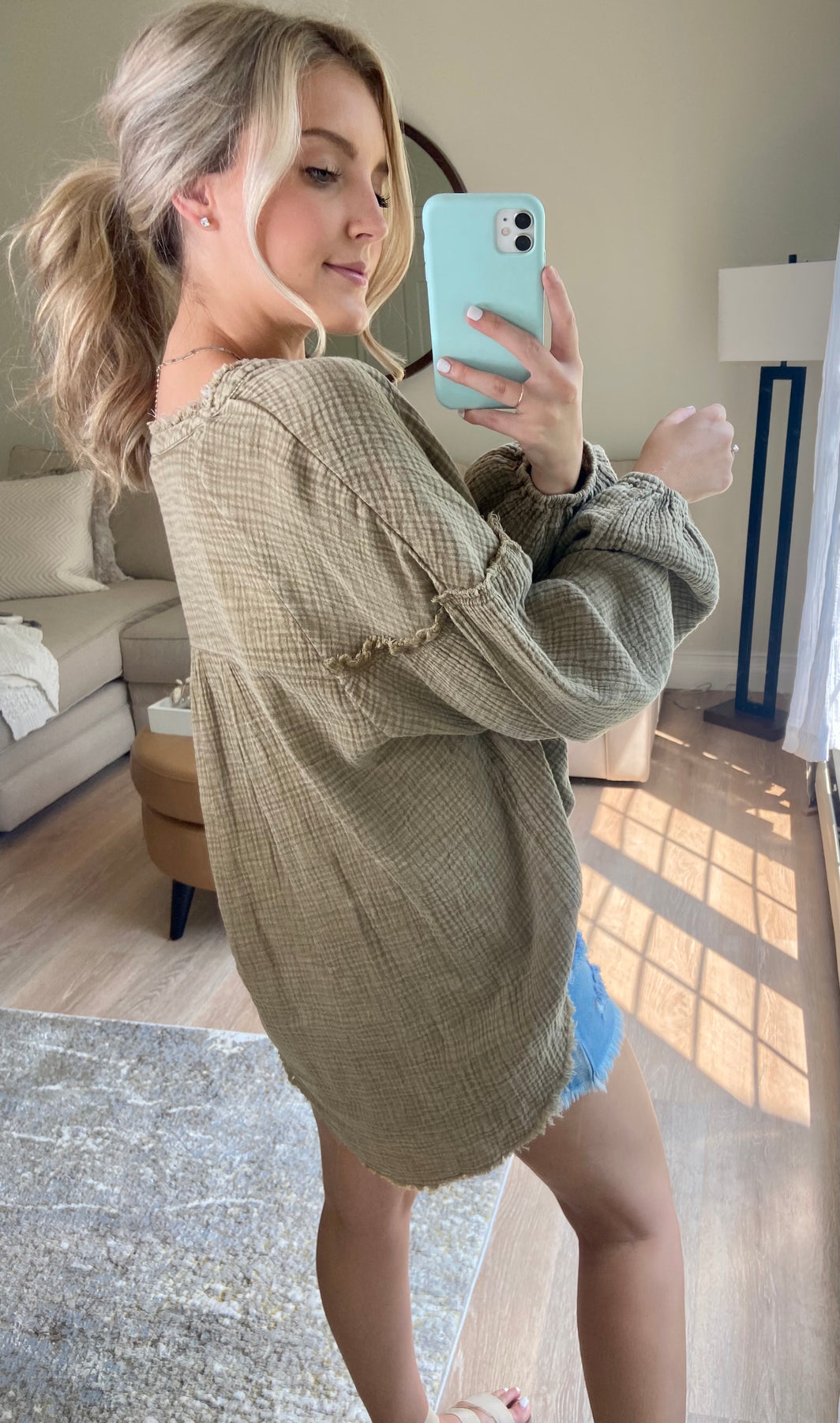 Lightweight 100% cotton gauze top with exposed seam, raw hem, and functional buttons
