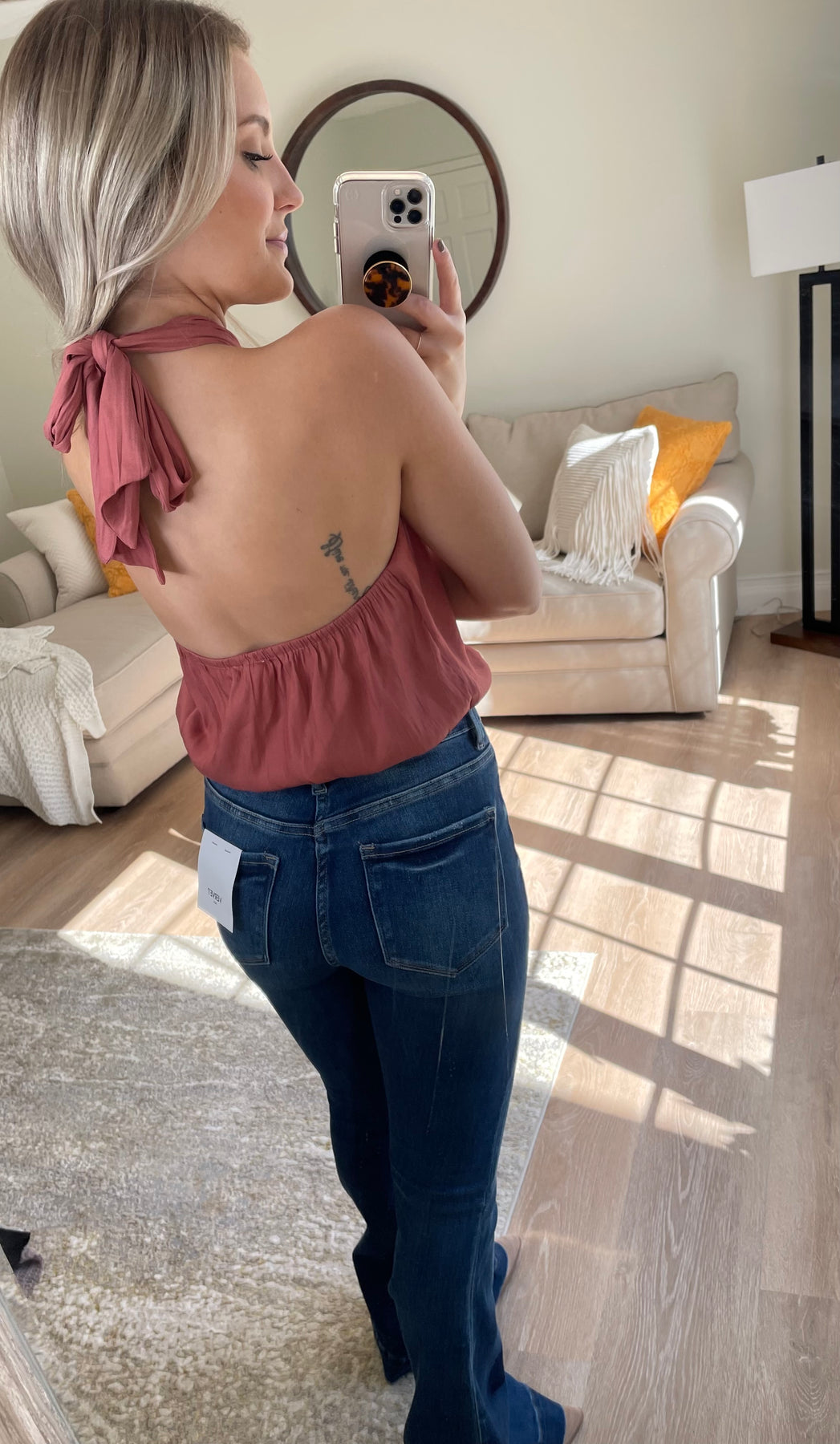 Bodysuit with adjustable halter neckline, open back, mesh bottom
