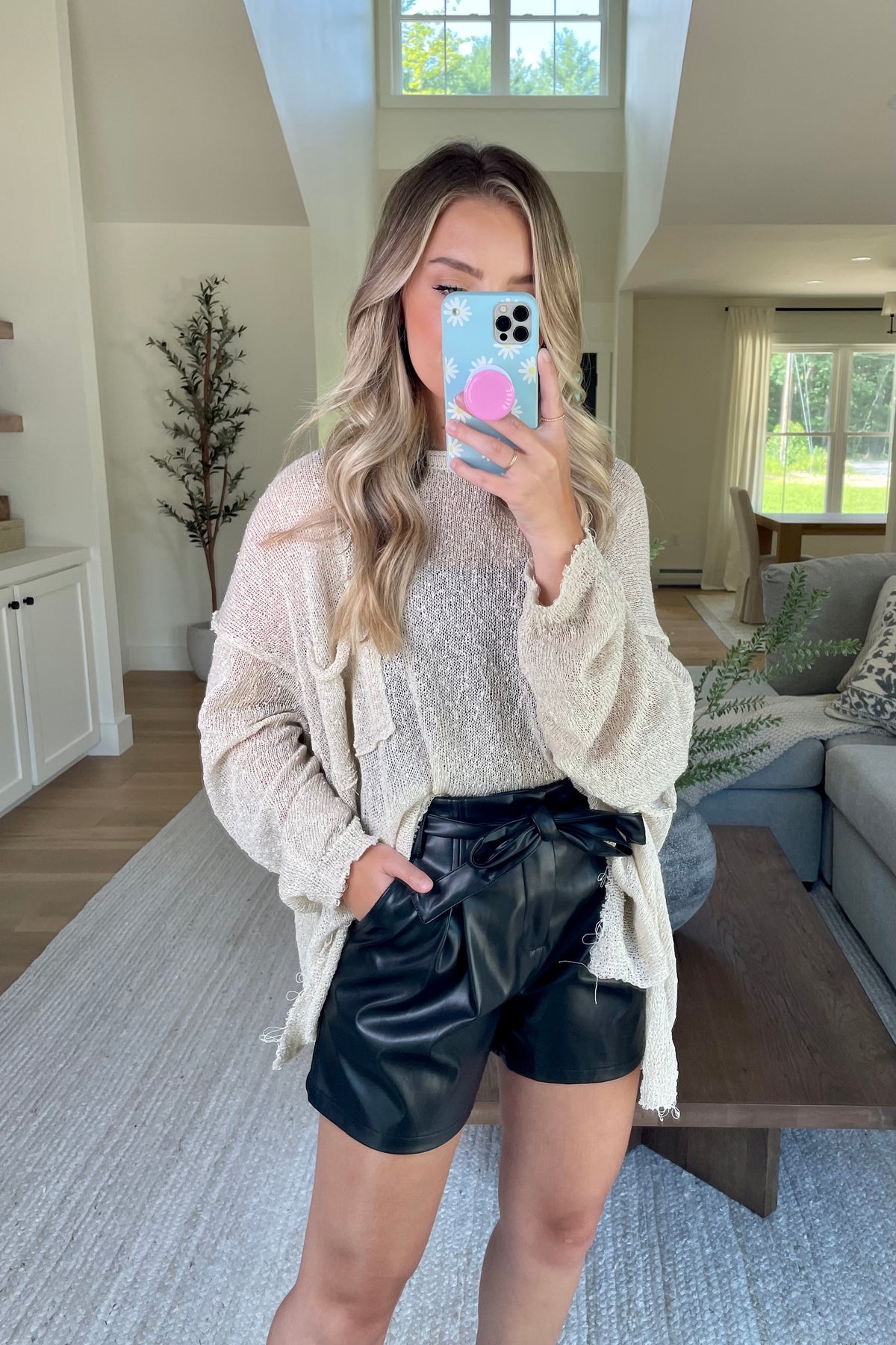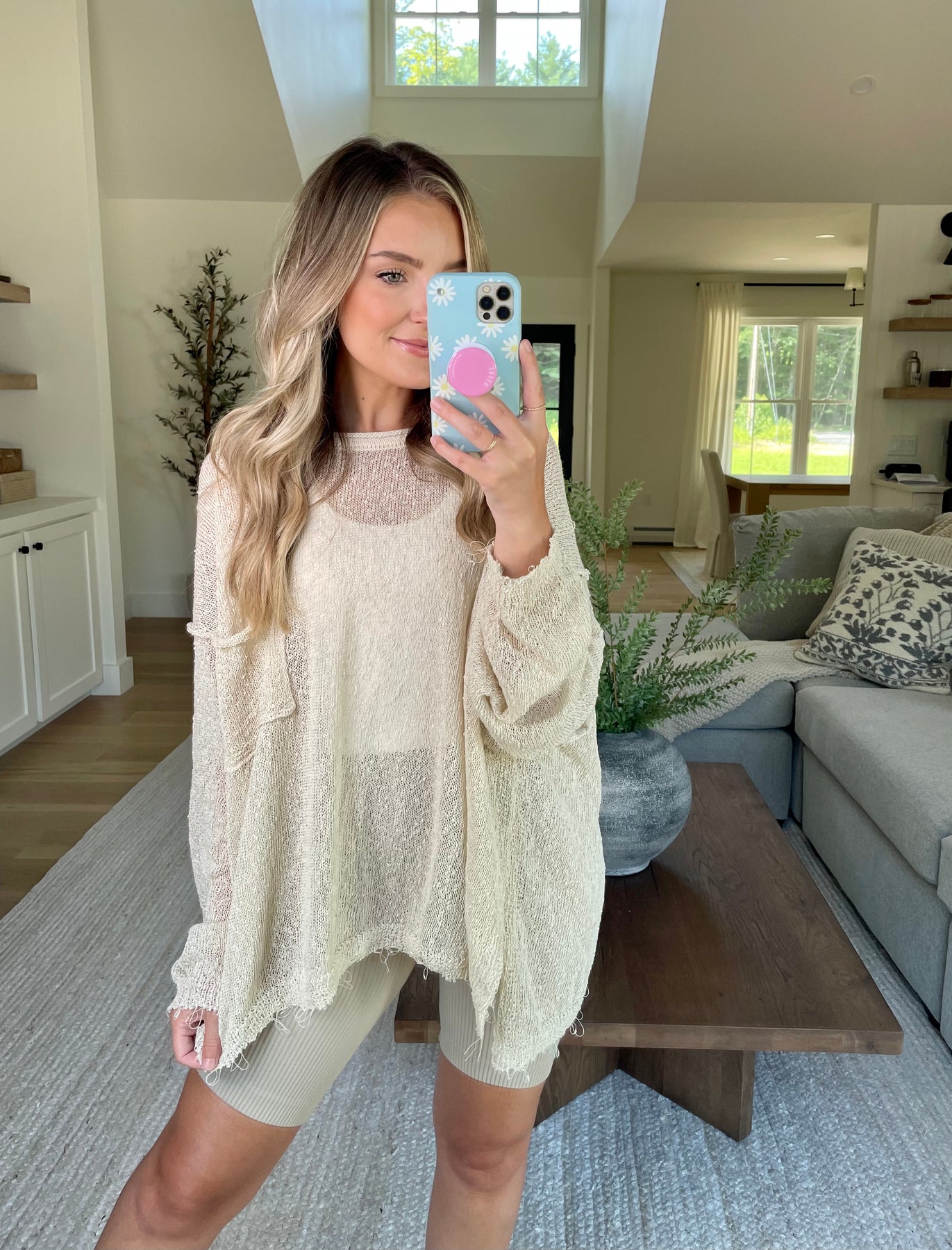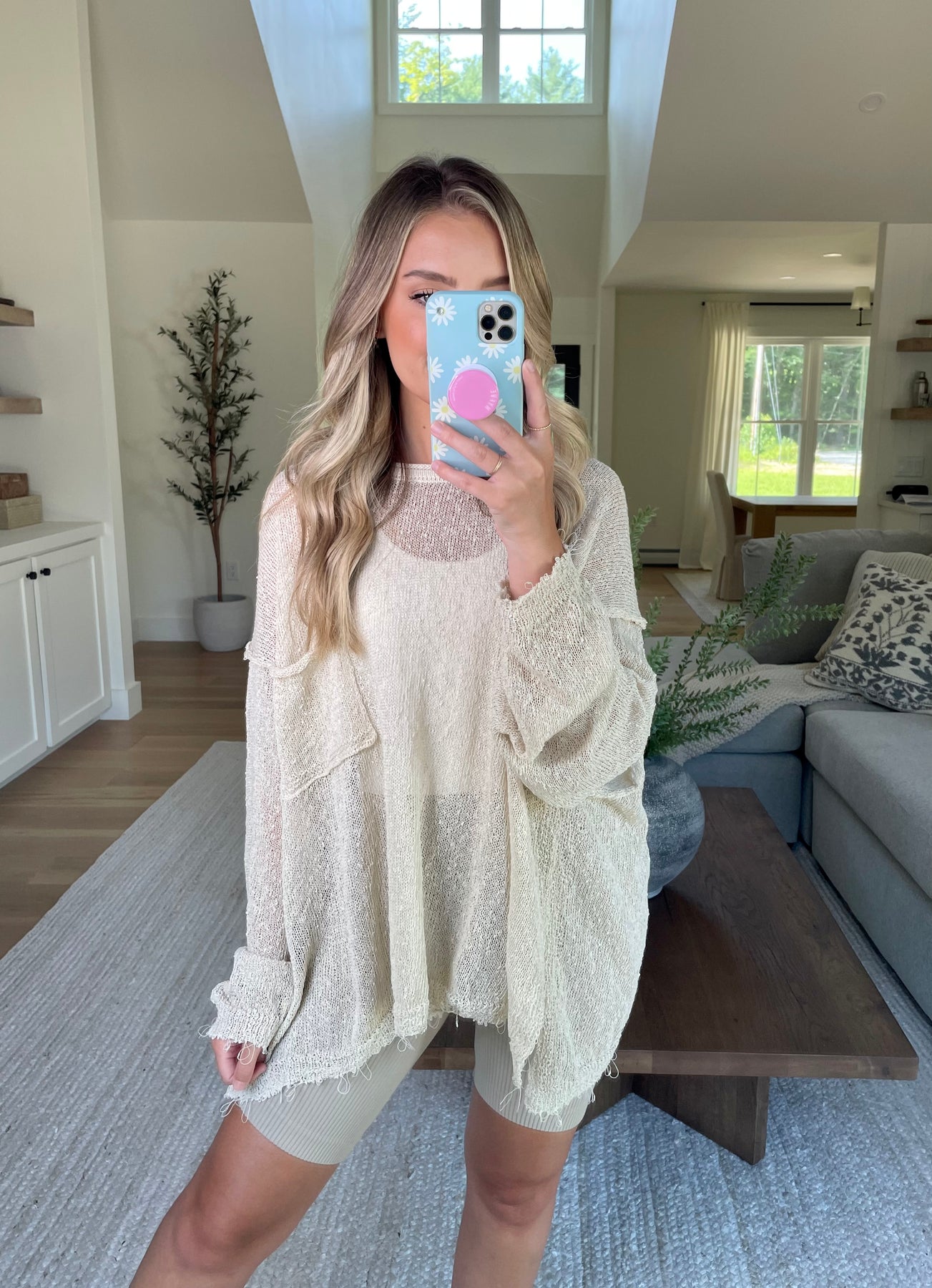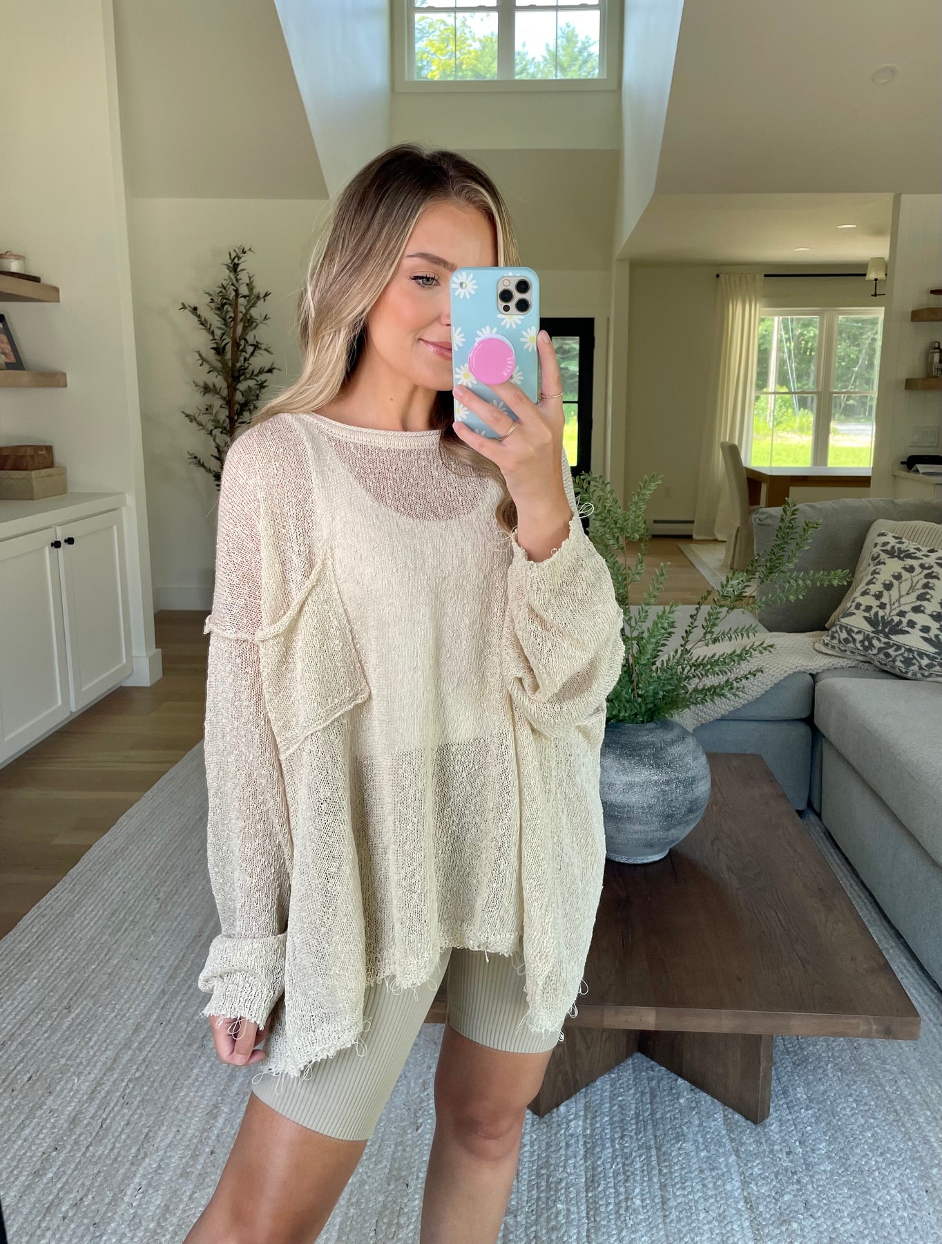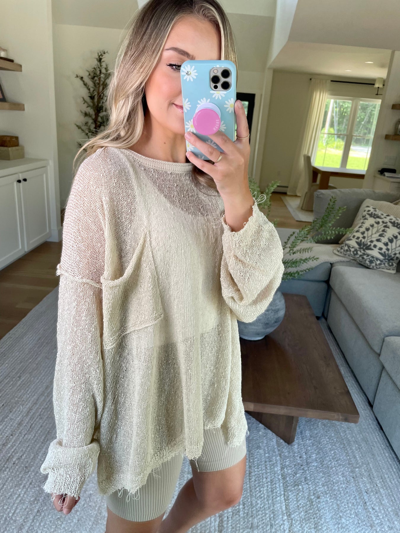 Sheer oversized distressed knit with crew neckline and slouchy pocket detail