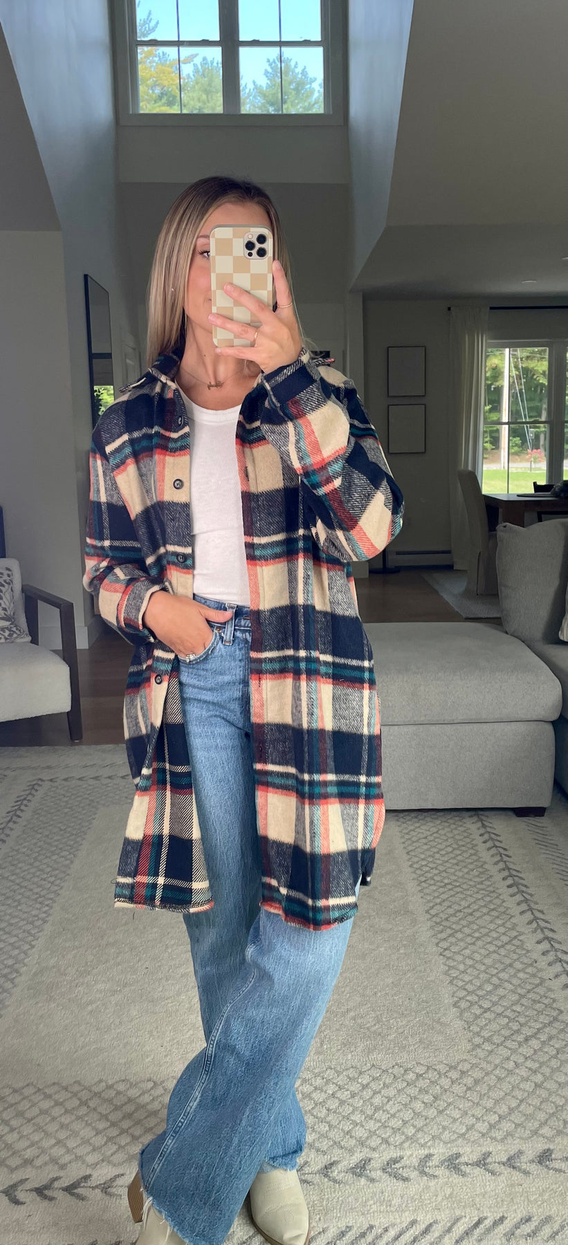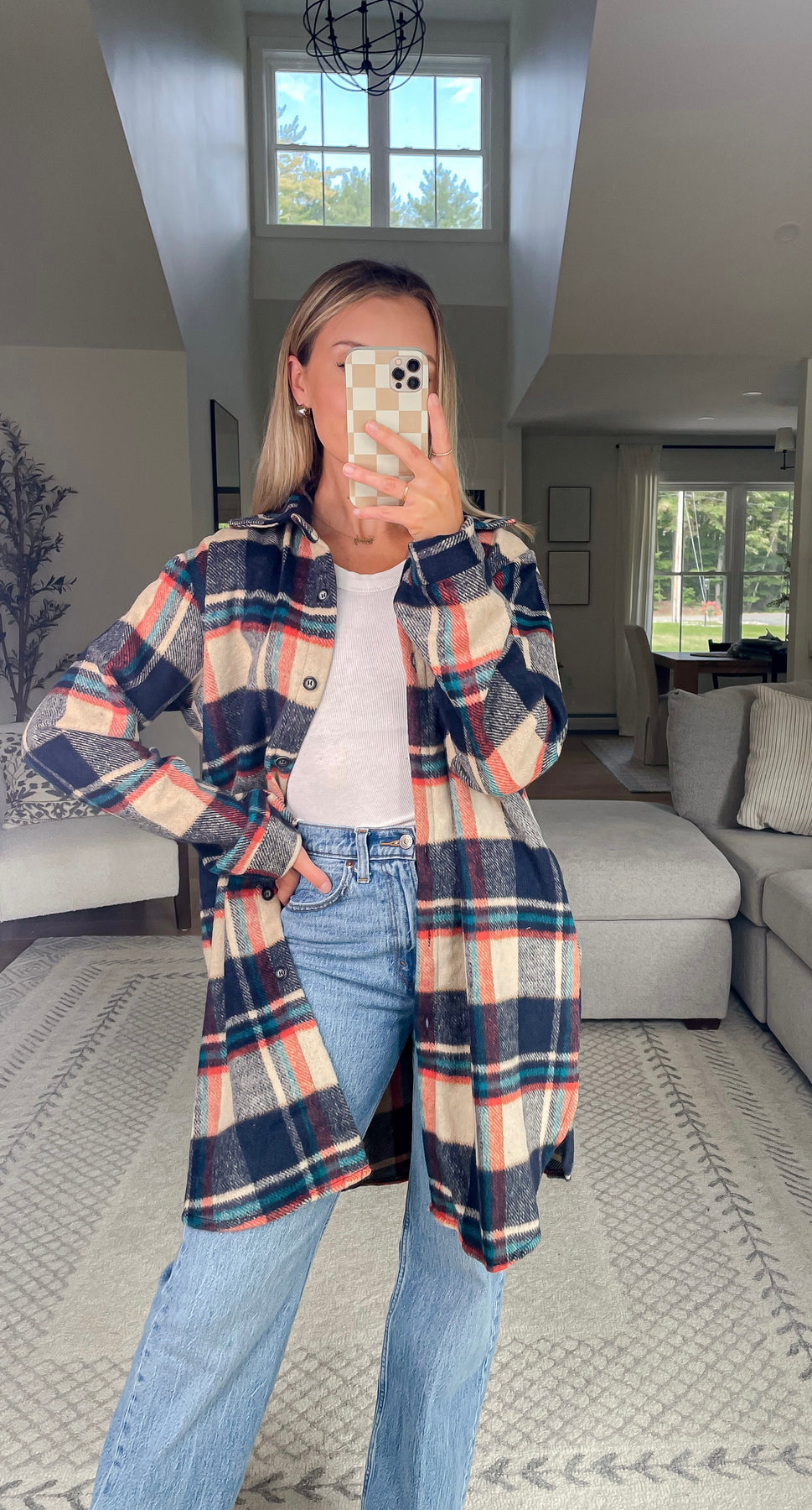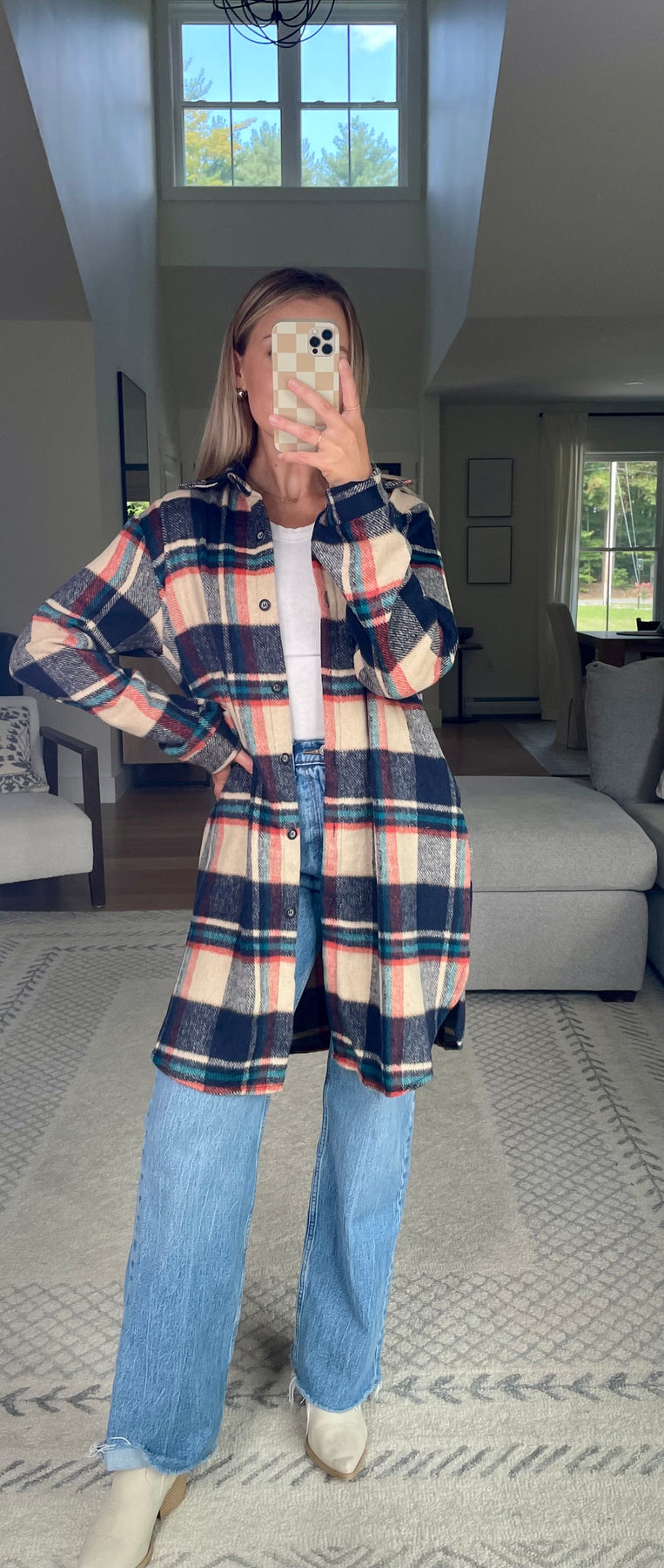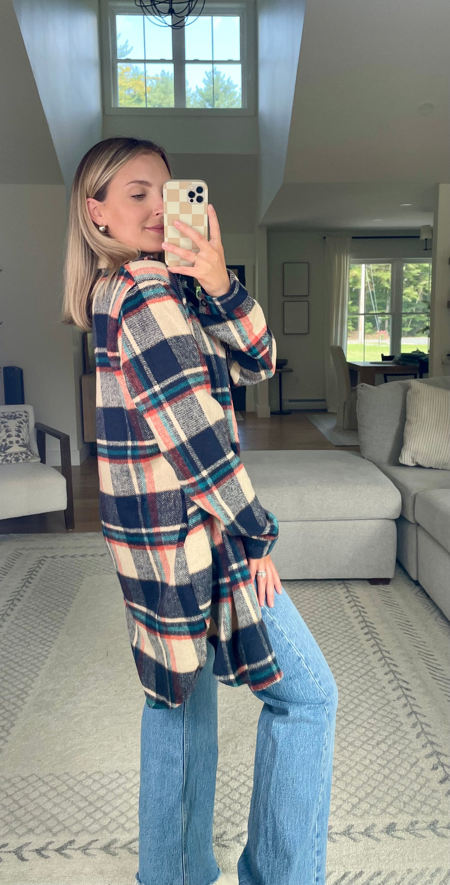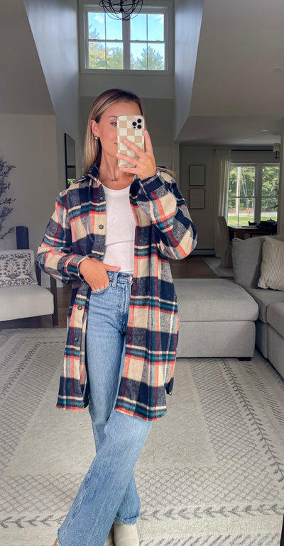Longline plaid shacket with with collar neckline, button up front and side pockets
