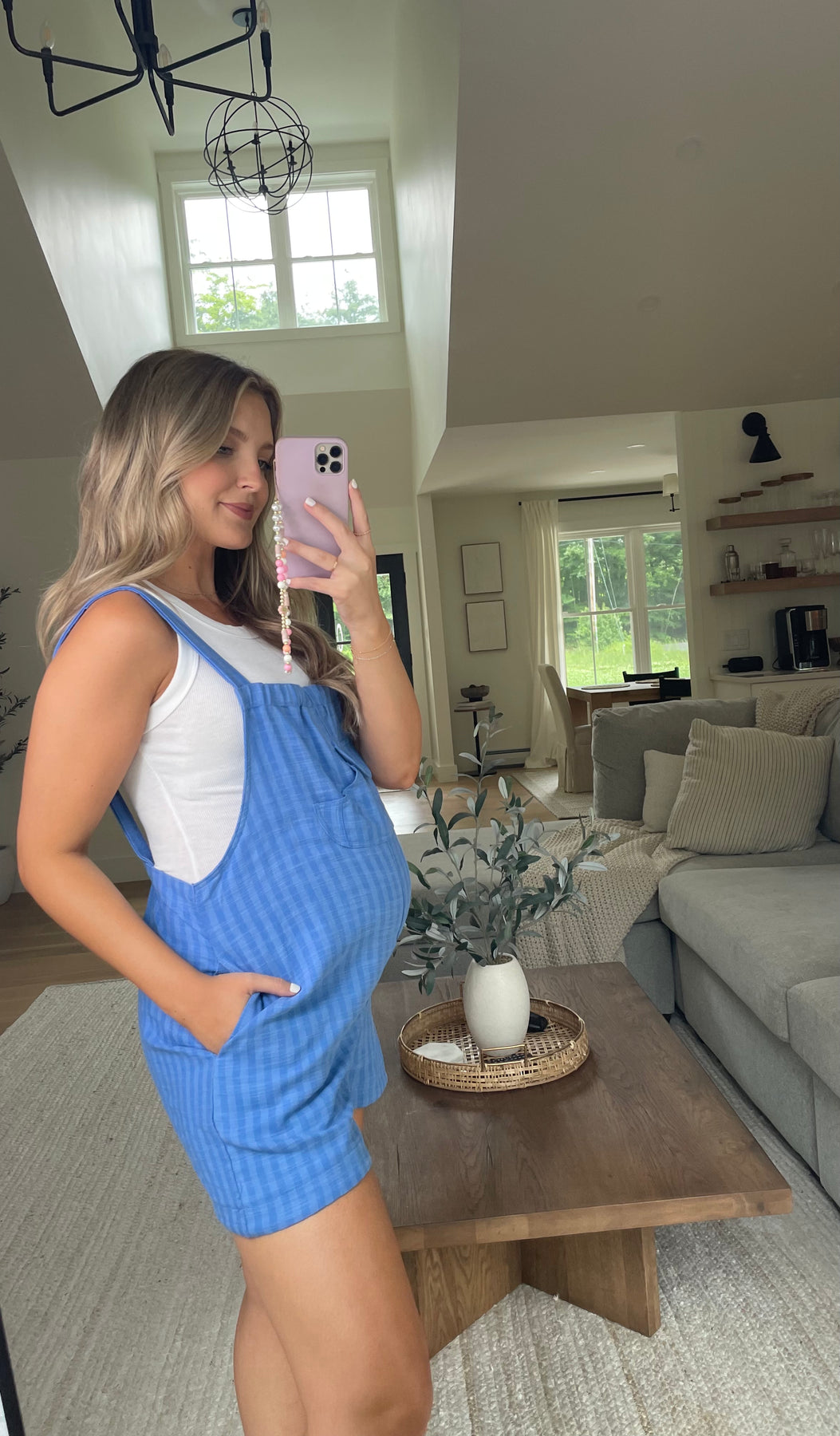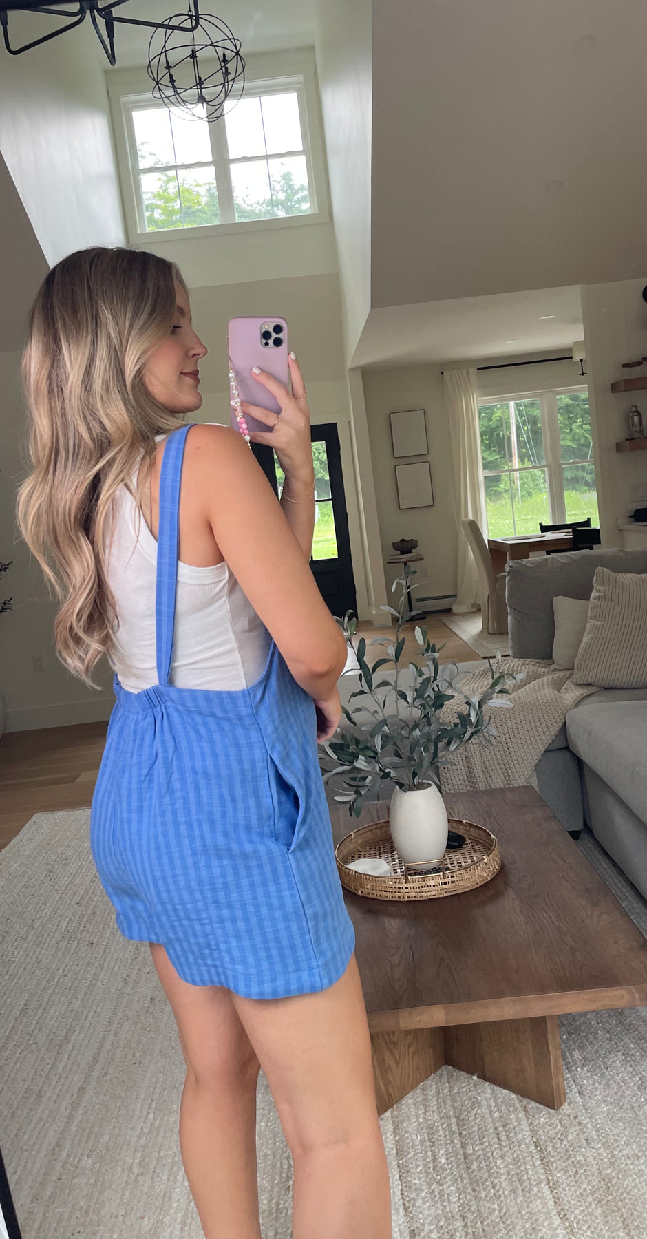 Suspender style overall romper with elastic waist, adjustable straps, pockets and front pocket detail