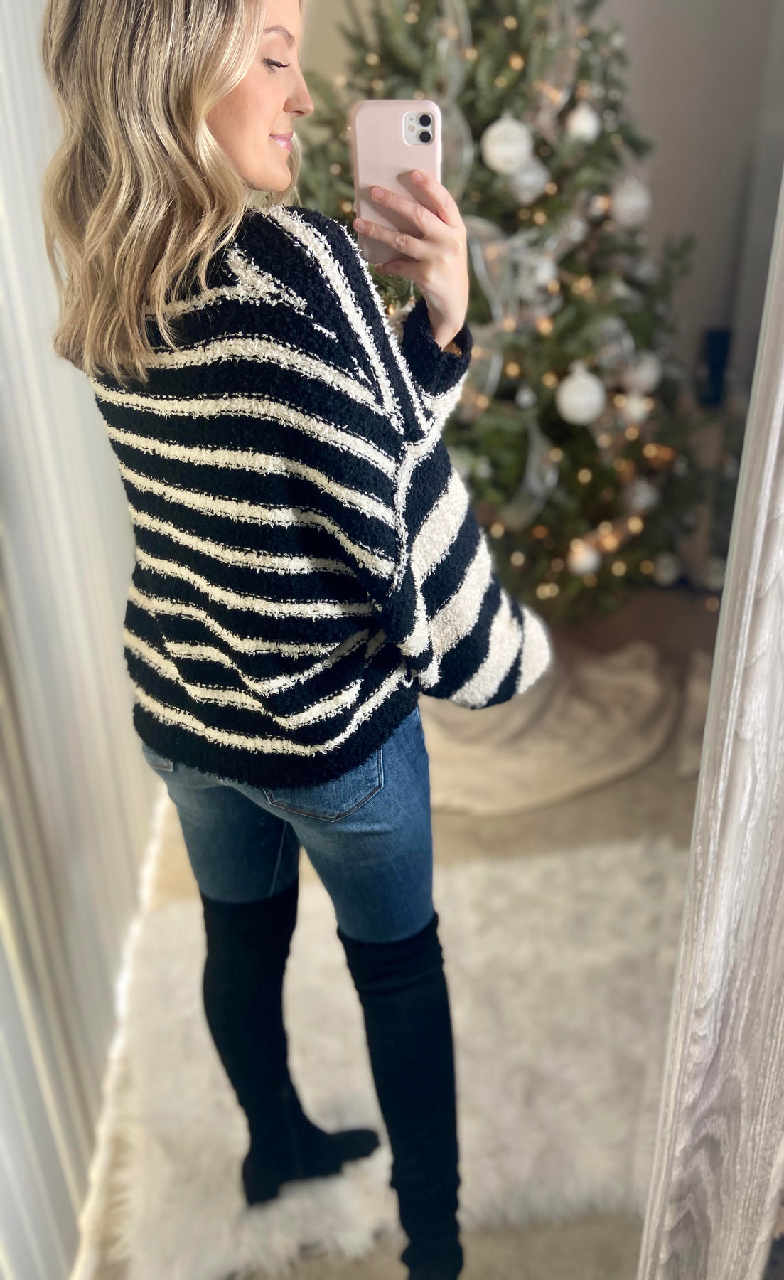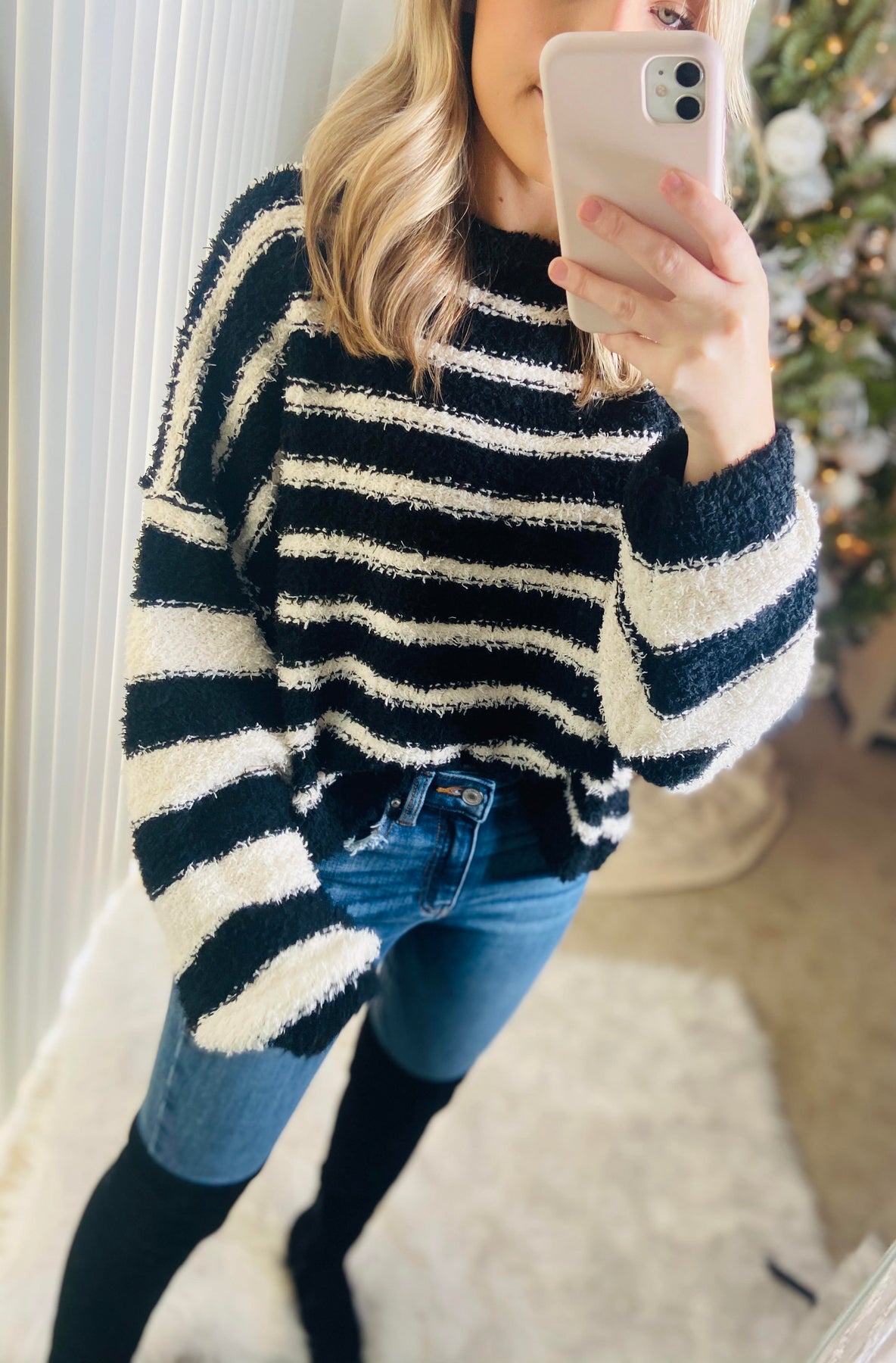 Fuzzy striped pullover sweater featuring a long dolman sleeve, boat neckline and loose fit with hi-lo hem