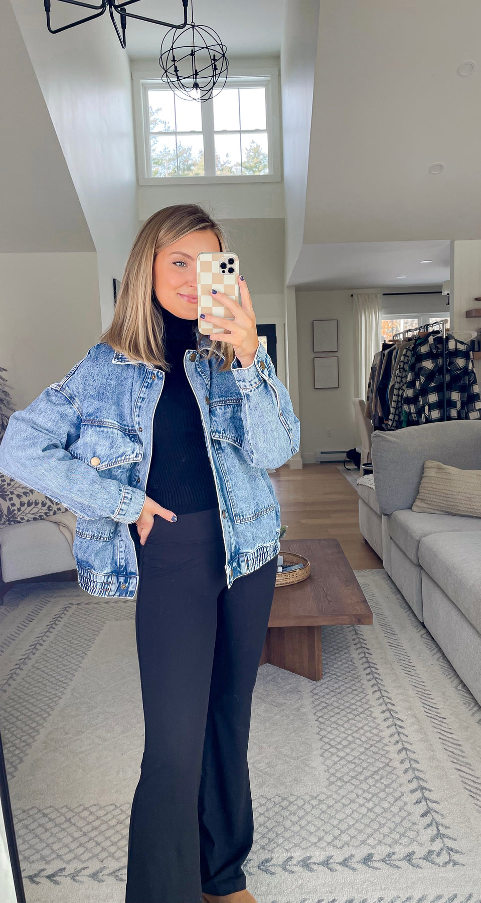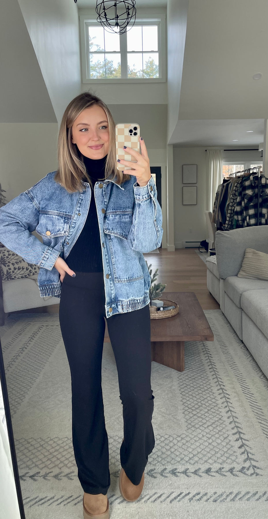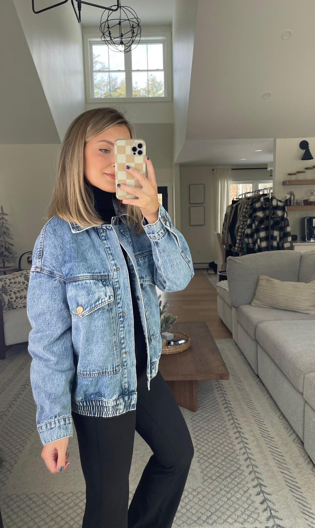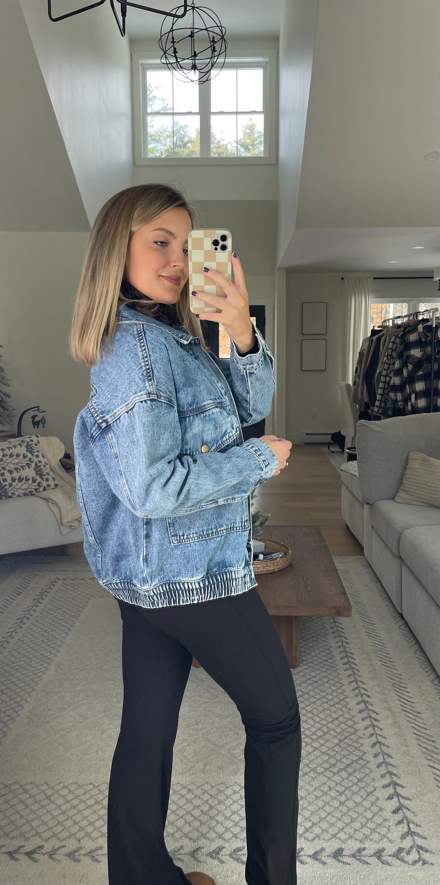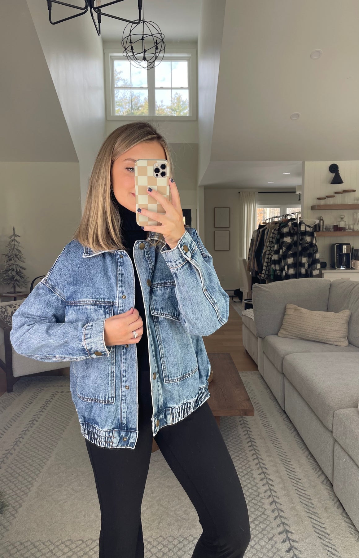 Oversized acid washed denim jacket with front button closure and elastic waist band