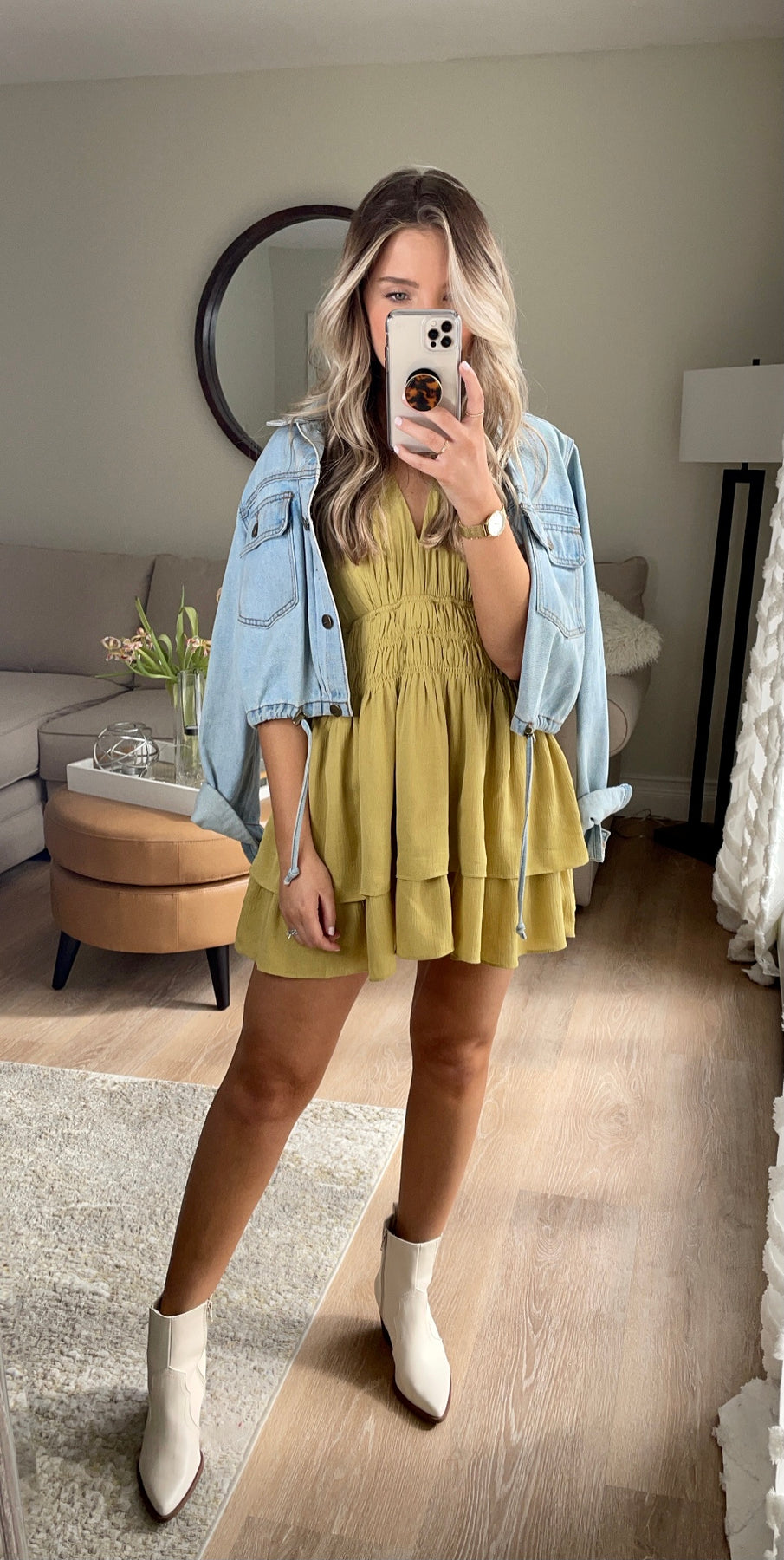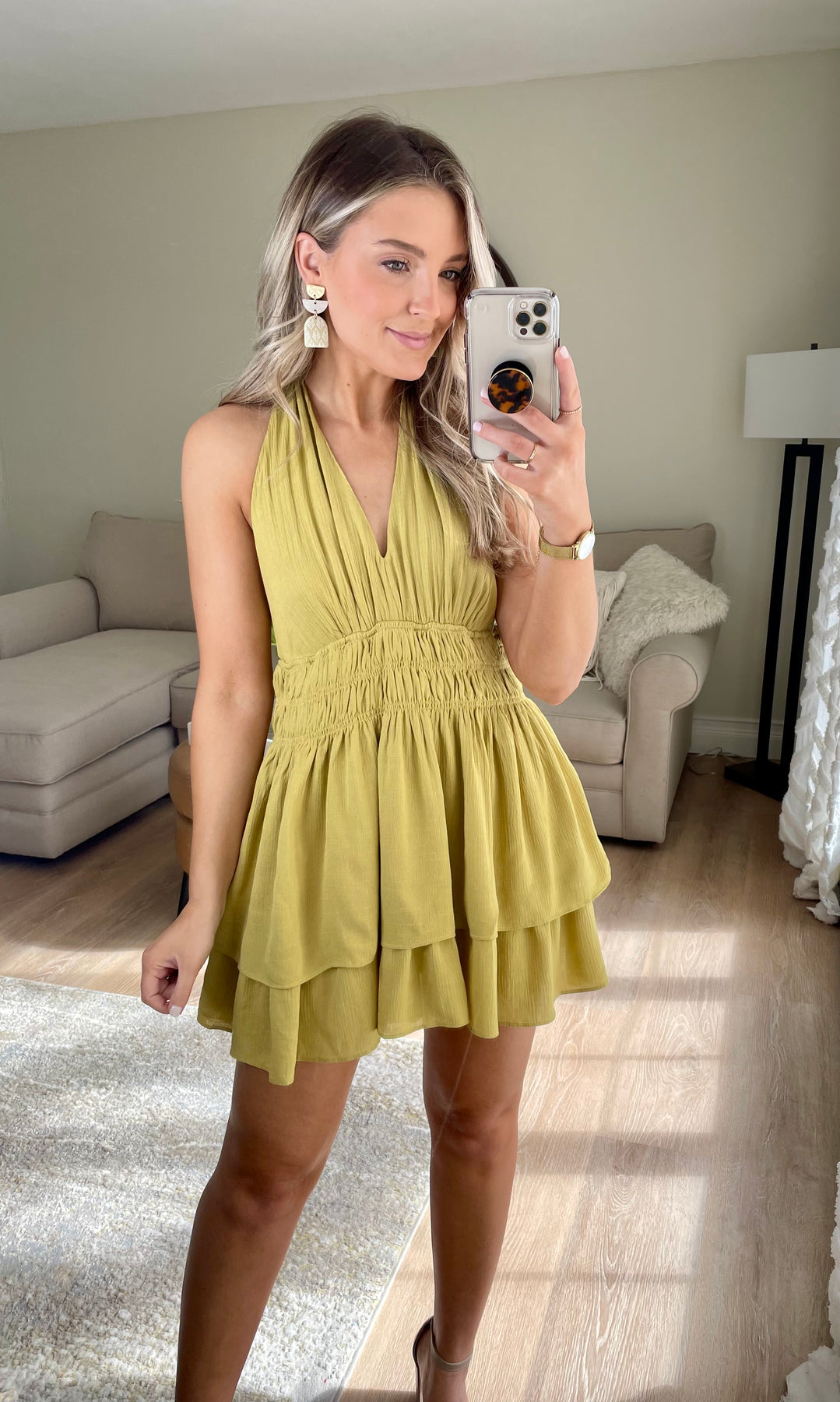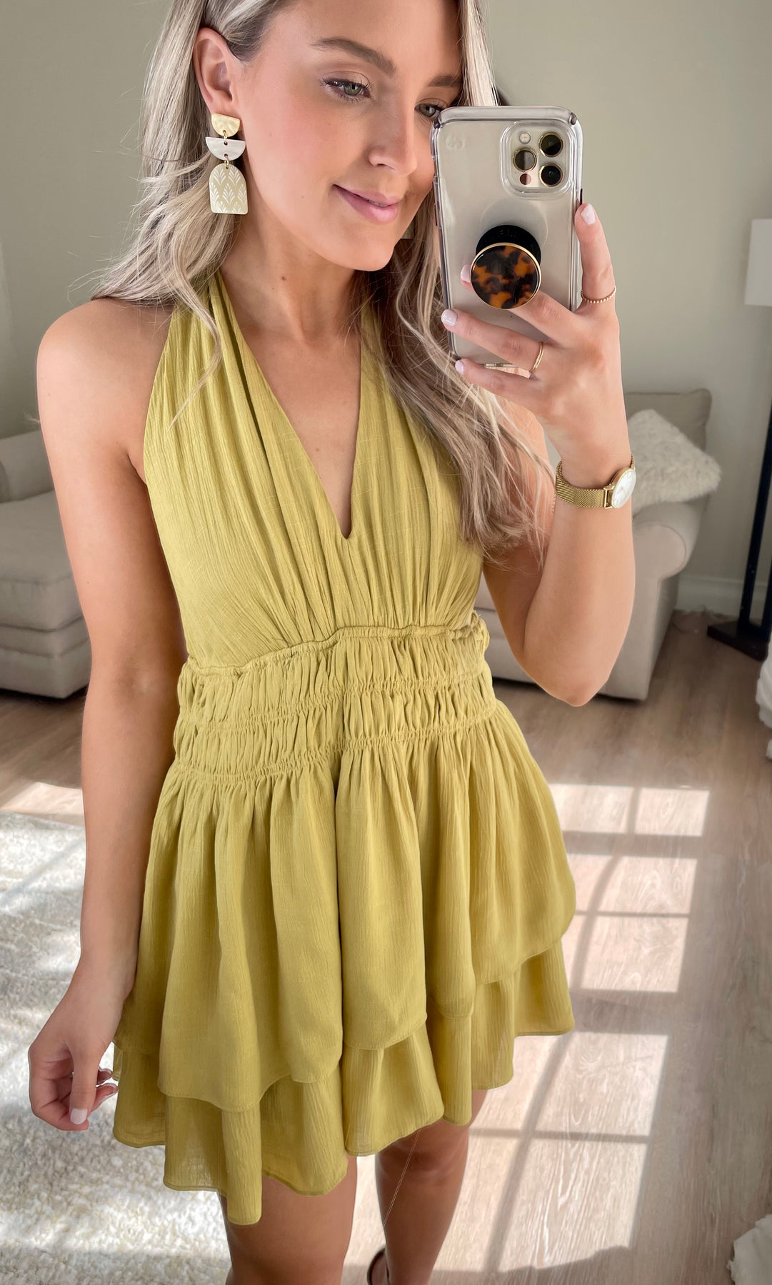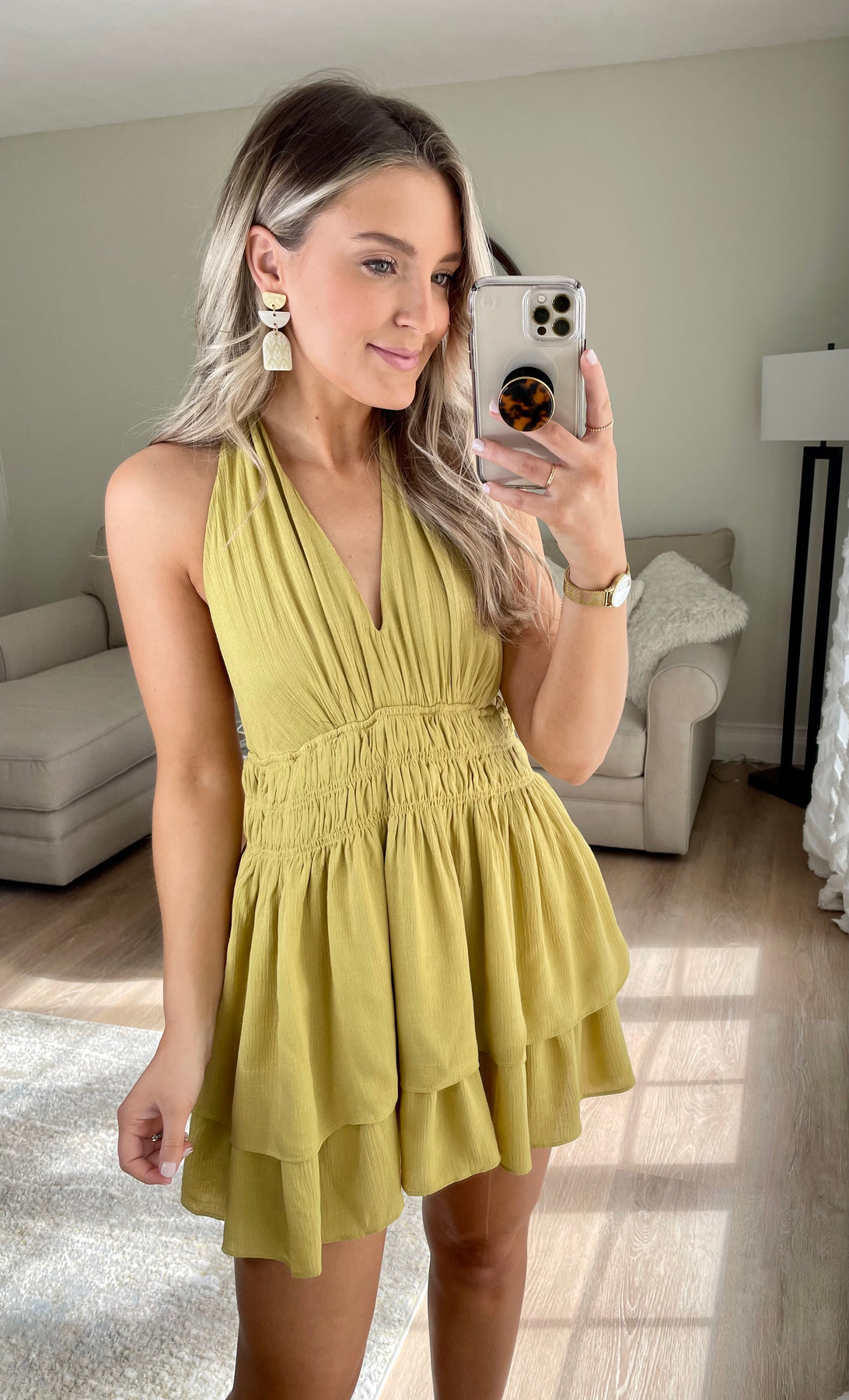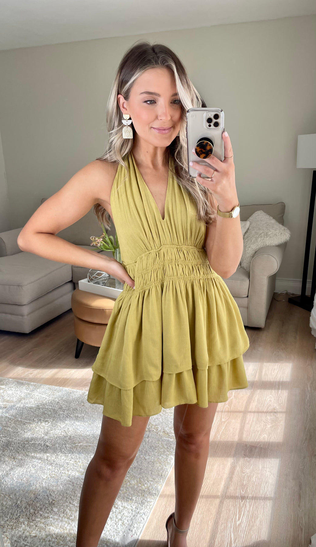 Deep-V halter neckline dress with smocked waist and tiered skirt