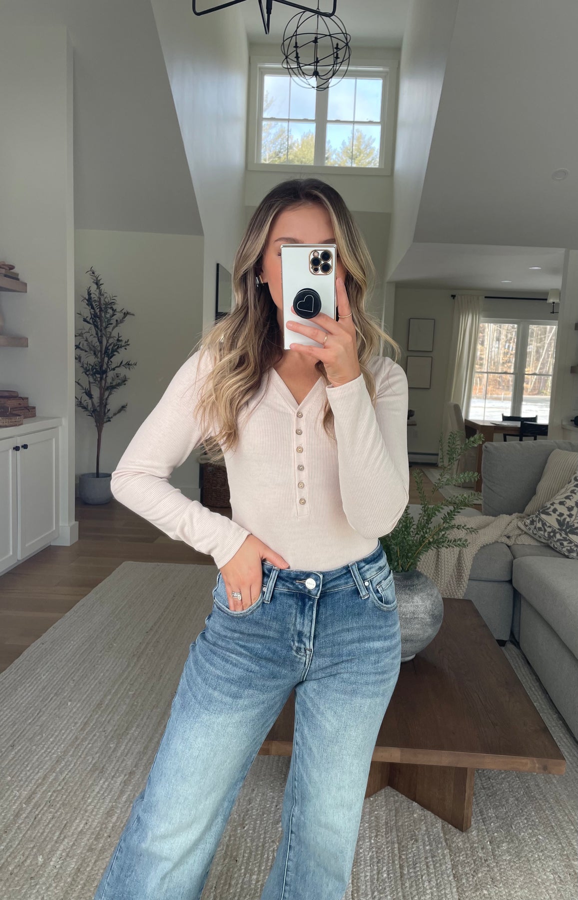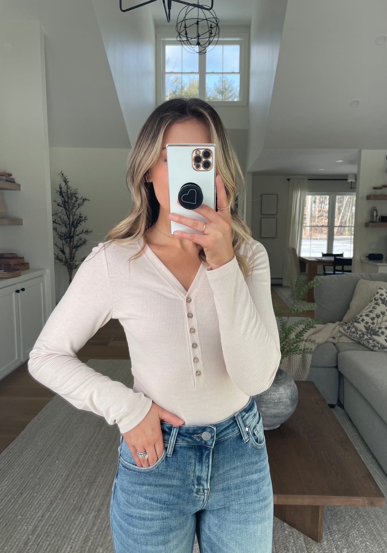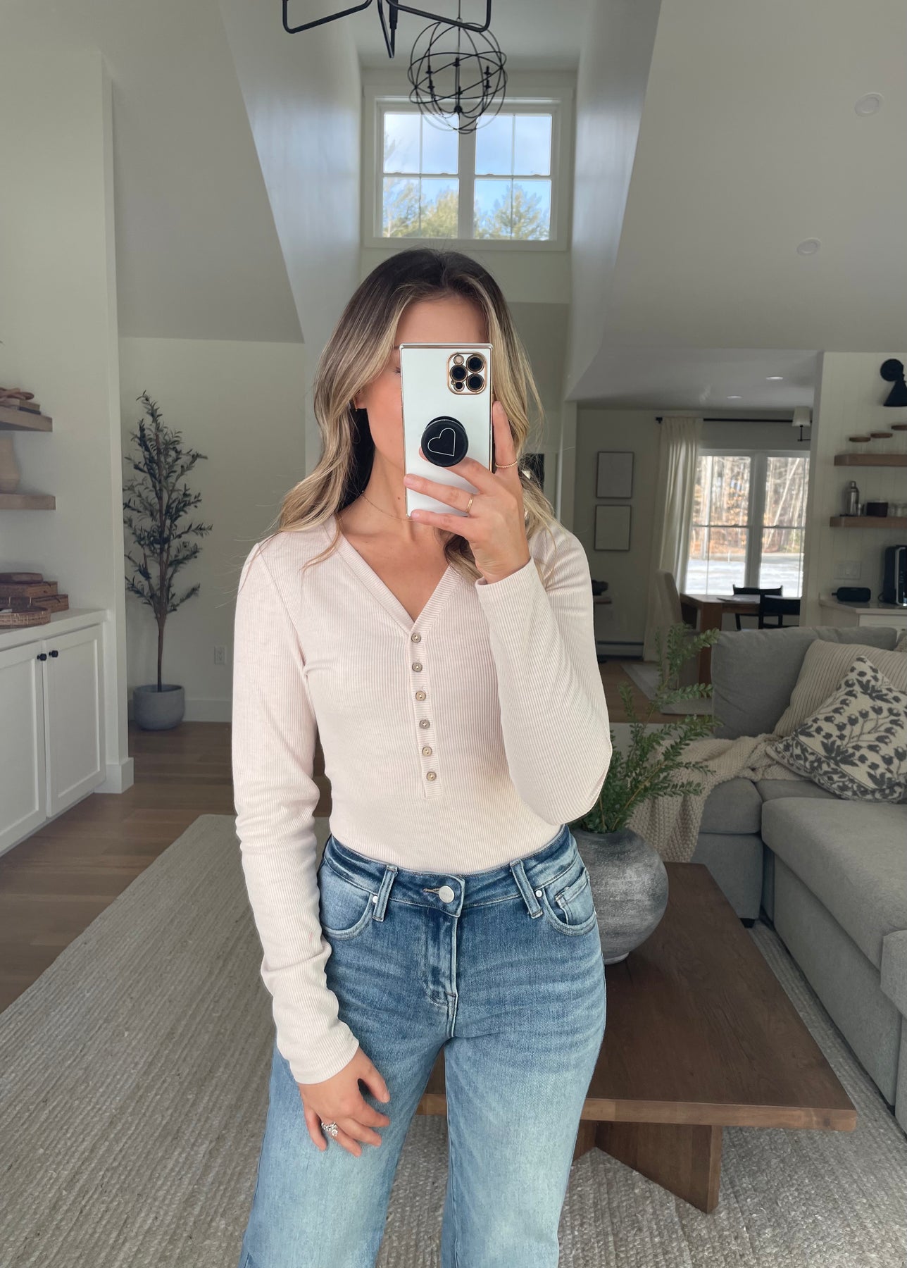 Ribbed knit henley bodysuit with v-neckline and wooden button detail. Snap button closure