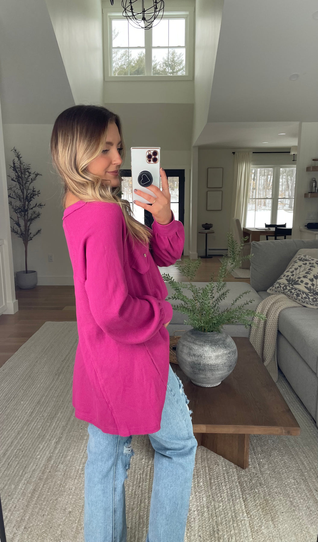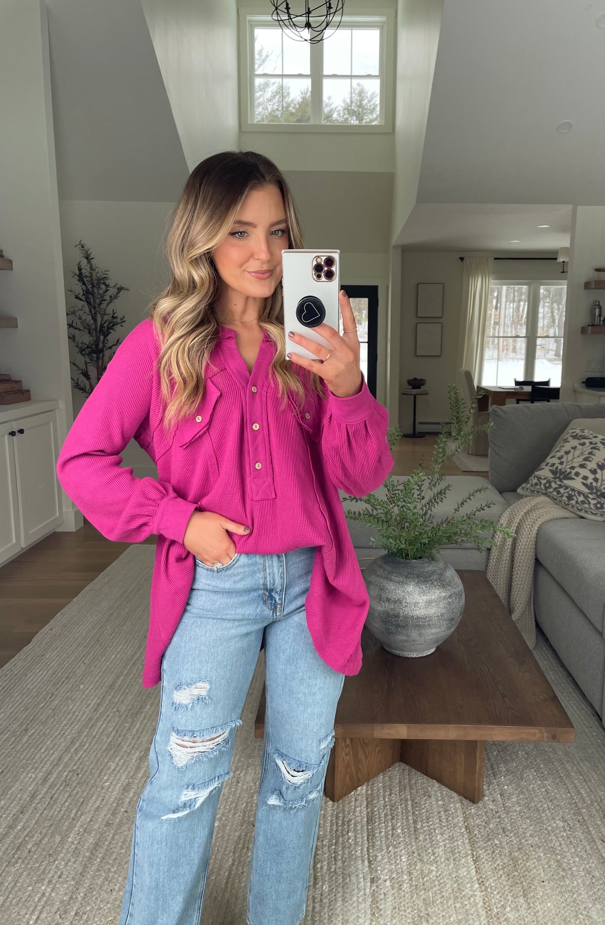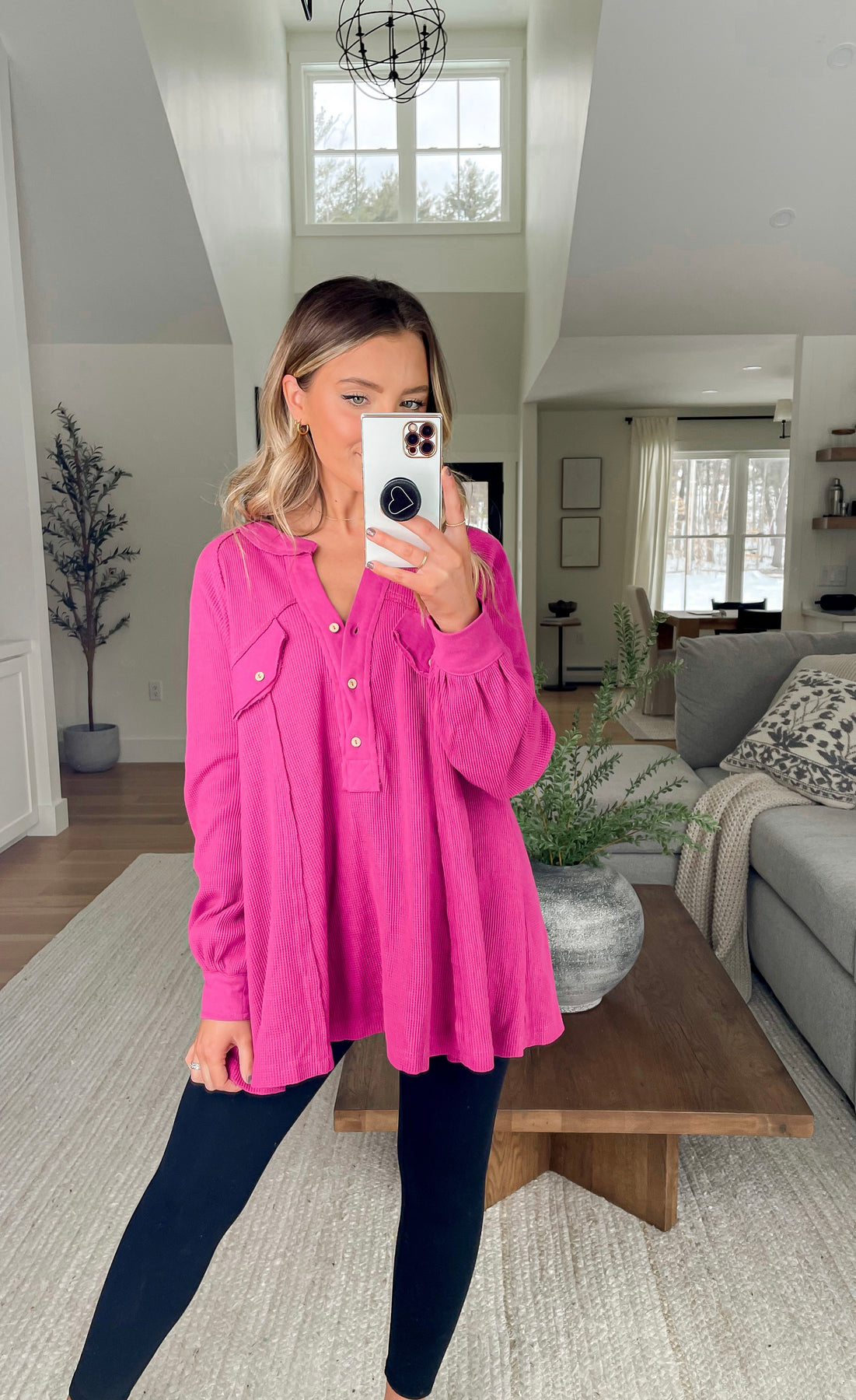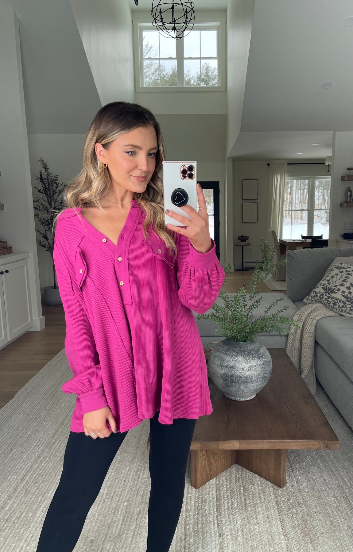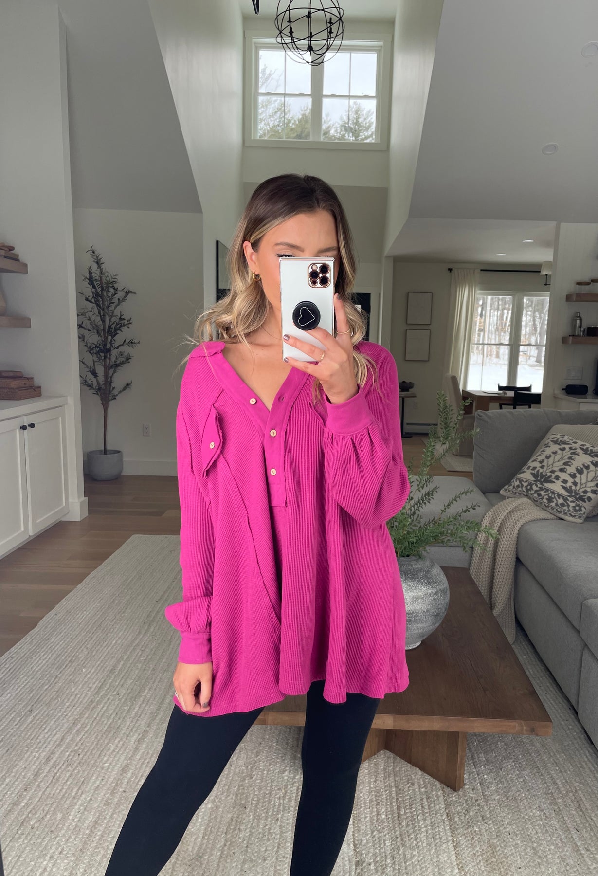 Tunic length waffle knit henley style top with exposed seam detailing and an oversized fit