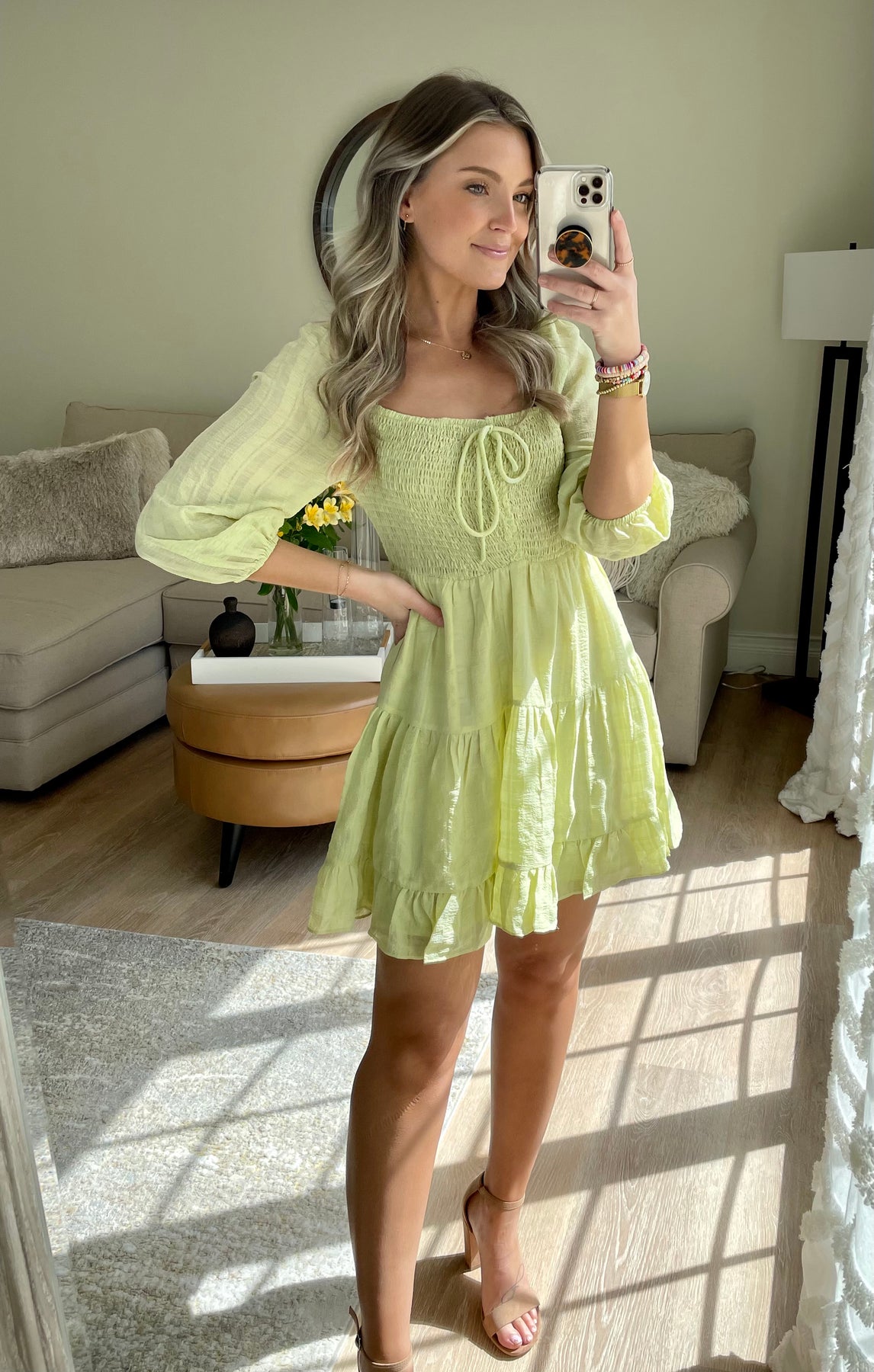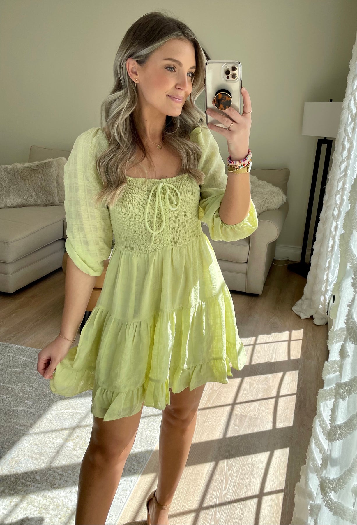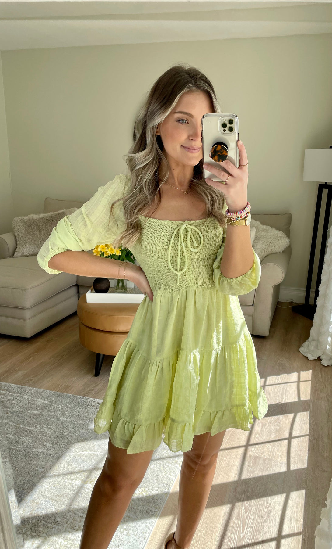 • Light lime green square neck mini dress with smocked chest, 3/4 length sheer sleeve, flowy sheer bodice with lining