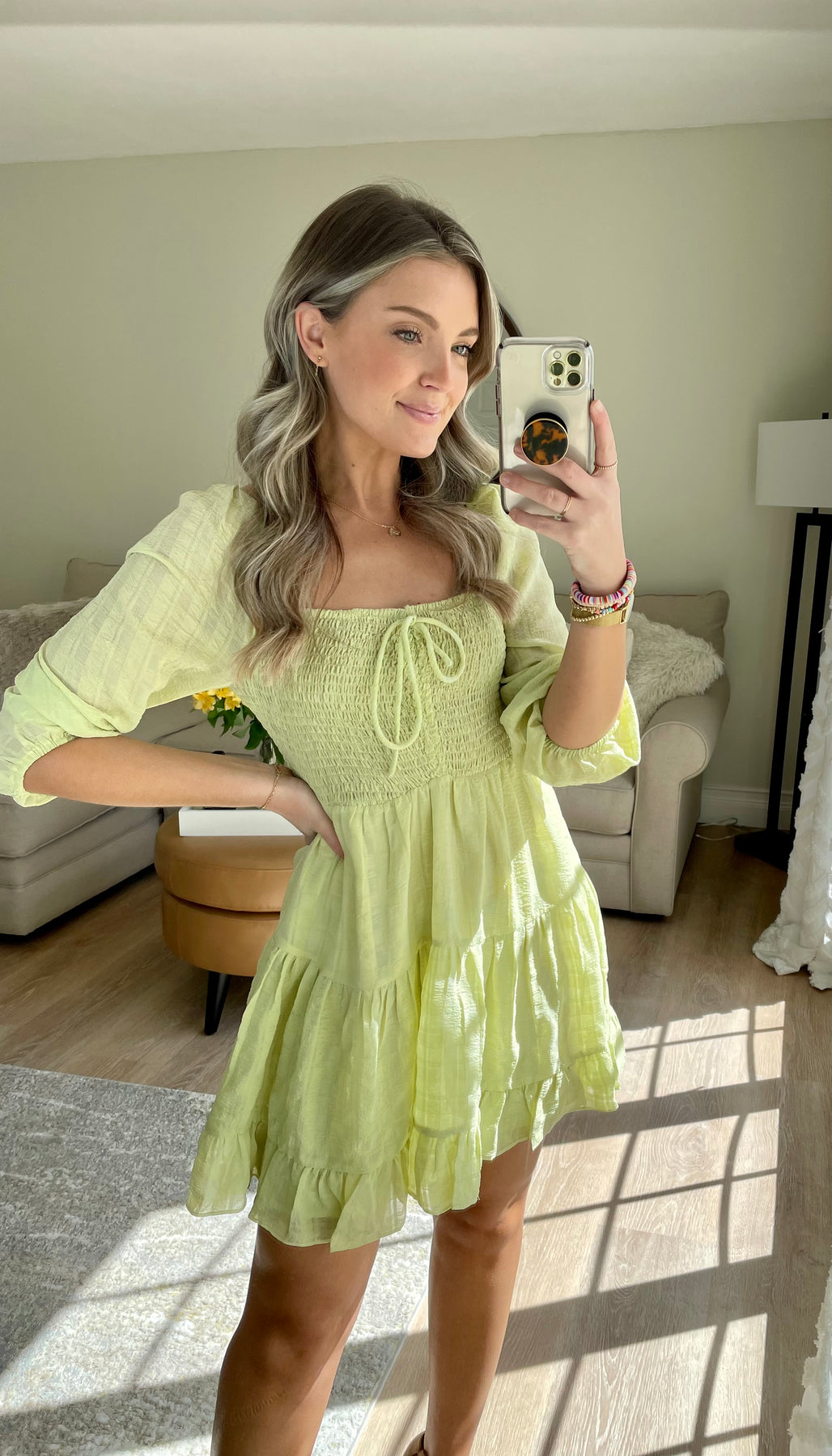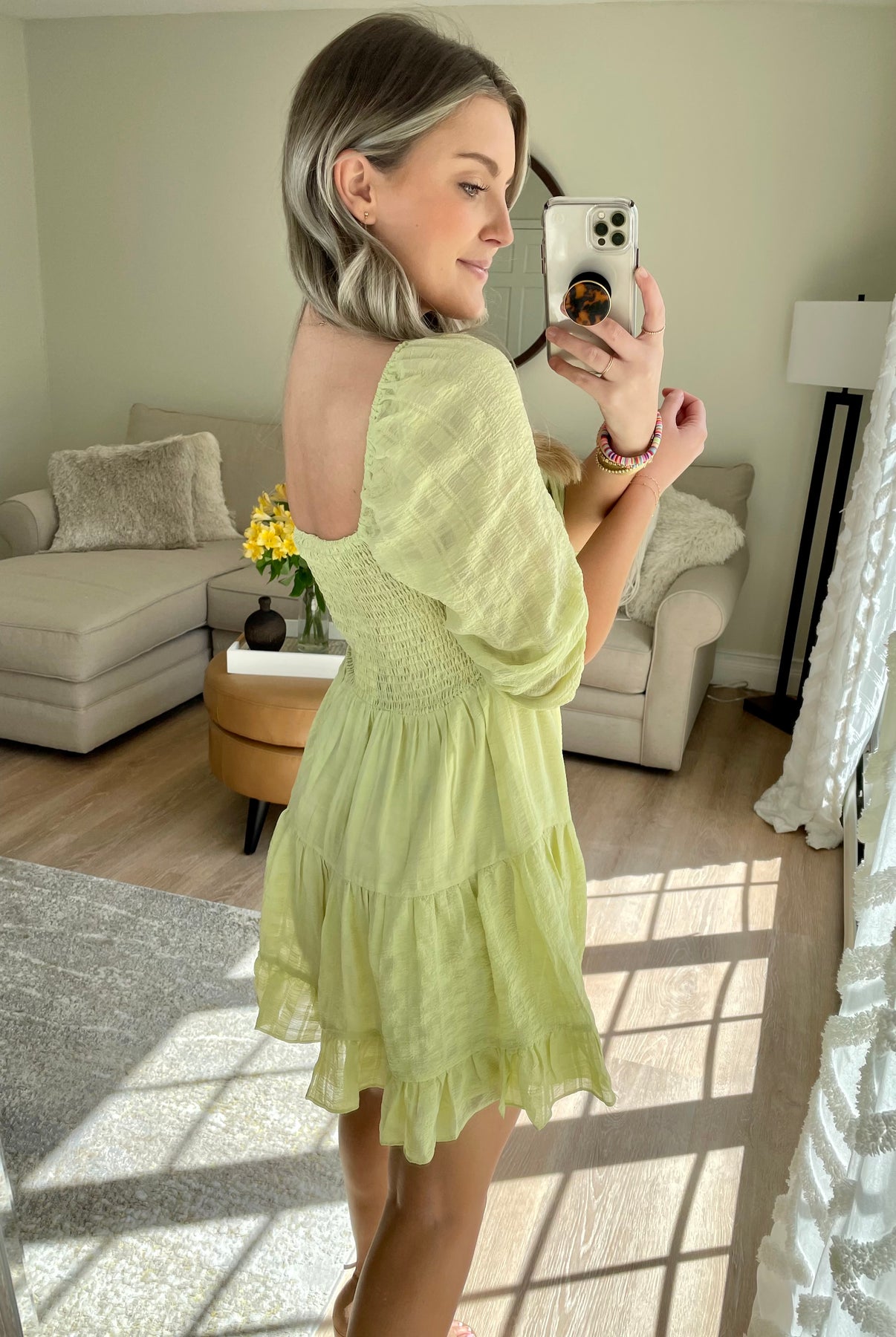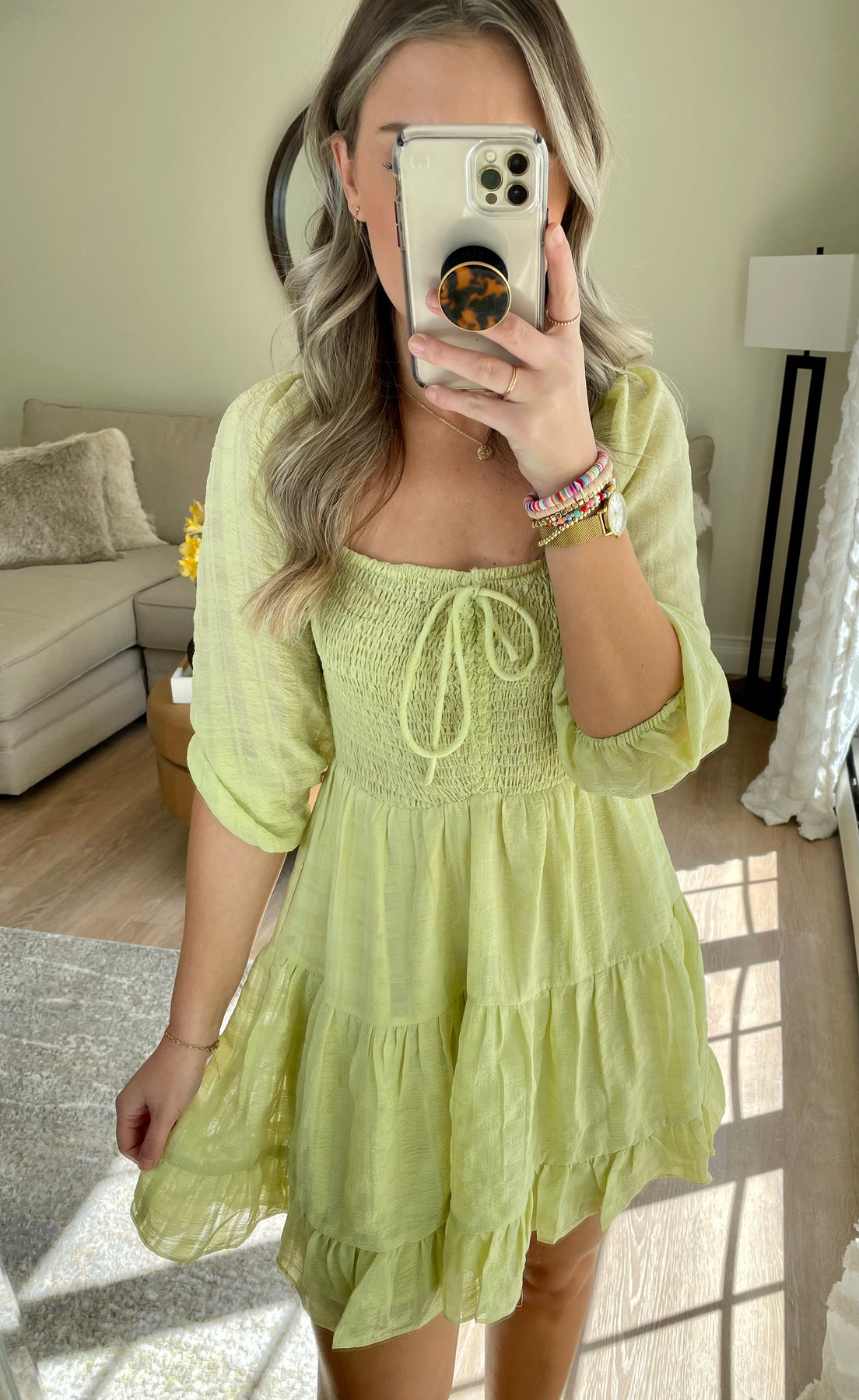 • Light lime green square neck mini dress with smocked chest, 3/4 length sheer sleeve, flowy sheer bodice with lining
