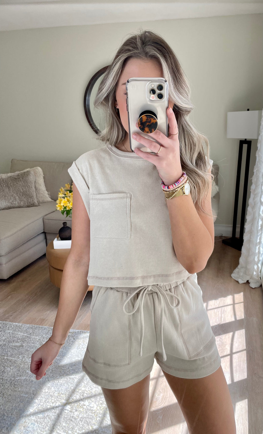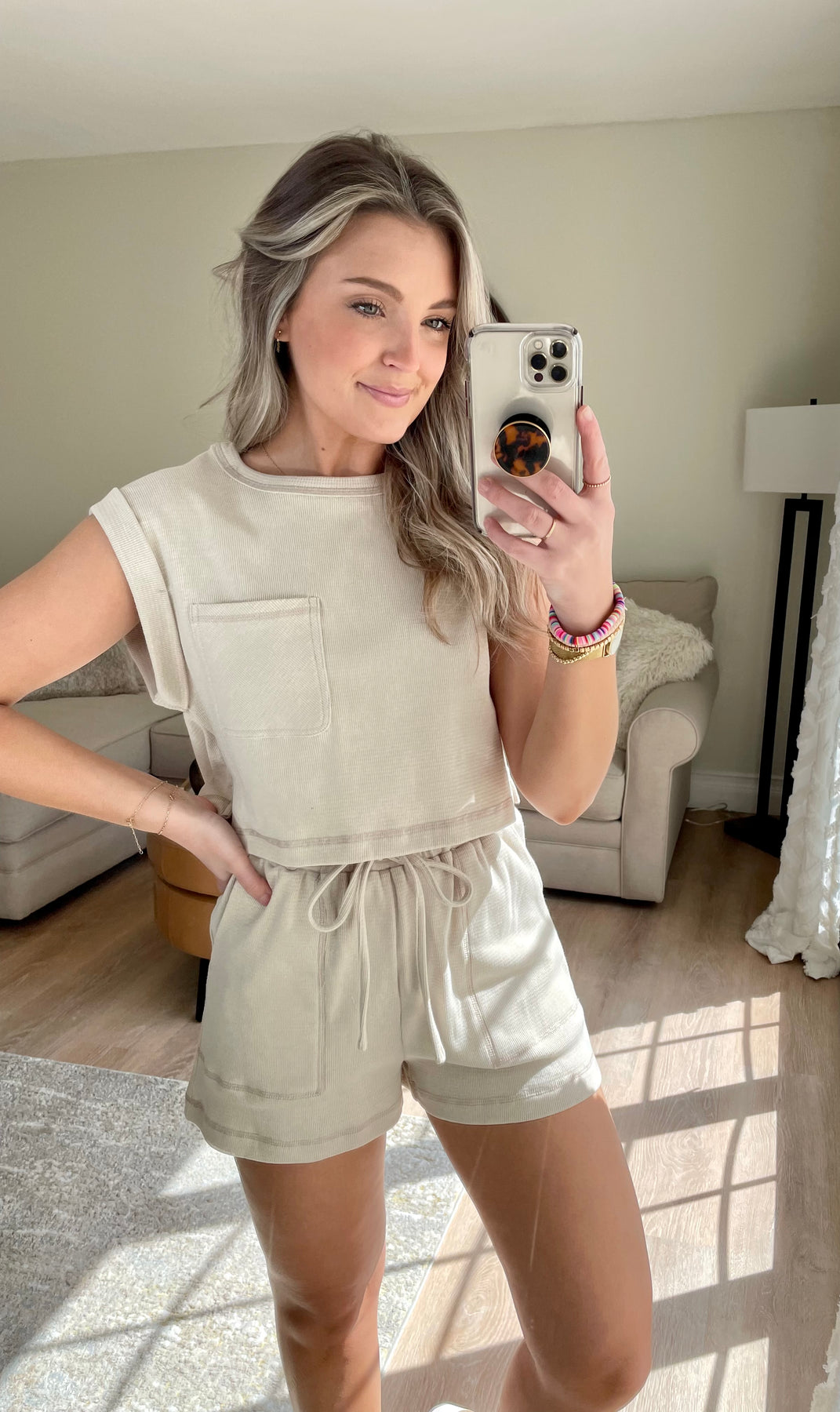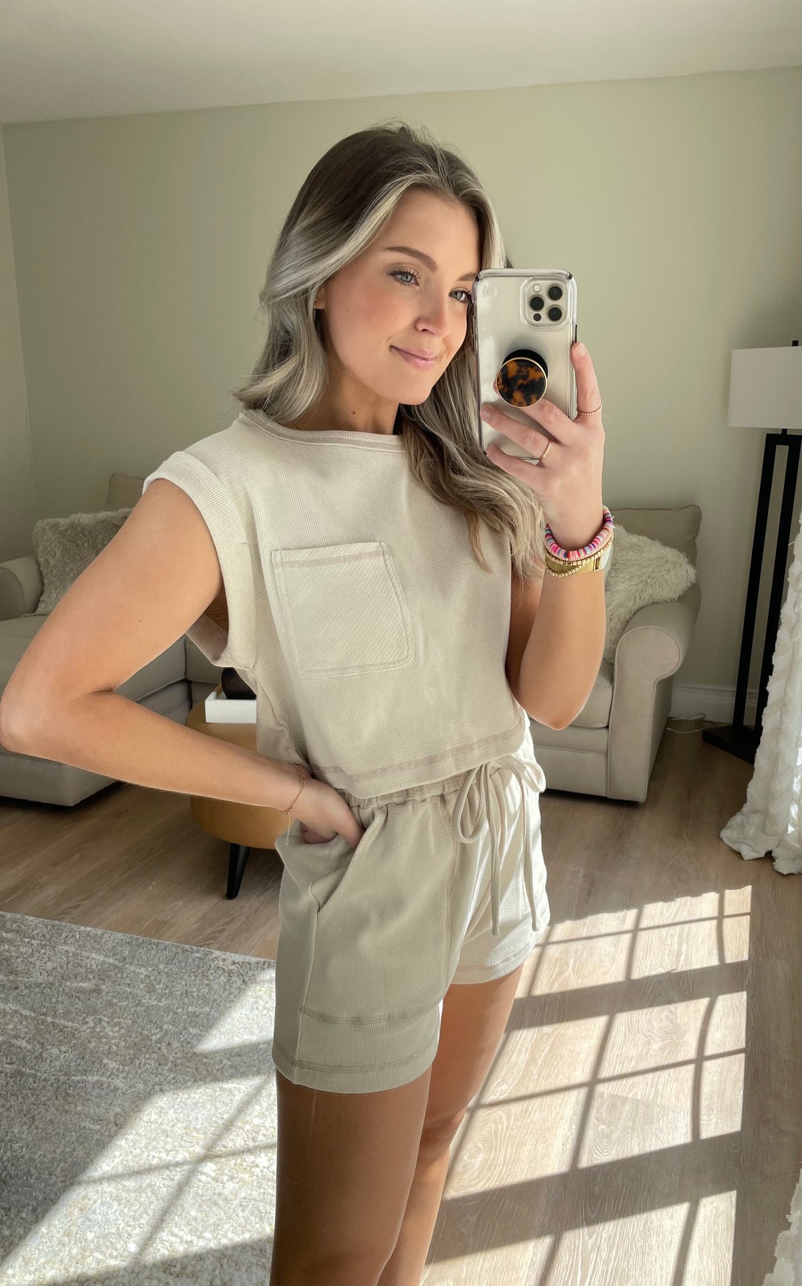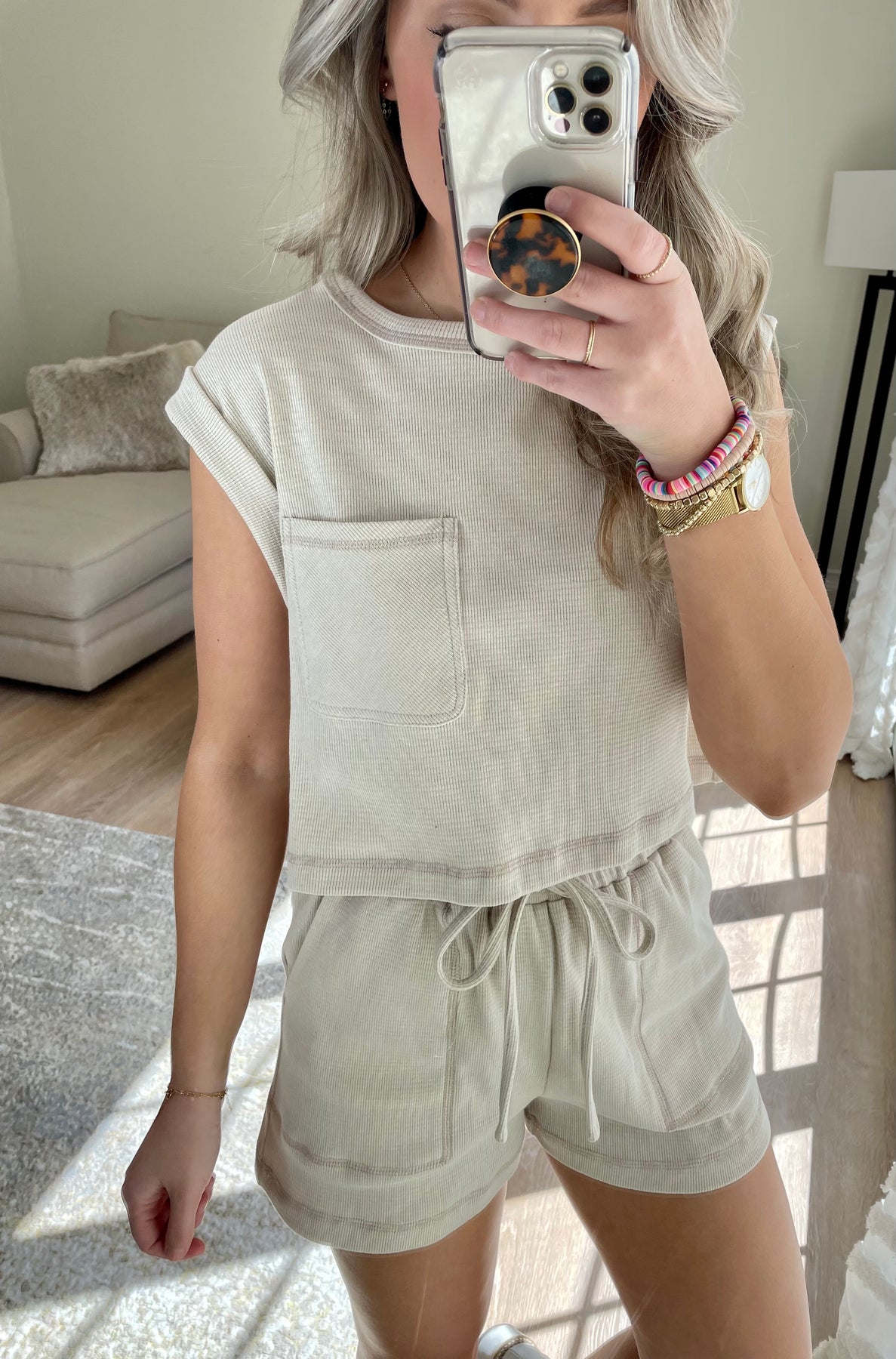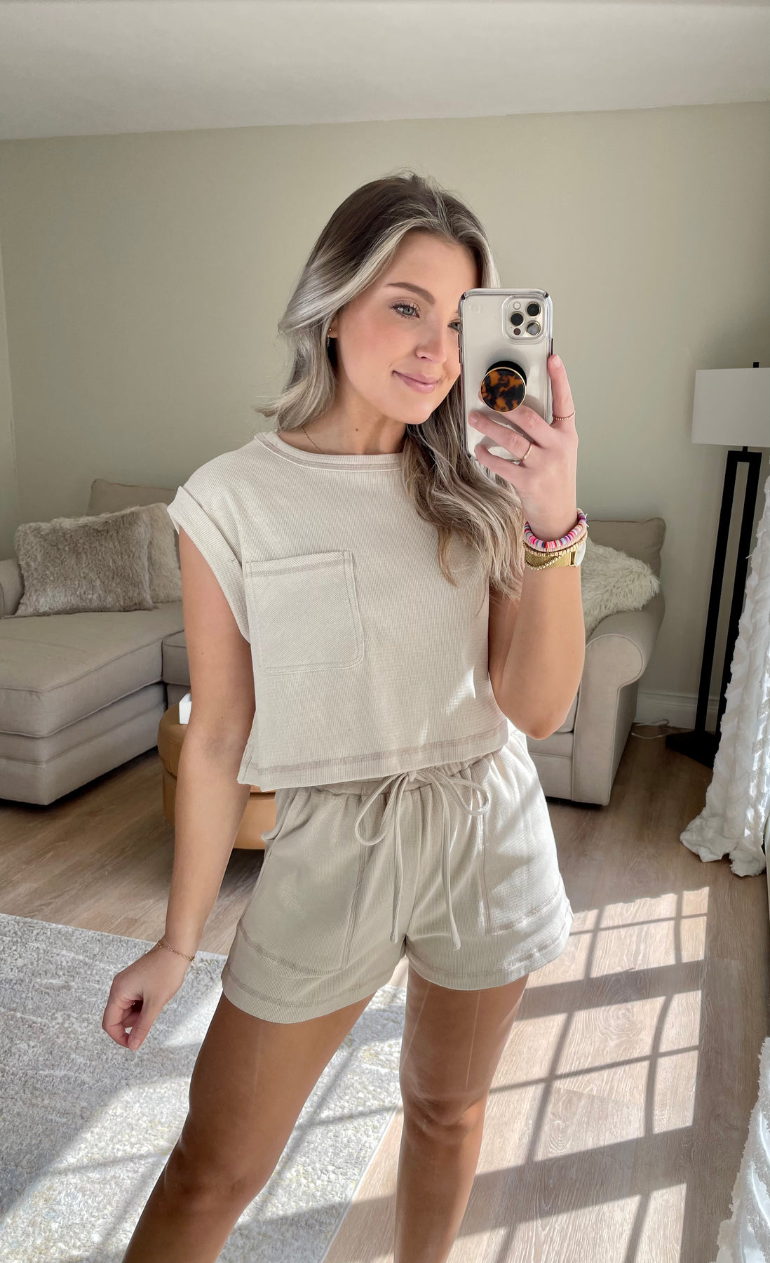 Two piece set featuring smocked waist shorts with adjustable draw string and side pockets, and cropped top with cap sleeve and crew neckline