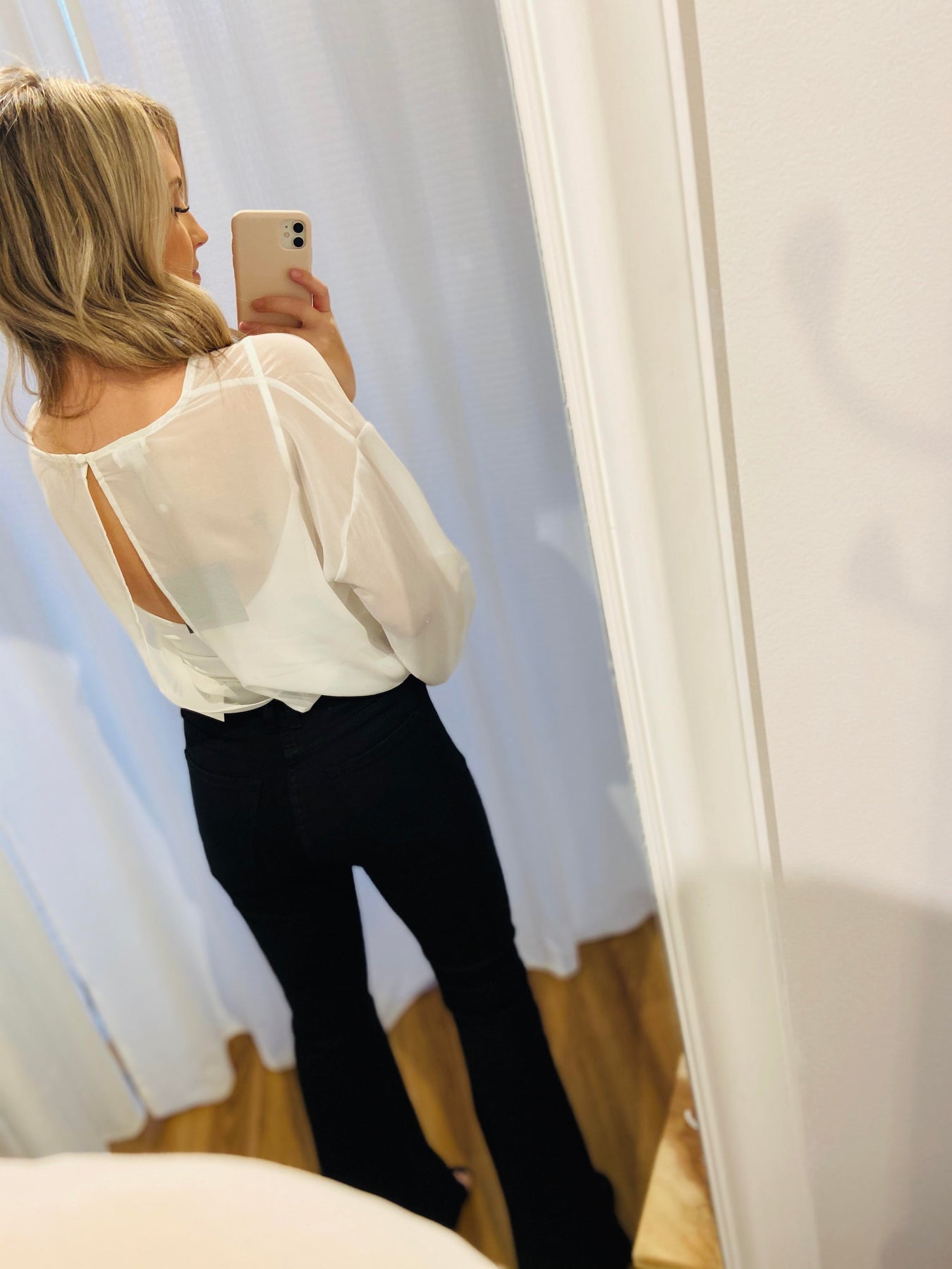 Sold white tank top bodysuit with attached sheer long sleeve over top, all one piece! Tank is a thick material but not padded!