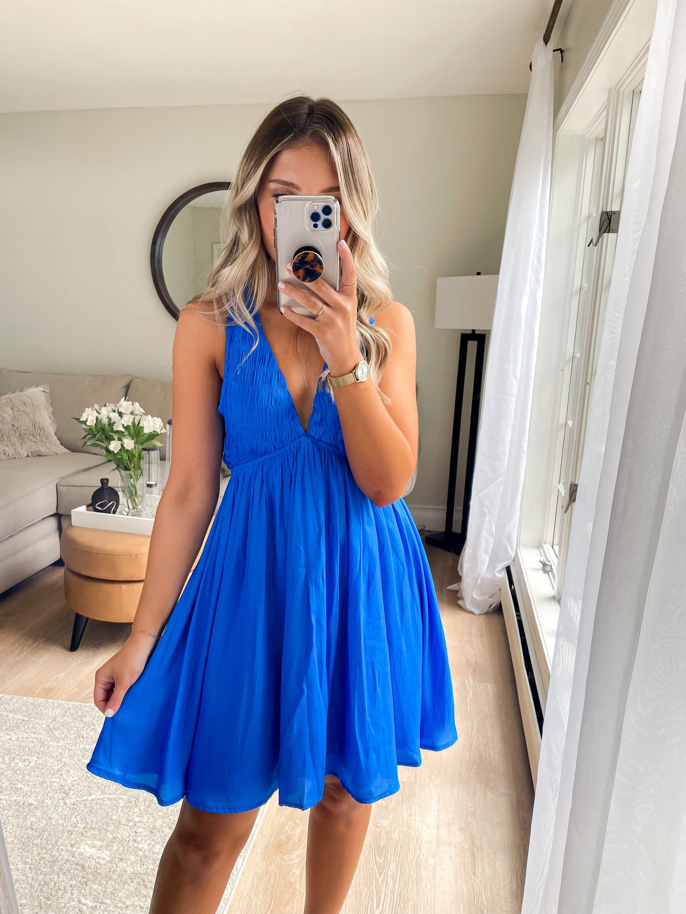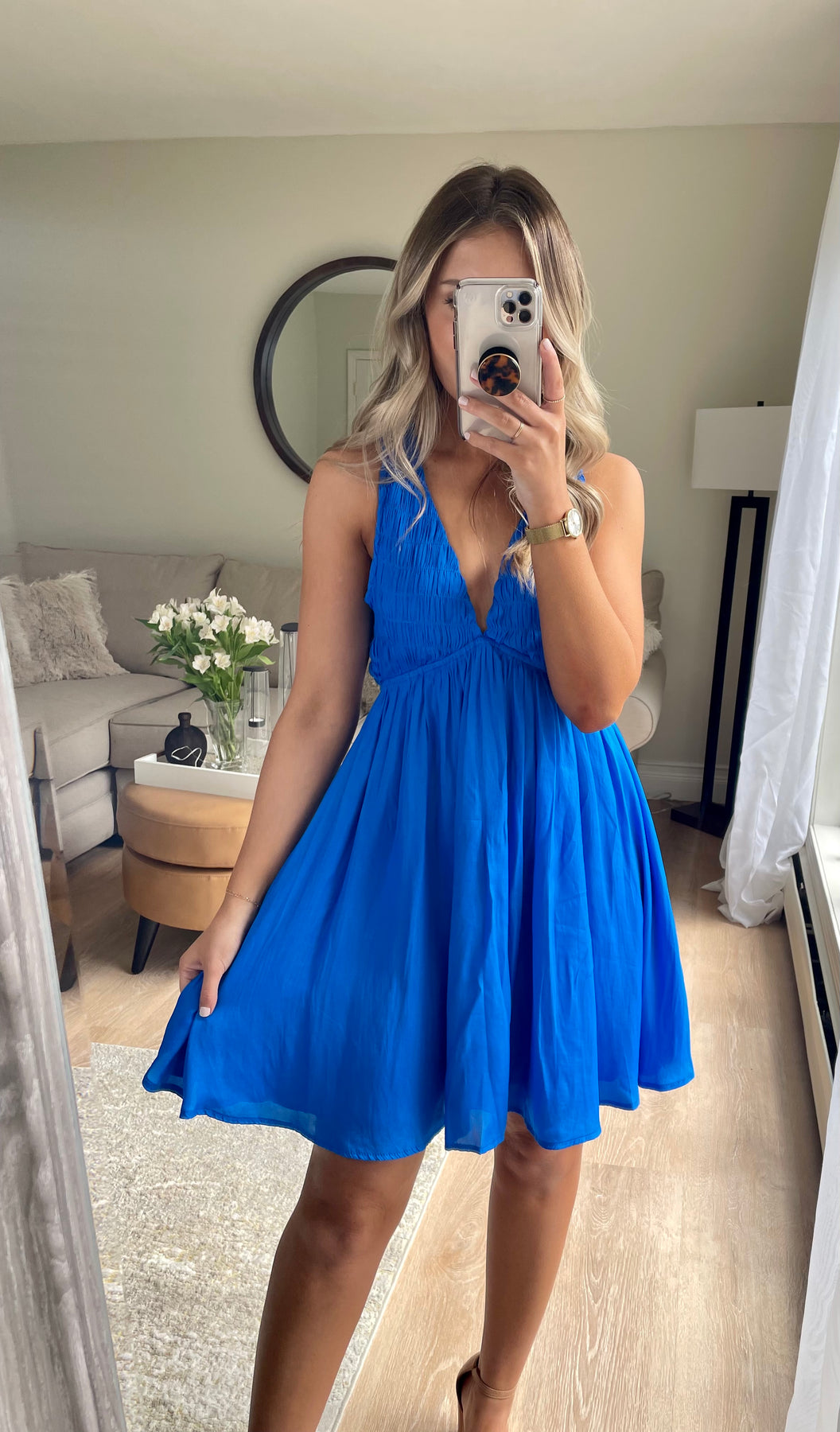 V-neckline dress with smocked chest, fully lined flowy silhouette, and back opening with adjustable tie