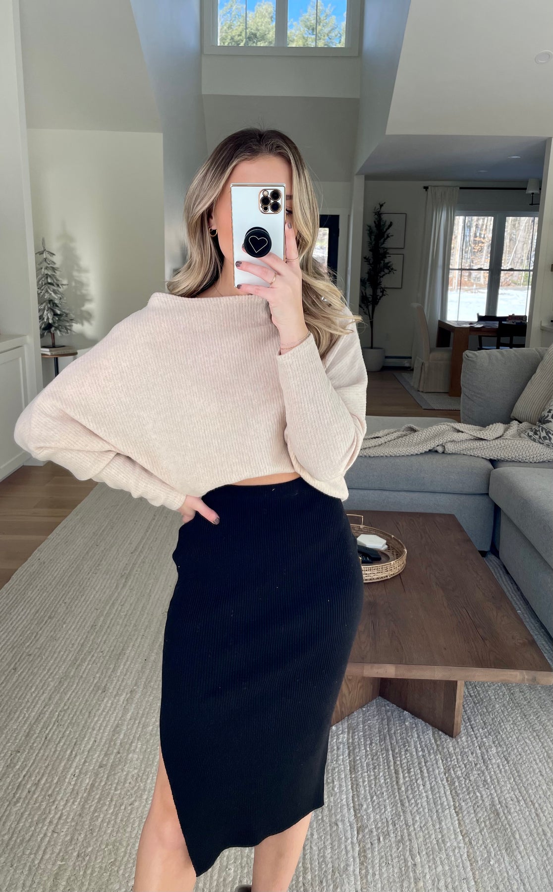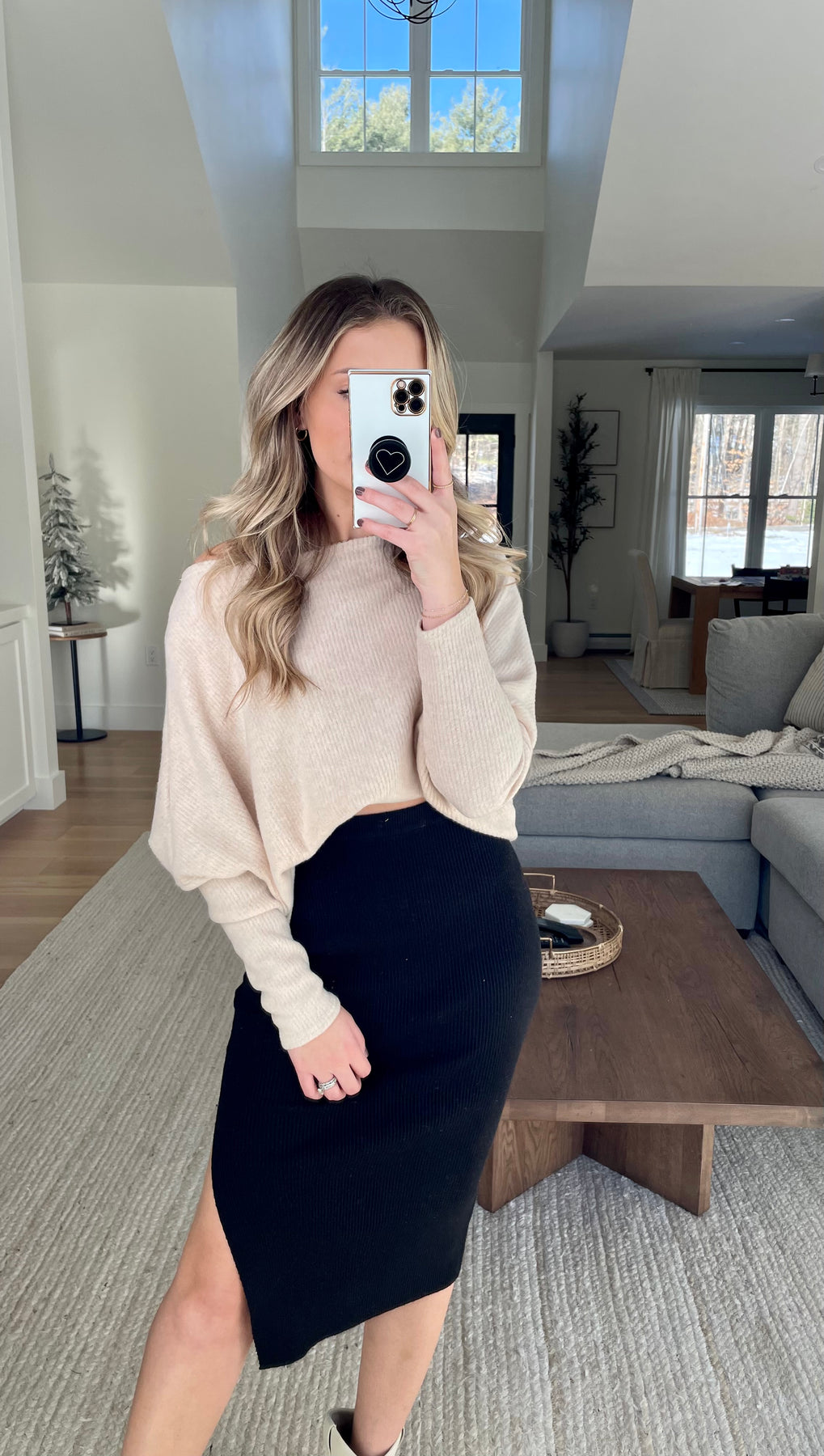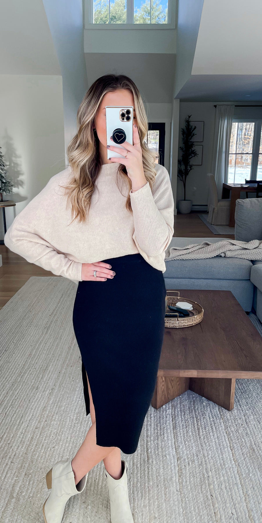 Ribbed soft knit pencil skirt with a bodycon sihlouette and side slit