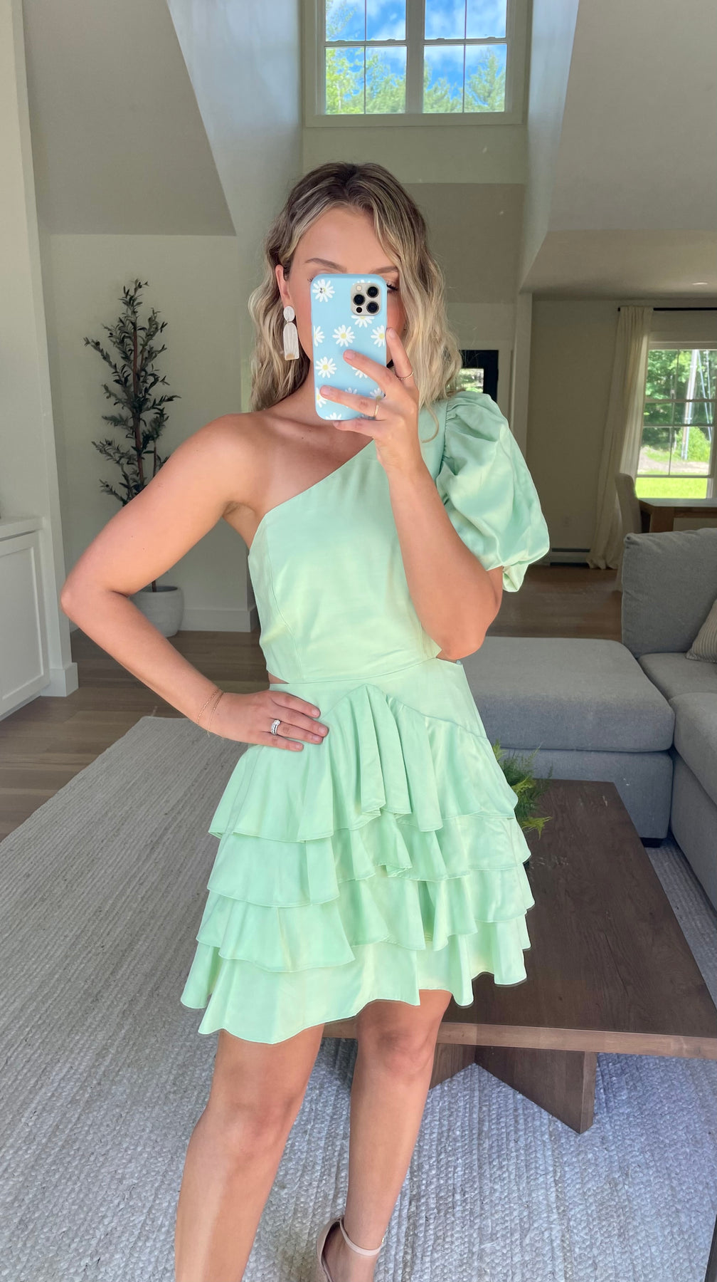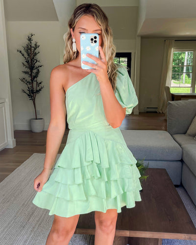 Minted One Shoulder Ruffle Dress
