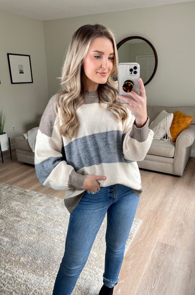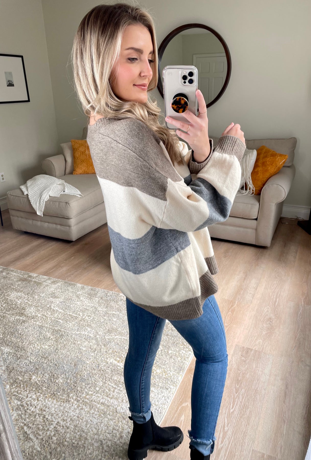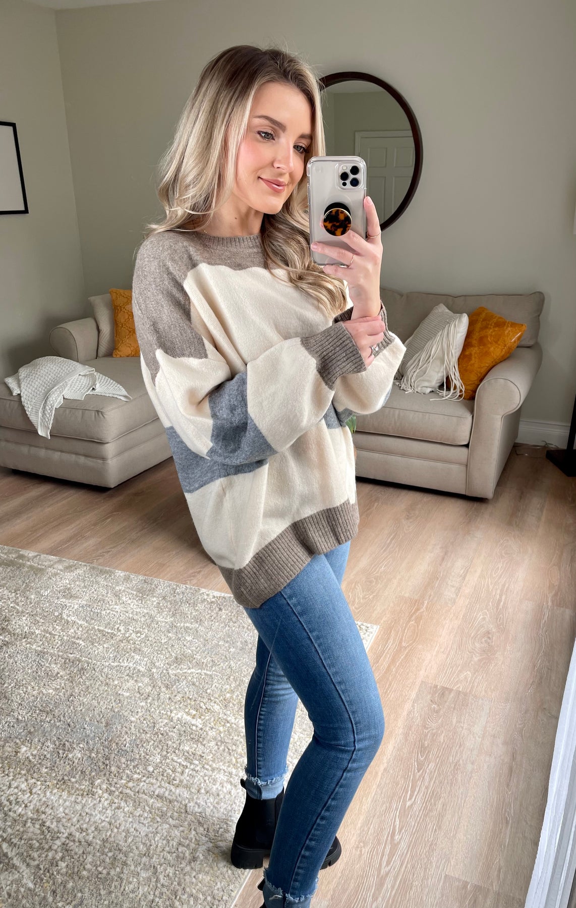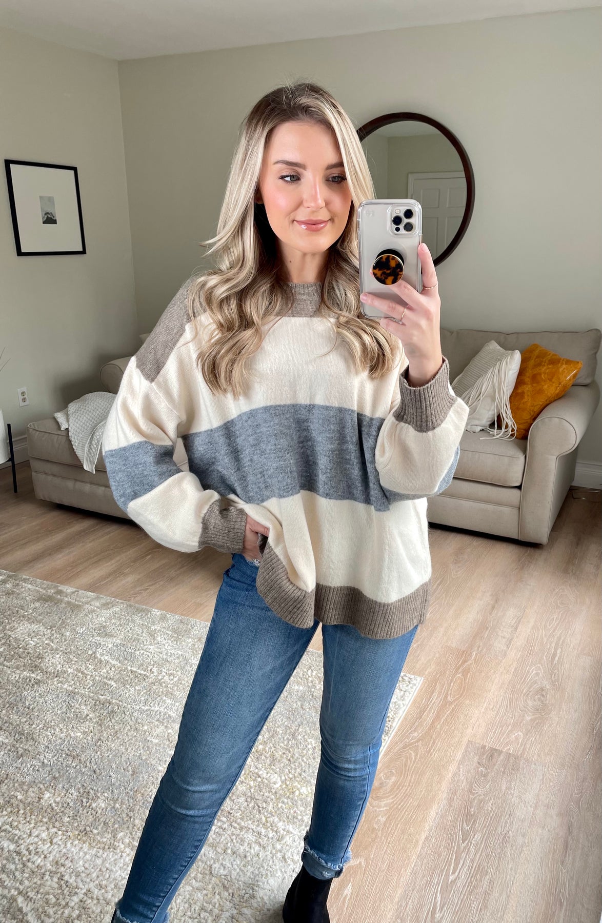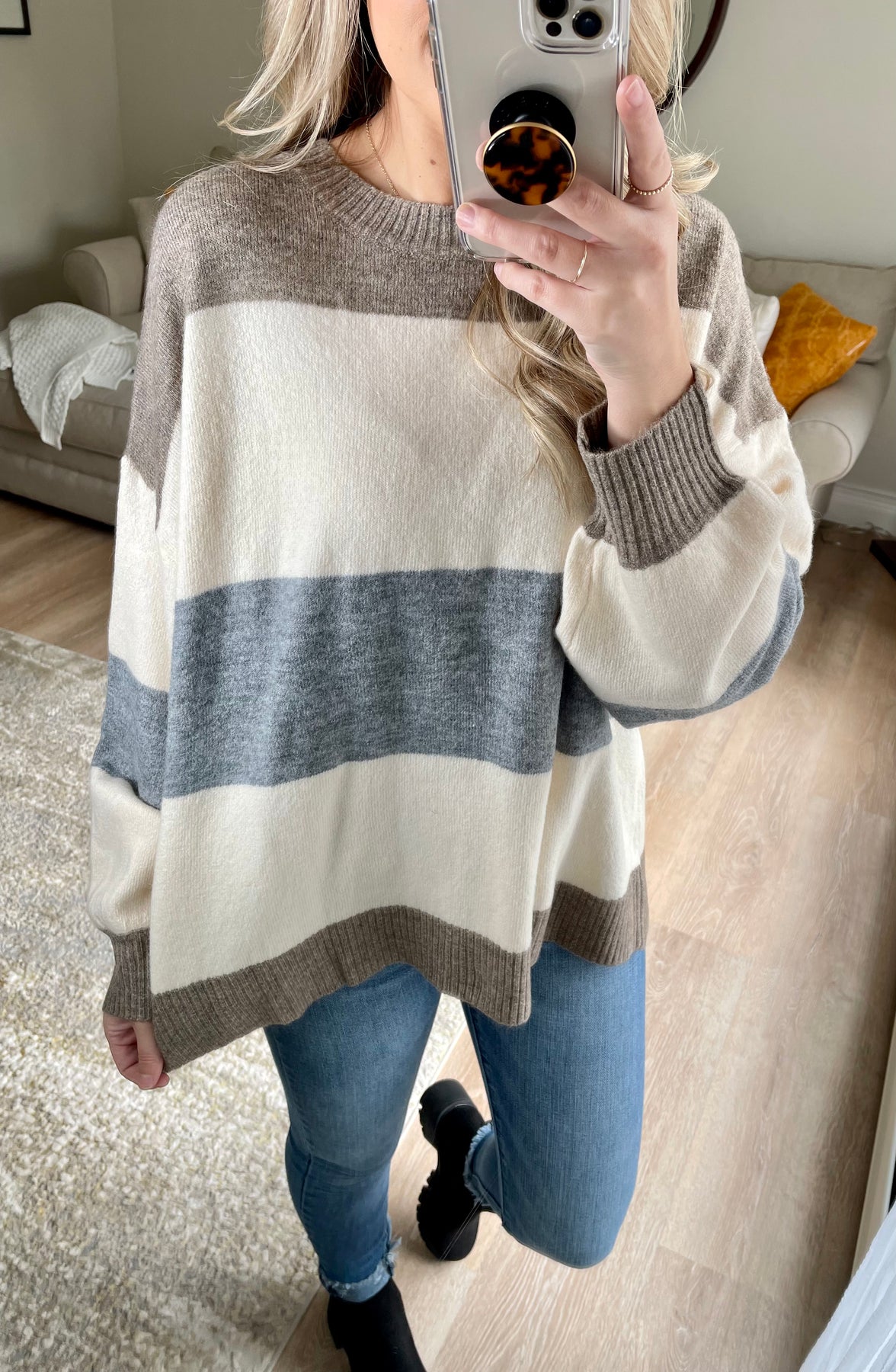 Multi color striped sweater with oversized fit, long sleeves and round neckline