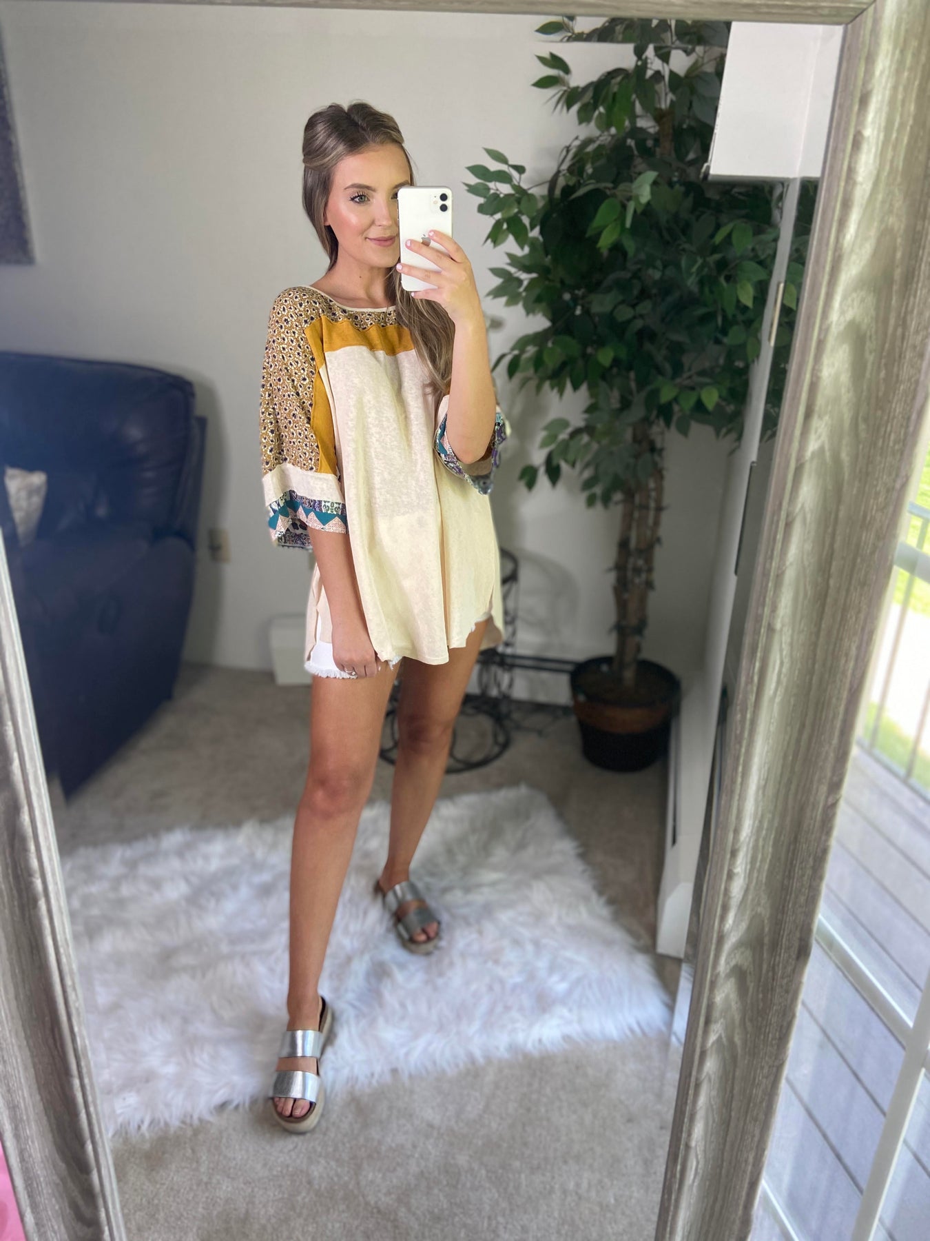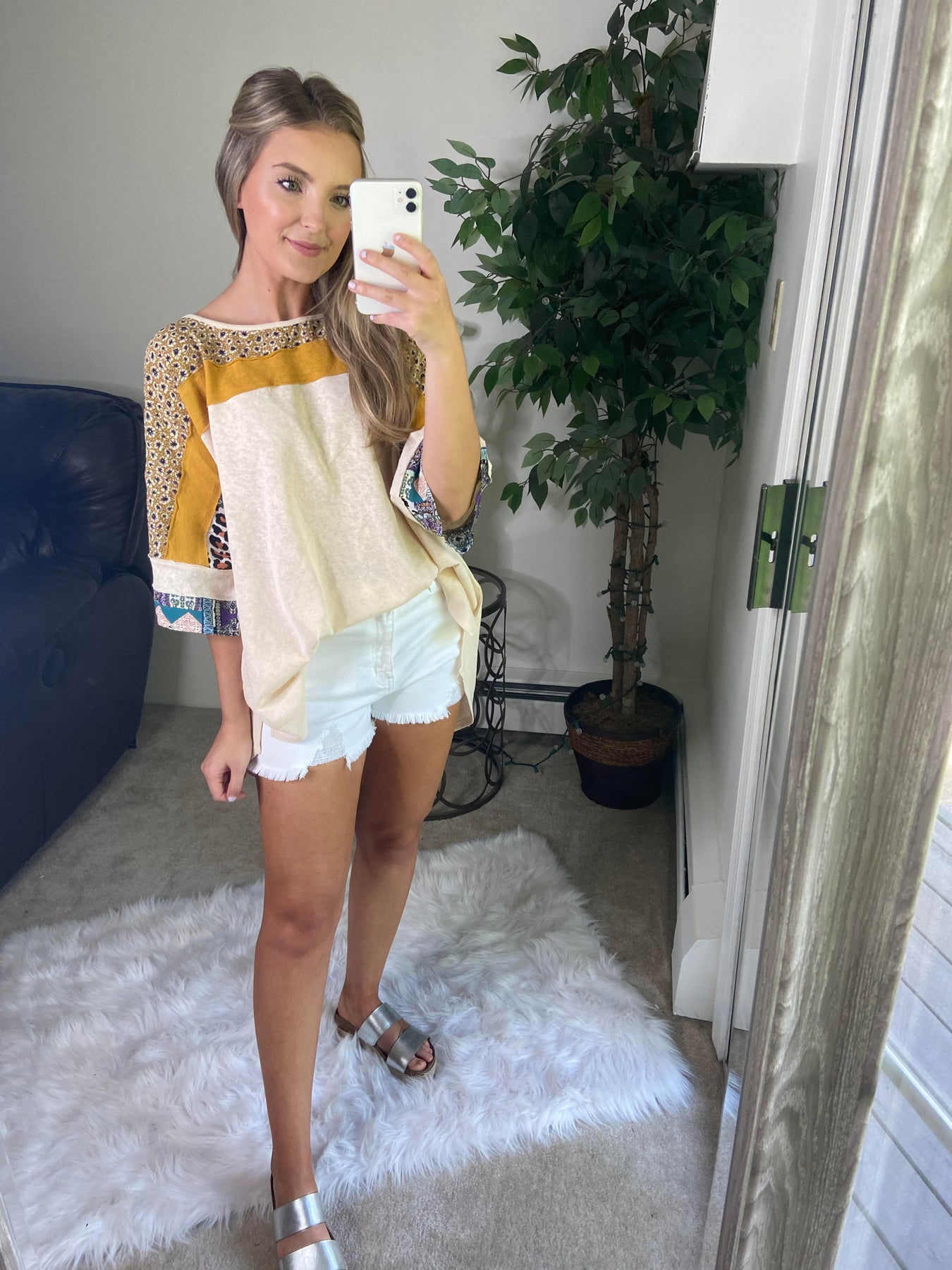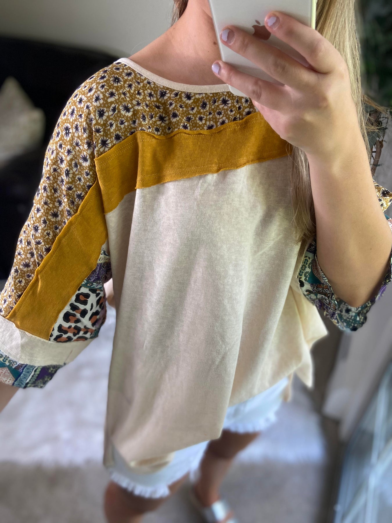 Lightweight cotton tee featuring patchwork design and an oversized fit