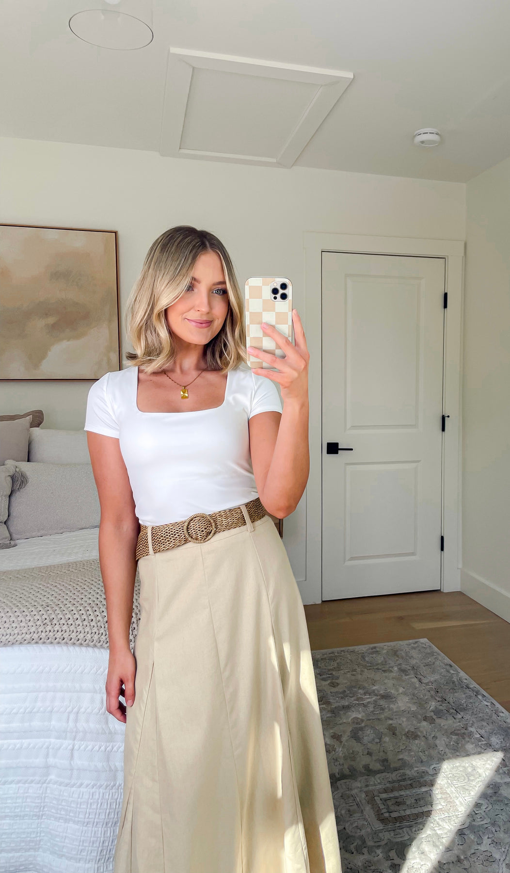 Slim fit semi cropped short sleeve top with square neckline and bra lining