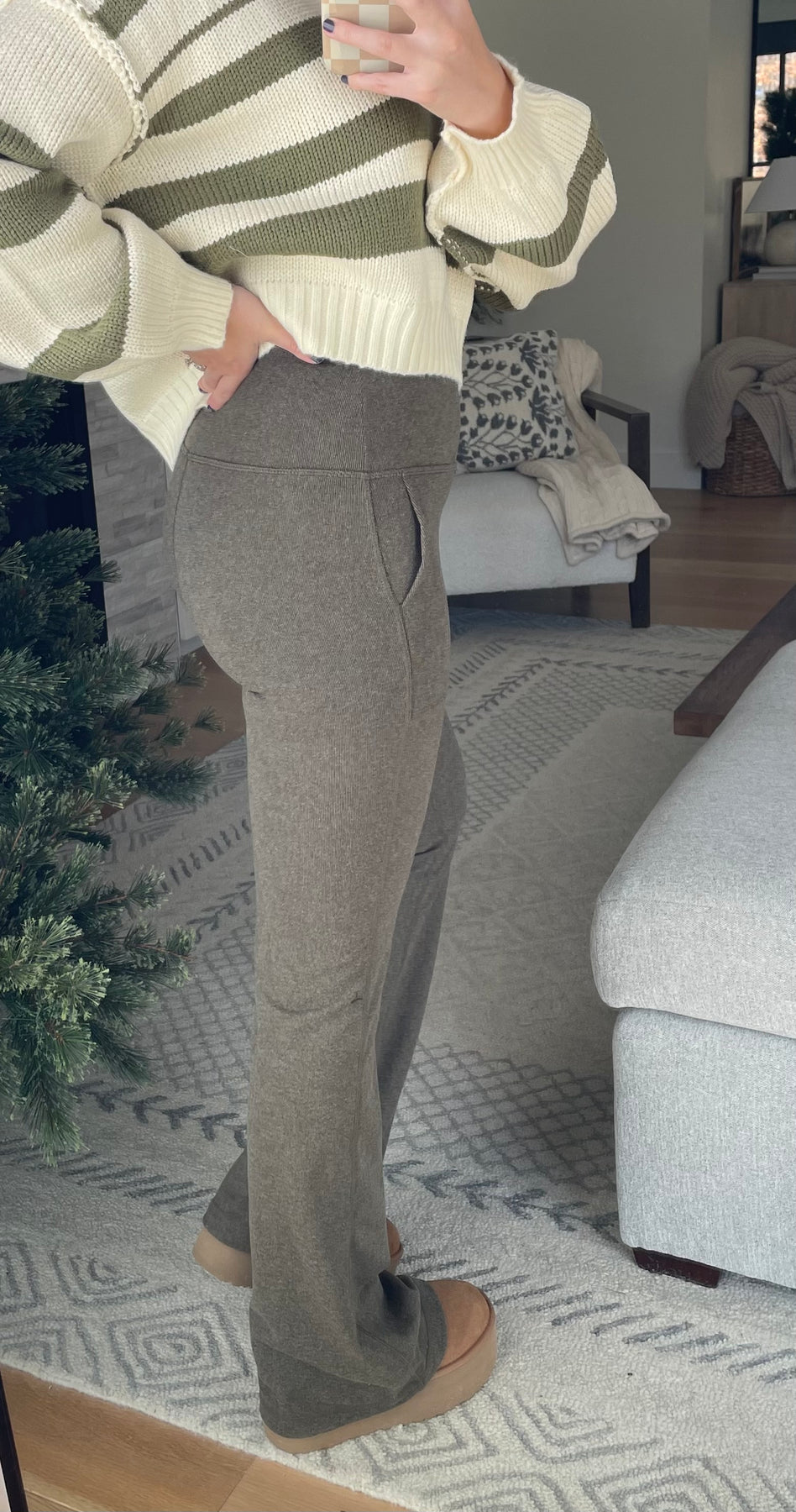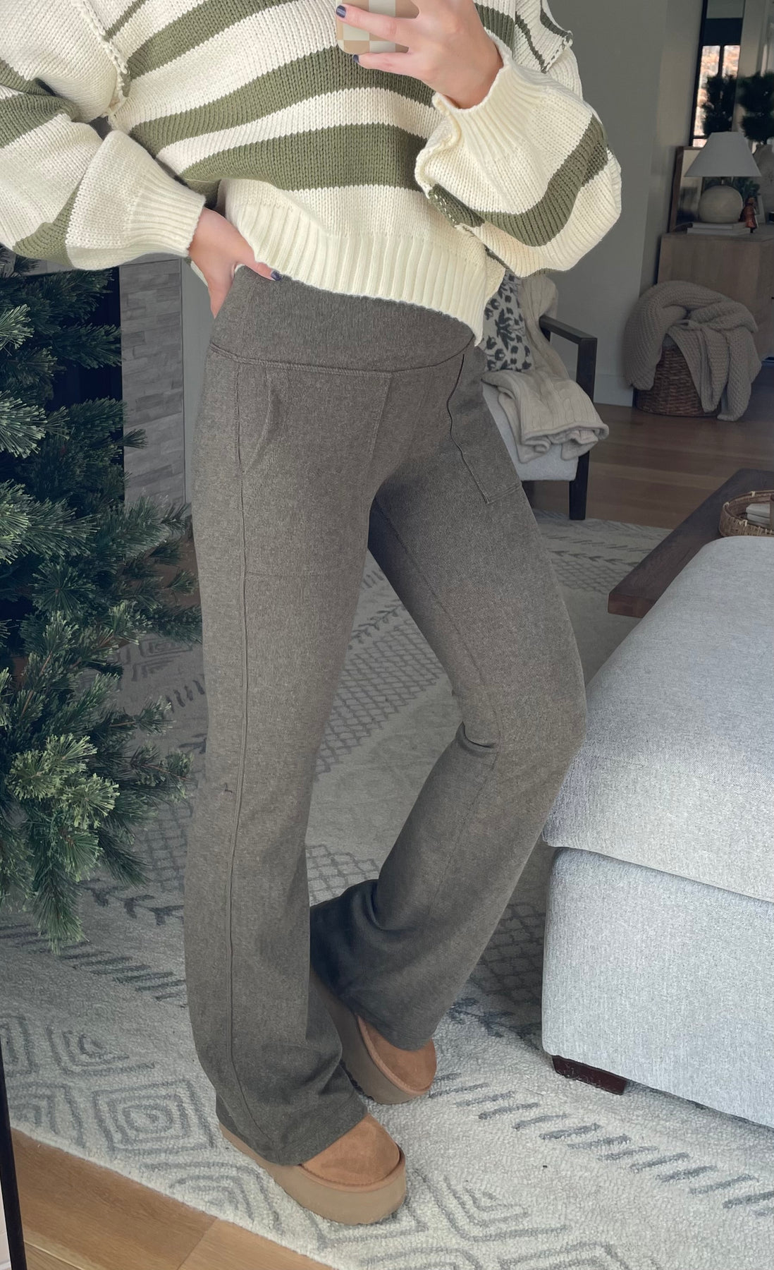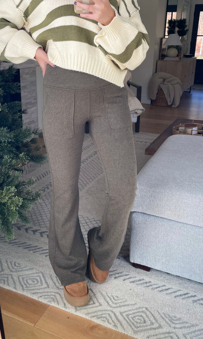 High rise brushed fine ribbed knit flare legging with front pocket detail