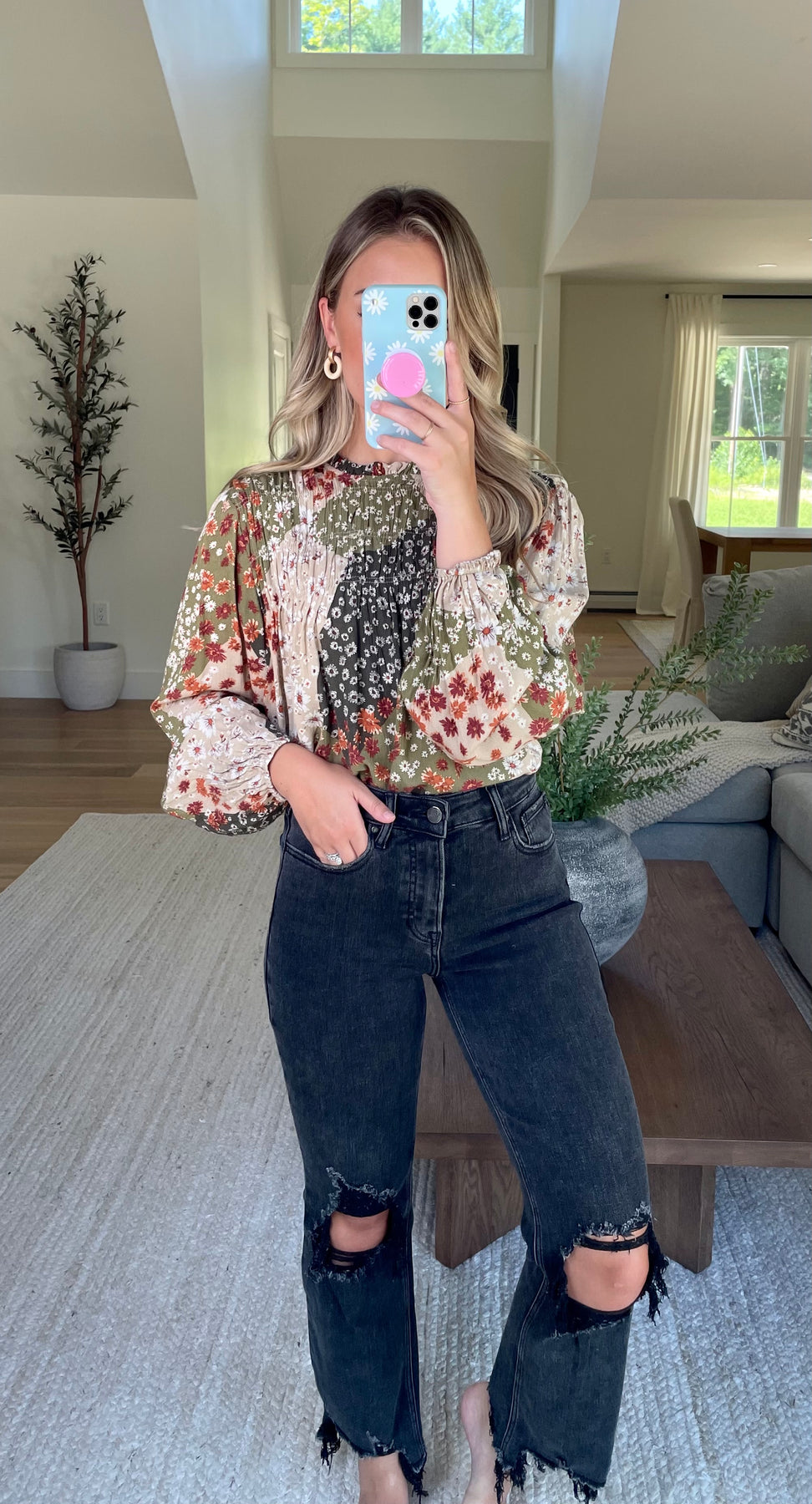 Patchwork printed long sleeve blouse with smocking detail and keyhole closure