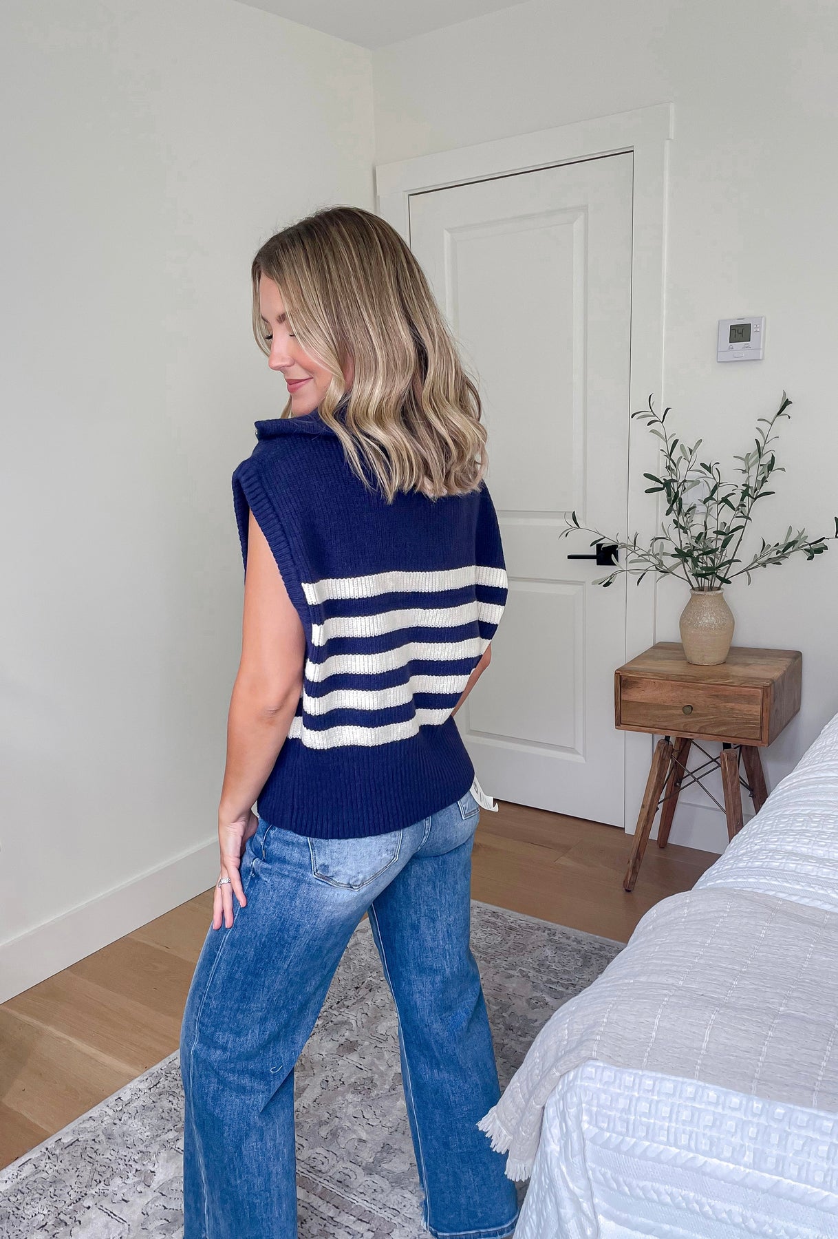 Navy and white stripe sleeveless sweater with collar neckline and functional front zipper