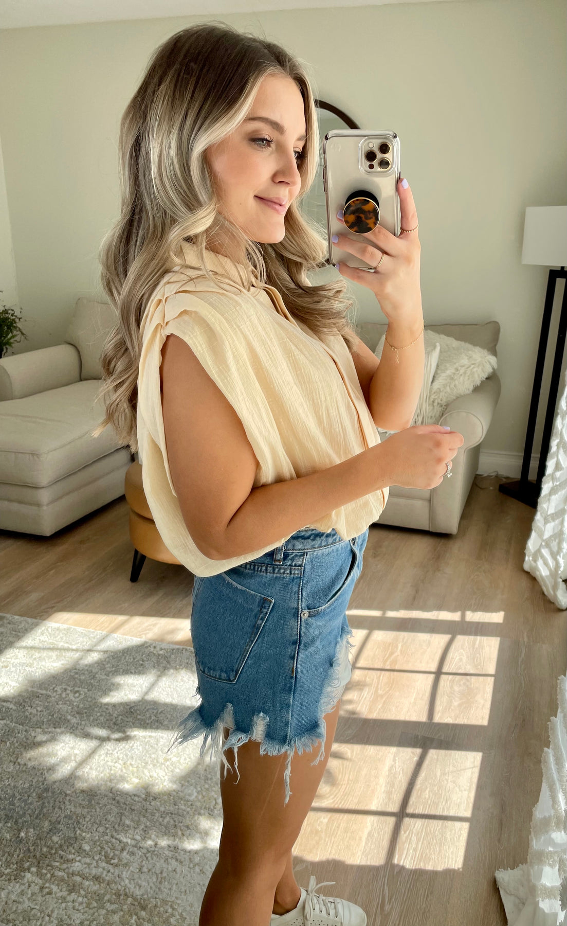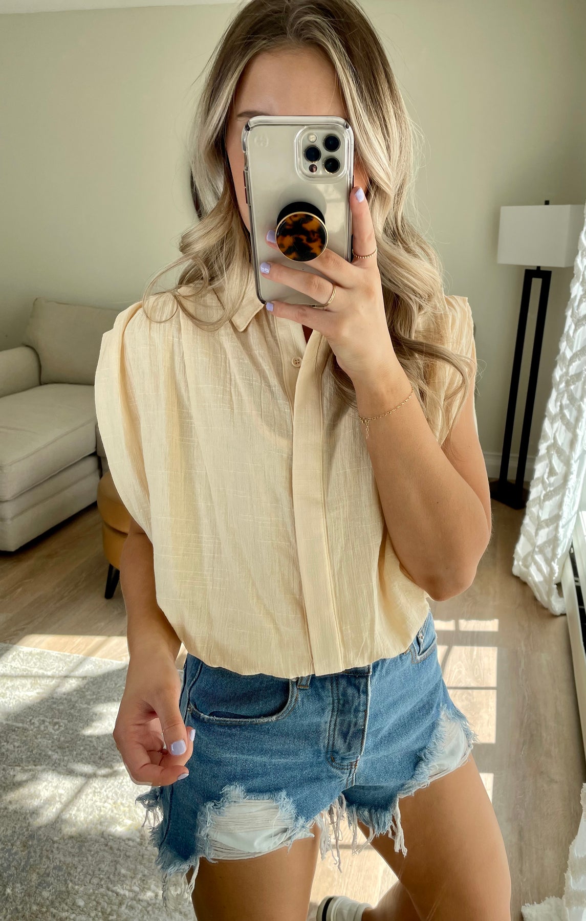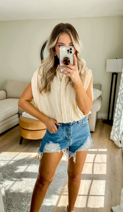 Lightweight collared top with hidden button front detail and pleated shoulder- slightly cropped with elastic waist