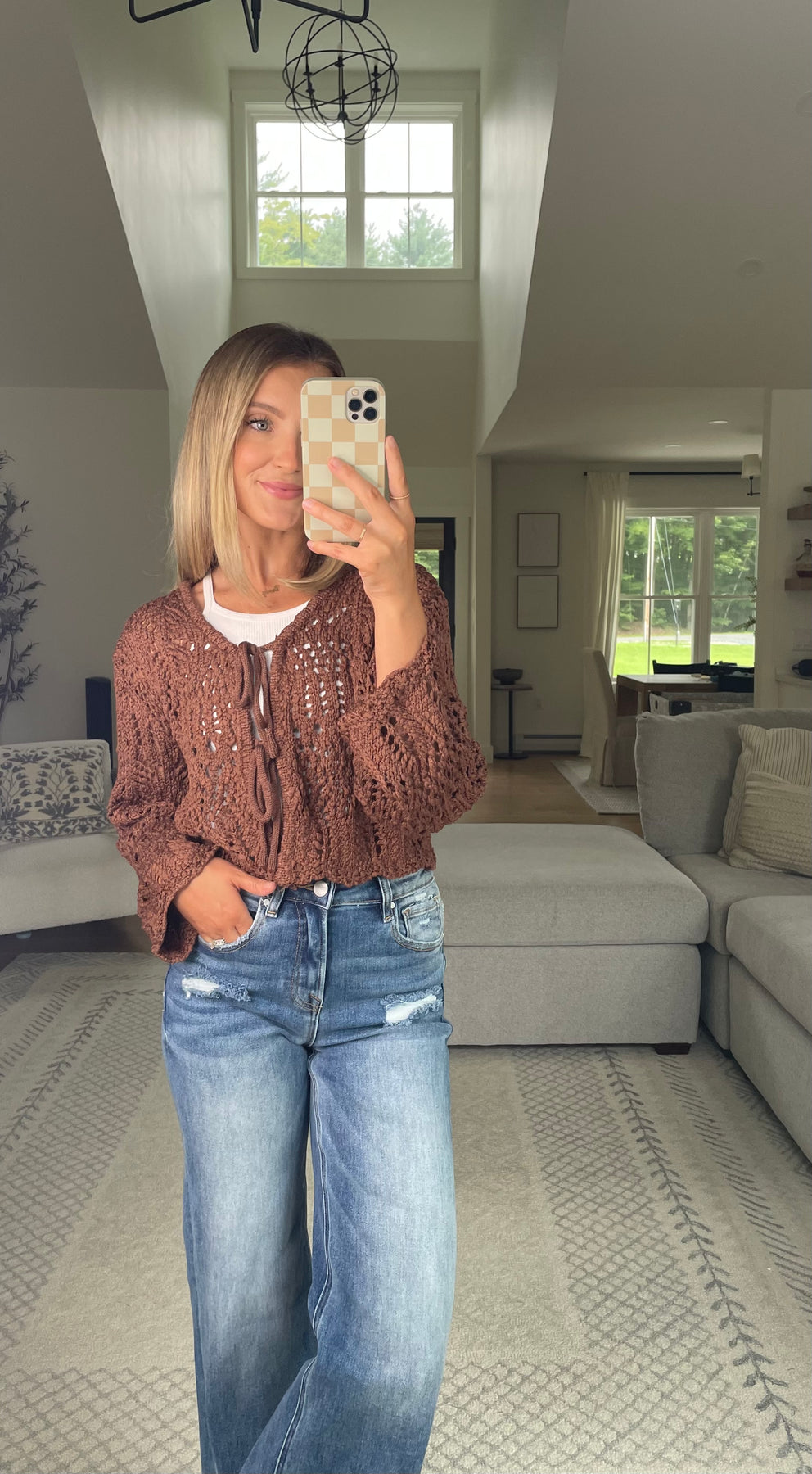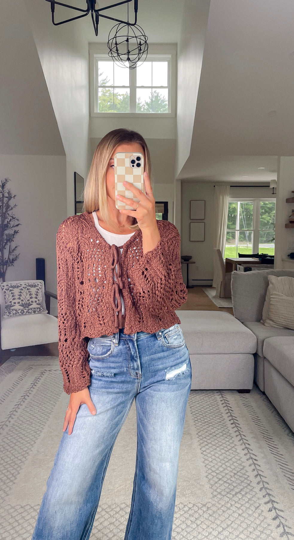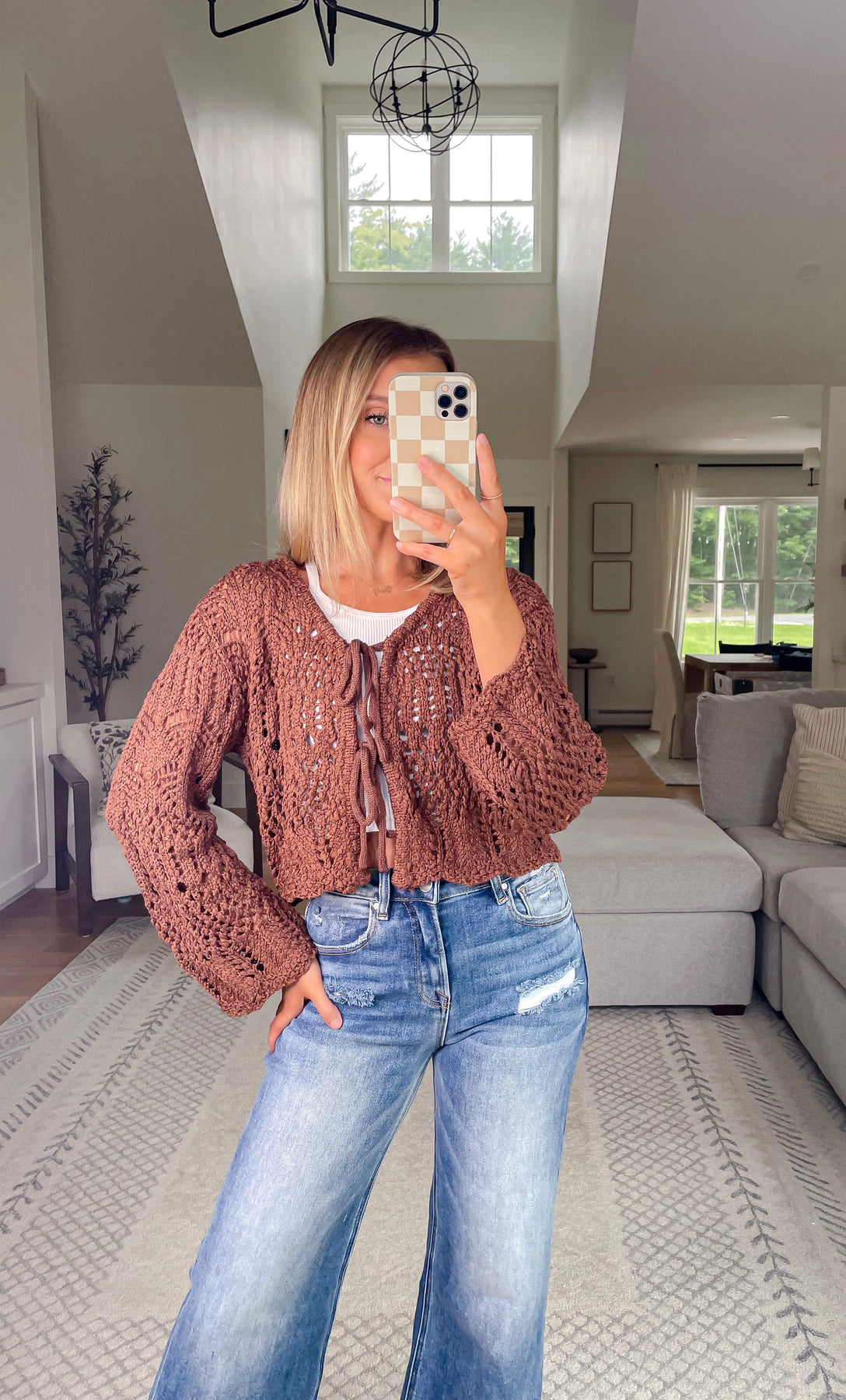 Crochet open knit cardigan with functional front tie detailing and a v-neckline