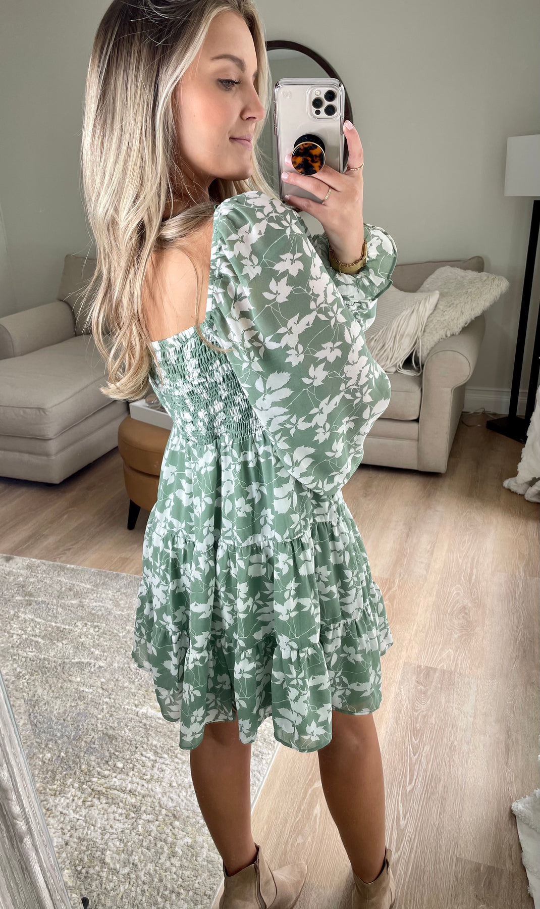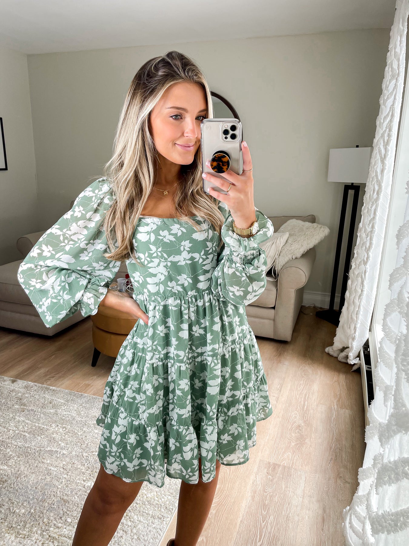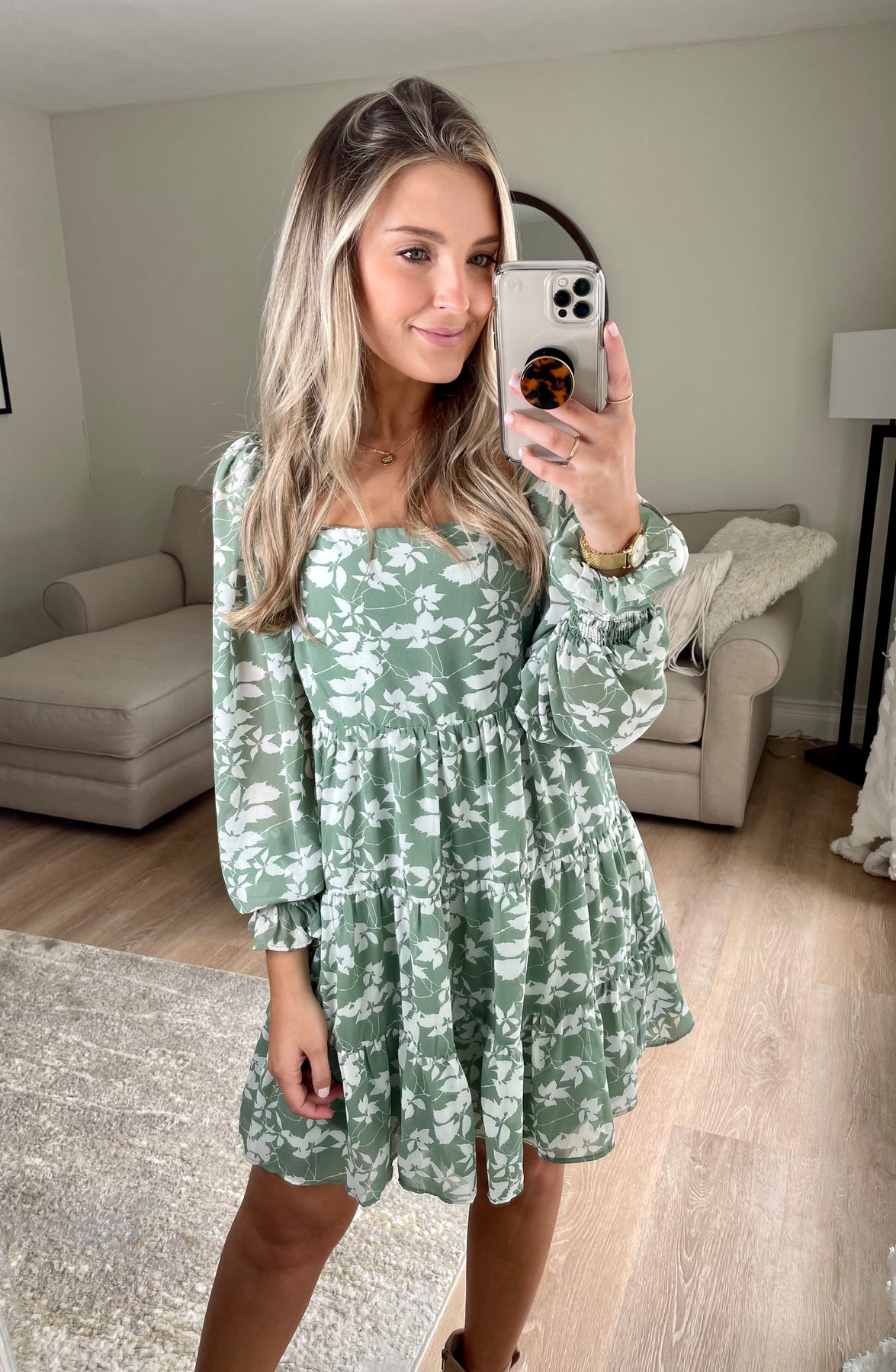 Floral print square neck dress with tiered skirt and puff sleeve with smocking detail